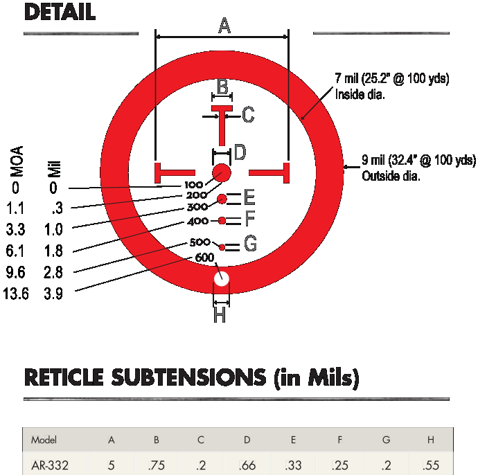 The sight came in perfect condition, but these photos were taken later after range testing, so if there are any imperfections they have to do with my use and not how it arrived. The sight measures 7.45" in length with the sunshade and lens caps installed. Without these installed, the length is 5.55" to 5.30" depending on the position of the fast focus eyepiece. The sunshade adds 1.50" inches to the length. The sight measures 3.03" in height above the Picatinny rail and total height is about 3.23". The sight has a black matte finish and the right side shows the "Burris" name in white letters. The lens caps pops open easily yet still has a nice snap when closed. The main body of the sight appears to be an aluminum forging. You can clearly see I have already had this sight mounted on top of Picatinny rail because of the marks on the mount. Both cross bolts act as recoil lugs. As the sticker shows, the sight is "Made in China." The left side shows the "Burris" name, logo and model number "AR-332". The sight come with three two-slot sections of Picatinny rail mounted at the 9, 12 and 3 o'clock positions. The objective end (left below) has a 32mm lens diameter which is represented by the last "32" in the model name AR-332. The first "3" in the model number is for the power of this optics which is 3x. This large lens and relatively low power gives an exit pupil diameter of light at just over 10mm which helps give the sight a comfortable eye box with regard to later or vertical position of your eye. The eyepiece lens measures about 28mm in diameter. Overall eye relief is advertised at 2.5" and I believe it. Personally I would have been much happier with something closer to 3.5", but I can make the 2.5" eye relief work. One of things that you will notice as soon as you take this sight out of the box is that the AR-332 is not a light weight sight. The basic sight weighed in at 15.7 ounces and 17.1 ounces with the lens caps and sunshade. To be fair, this seems to be the going weight for this style sight because the Vortex Spitfire 3x weighs in at 15.4 ounces and the Primary Arms 3x Compact Prism Scope at 16.8 ounces. In my mind, I feel that when you purchase this style of sight, you are looking for maximum durability and weight may not be the greatest concern. That being the case, I feel the weak point (if you can call it that) may be the two screws holding the base to the carry handle mount interface. In the photo below you can see the heads of the two screws that are used to mount the Picatinny rail base to the bottom of the sight and how the base interfaces with a carry handle. I didn't remove my screws because they seemed very tight and they have some type of thread locking compound according to the Users Guide. You can also see there is a hole down the mount to allow you to use your iron sights if needed (I didn't verify). Both of the cross bolts in the Picatinny mount act as recoil lugs with their square shape on the body of the bolt. A single clamp bar is used and you can see the nuts have a hole which could be used for safety wire after torqueing if desired. The ends of the clamp bar bolts are flared open so that the clamp bar nuts will not fall off if loosened too much. This is something that I think should be standard on all clamp bar bolts and something I would expect from a manufacturer like Burris. The sight comes with a single Allen wrench which fits the screws holding the three Picatinny rail segments in place. I removed one rail segment and the screws were installed with some type of thread locking compound. If you wanted to reduce the weight, you could remove all three segments for a total reduction of 0.9 ounces. My guess is that most people will keep the rail segments installed so they can piggyback something on this sight in the future and the weight savings is not significant. The eyepiece has a fast focus ring. Changing focus was stiff on my sight, but I consider that a good thing. I was able to obtain a very sharp reticle image. On the bottom of the eyepiece housing is the serial number for the sight. The sight comes with a rotary illumination knob and you can see that the knob is marked with the off positions at "0" and numbers in red or green indicating red or green illumination intensity levels of 1 through 5 with 5 being the highest. These next photos show the knob rotates 180 degrees. I wish Burris would have configured the sight so that you could rotate the knob from "0" to 1, 2, 3... on each side. I found that the 5 intensity level is very bright and in most cases you will probably use the 1 or 2 setting for either red or green illumination. The sight has a standard style battery cover that can be removed using a coin. The cover has an O-ring to seal the compartment and the sight uses the standard CR2032 battery. I didn't check battery life myself, but the specs say the battery "delivers 200 hours of life at the highest power settings, and approximately 500 hours at medium settings." The sight comes with the Ballistic CQTM reticle shown below. The details of the reticle are relatively small and they look better when looking through the sight than in the photo on the left. I zoomed in with my camera and the photo on the right does a much better job at showing these details. This image below was taken from the Burris website and shows the hold over and subtension details for this sight. Burris does not give much detail on the ammunition used for determining these drop levels other than stating "the Ballistic CQ™ reticle features holdover dots are good out to 600 yards and work best with 5.56 or 7.62 ammunition." Because of this, I feel these values are a general average and the right thing to do is chronograph the ammunition you plan to shoot and using some type of ballistics program determine yourself what the dots represent. These next photos show the intensity level for each illumination color. I tried my best to capture the true changes in illumination level with m