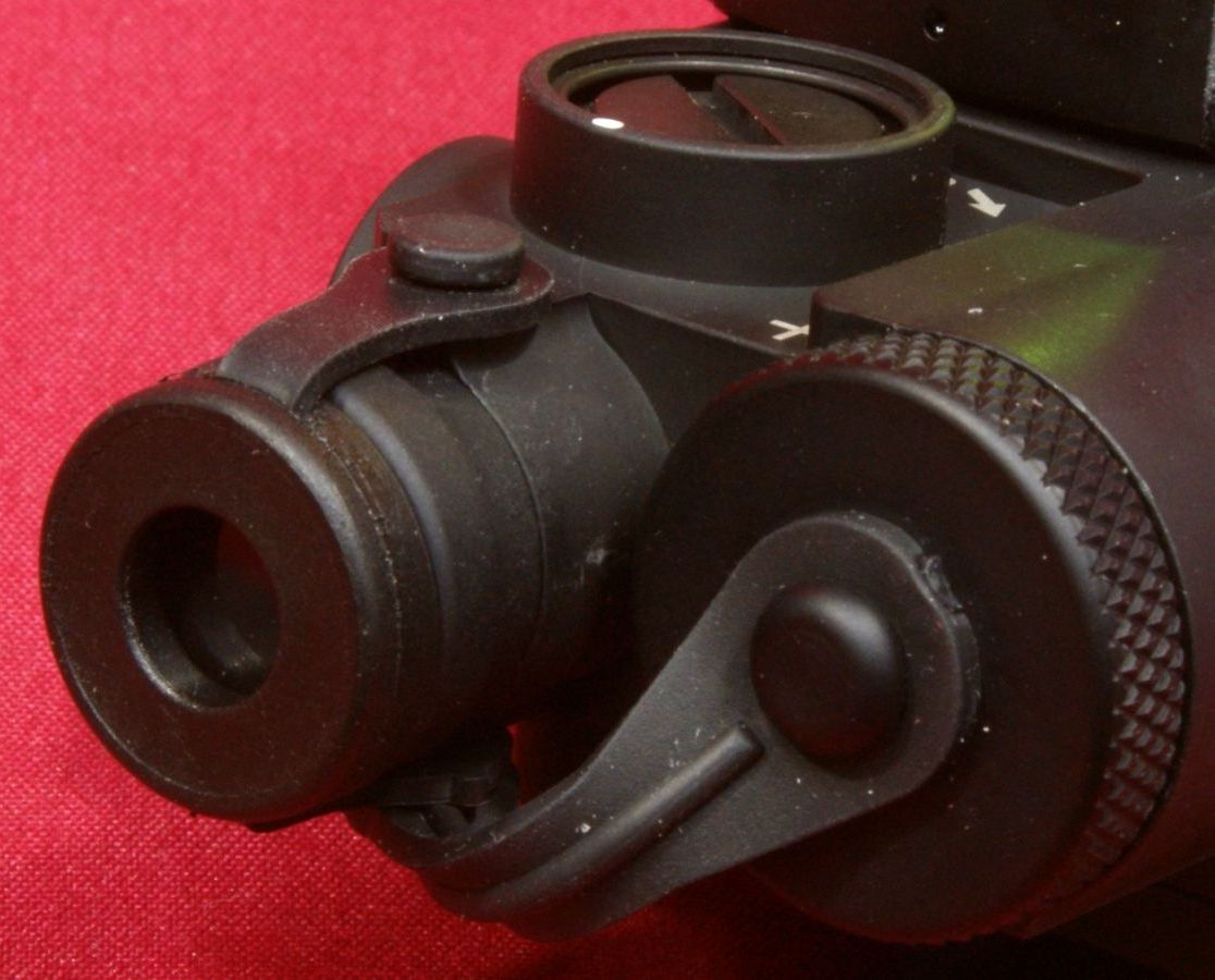 One of my first impressions of this AR-FFL FastFire III & laser combination was that it seems to be well built and solid. The total length of the unit measured 4.16" including the FastFire III hood and laser cap. The unit measured 3.72" in length with the hood and cap removed. The laser body is made from 6061-T6 aluminum alloy and comes Type III Hardcoat Anodized. The laser and FastFire III weighed in at 7.5 ounces with batteries installed. If you include the weight of the hood and remote cable, the system combined weight is 8.45 ounces. The unit measured 1.89" in total width when you include the rail mount and 1.73" just across the body of the laser. The centerline of the laser and FastFire III measures to be offset ~0.75" from the center of the rail. The laser Activation Mode Selector Switch (AMSS) has three positions; OFF, LOW and HI. In the "LOW" position, the laser is activated in low power when the remote cable switch or integrated momentary activation (FIRE) switch is depressed. The photo below shows a blue screw in place that acts as a safety to prevent the AMSS from switching to the "HI" position. This screw must be removed to operate on "HI". The laser power is specified to be <1mW on the "LOW" setting and <5mW on the "HI" setting. Below the blue screw is a green LED indicator light. This light will be on whenever the laser is in operation (actually projecting a beam). When the LED blinks, this indicates an extremely low battery condition and the laser will continue to operate for only approximately 20 minutes, so the battery needs to be changed immediately. The hole in the rear of the laser body located on the left side is for the remote operation switch. The front of the laser has an Exit Port Cover (lens cap) which protects the laser lens and blocks the emission of laser energy from being emitted from an operating unit.