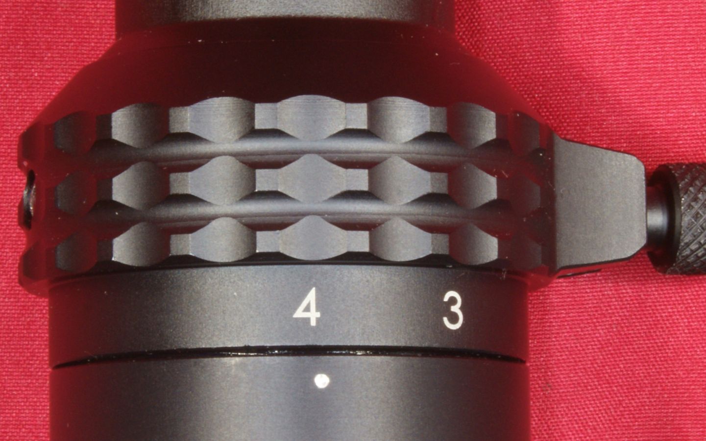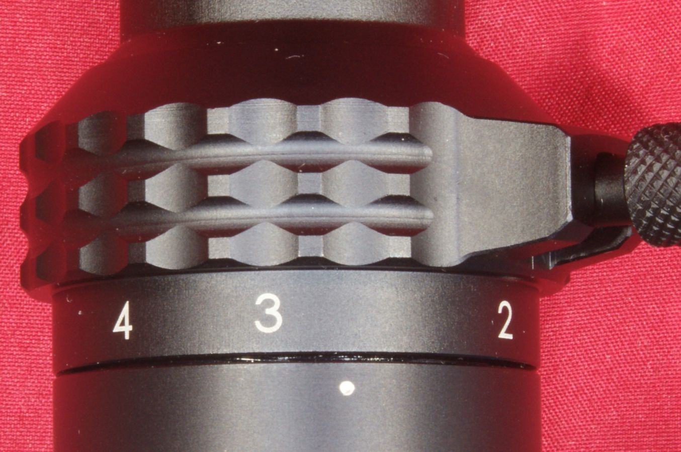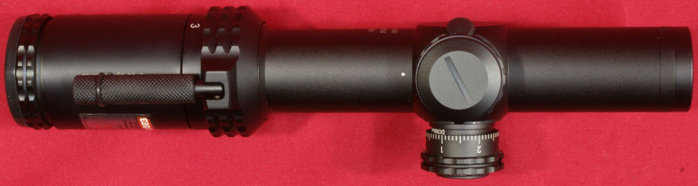 The lens caps have a very snug fit over the scope objective and ocular ends and easily stay in place even without the bungee cord. With the bungee cord, these caps are sure to stay in place on the scope. The scope has a nicely applied matte black anodized finish on the aluminum body. The scope comes with target style elevation and windage turret caps that are configured to 0.1 MIL per click. The scope also includes an illumination knob on the left and the Power Change Lever (PCL) attached to the power adjustment ring. With the fast focus eyepiece screwed all the way inside the ocular housing, the scope measured about 9.4" in length. It has taken me years to become comfortable with the looks of the 1-4x power scopes because the lack of the larger objective lens always makes me think I'm only getting half a scope. After finally getting over that issue, I can now appreciate the functionality of this style scope along with the reduction in weight. For the Bushnell AR Optics line of scopes, I think the sculpting on the turret caps, power adjustment ring and fast focus eyepiece give the scope attractive styling while at the same time some gripping texture when making adjustments. From the front of the scope to the location where the ocular housing starts to flare out measured 5.75" and I believe this is what Bushnell refers to as the Mounting Length. The scope with battery weighed in at 18.05 ounces which is slightly higher than the 17.3 advertised. The ocular or eyepiece end of the scope measures 42mm on the housing and 42.3mm on the fast focus eyepiece ridges. The edge of the fast focus eyepiece has a stiff rubber ring to provide a little cushion in the event of an eye socket strike. The Power Change Lever (PCL) is hinged so that it will ride close to the body of the scope when not in use. There is also a rubber O-ring around the lever to prevent the lever from scratching the scope. When you flip the PCL out, it is very easy to grip for shifting power settings. The photo below shows the power ring set at 1x. There is about a 185 degree throw of the PCL to switch from 1x to 4x power. Initially, I thought this lever may seem awkward sticking out like it does, but after a couple of minutes doing drill switching from 1x to 4x using my free hand, I can see that the lever is a big benefit when swapping from 1x close quarters to 4x longer distances. The power adjustment ring has markings at 1, 2, 3 and 4 power as shown below. The body of the ocular housing has a white dot for reference so you know where to turn the power ring if you want a mid power setting. The fast focus eyepiece has 1.25 turns from fully in to fully out and has firm resistance while rotating the eyepiece. The slight tint on the lens is evidence that the lenses are coated. Bushnell states the lenses are "Fully multi-coated optics: All air-to-glass surfaces feature multiple layers of anti-reflective coating. Fully multi-coated optical systems deliver the brightest, highest-contrast images with the least amount of eye strain because only a very small percentage of light is lost before it reaches the viewer's eye." I found the scope to be clear and bright with vivid colors. Considering the price and other features, the optical quality seems to be a good value. The specifications state the eye relief to be about 3.6". I found it to be more like 3.26" at 1x power and 2.94" at 4x power. Some of the difference in my measurements versus the specifications is that I don't consider a good cheek weld to be one that puts the eye on the maximum edge of the eye relief zone. Hence, I consider the eye relief to be slightly shorter. There is also error in my methods since I'm scaling photos for my measurements. To keep the numbers simple, I think the eye relief is about 3.3" to 2.9".
