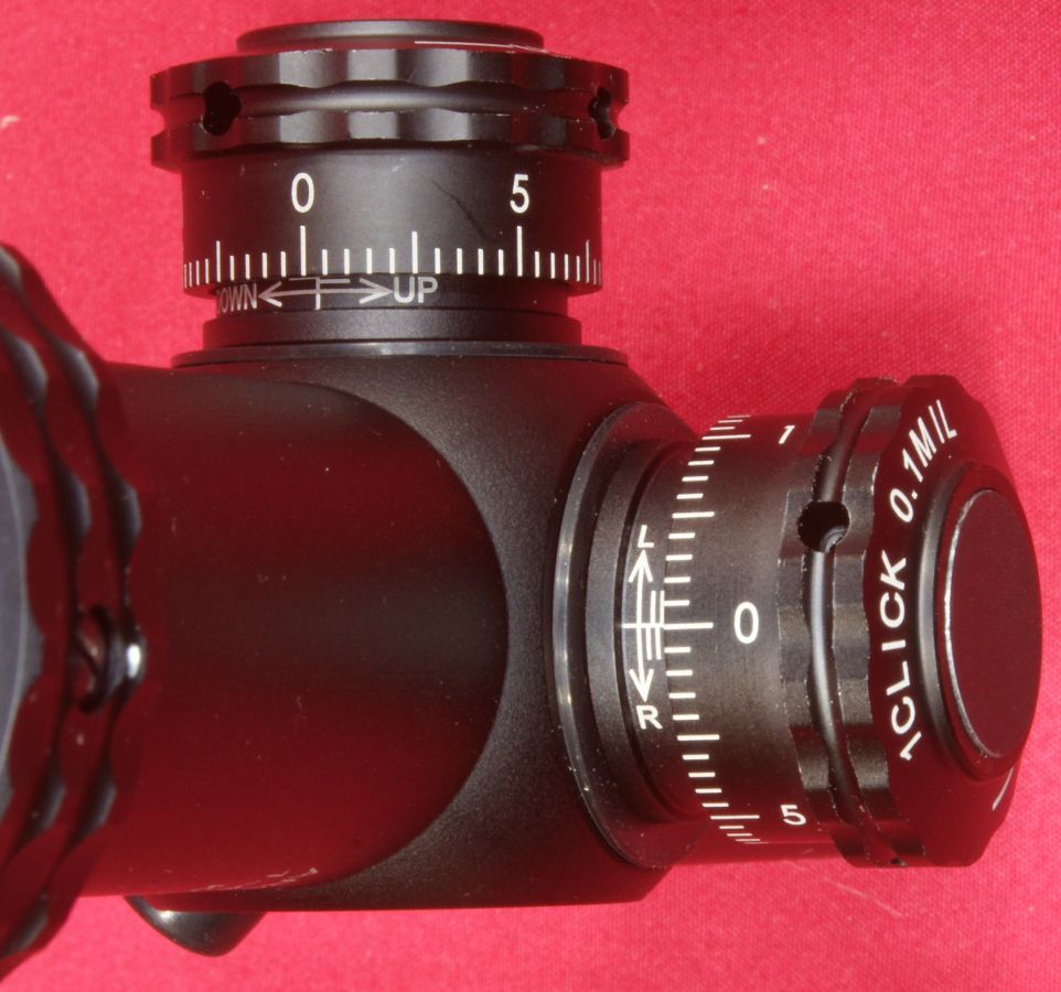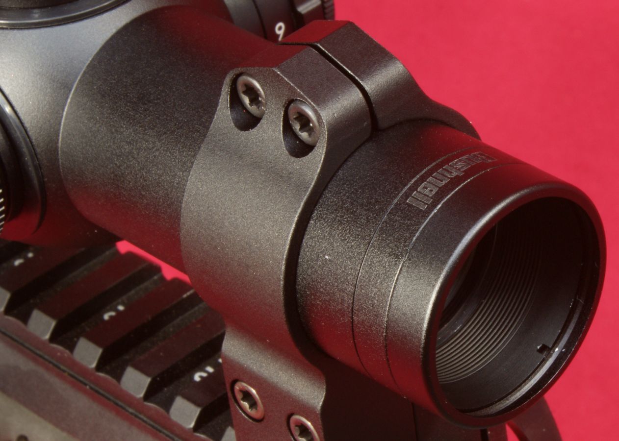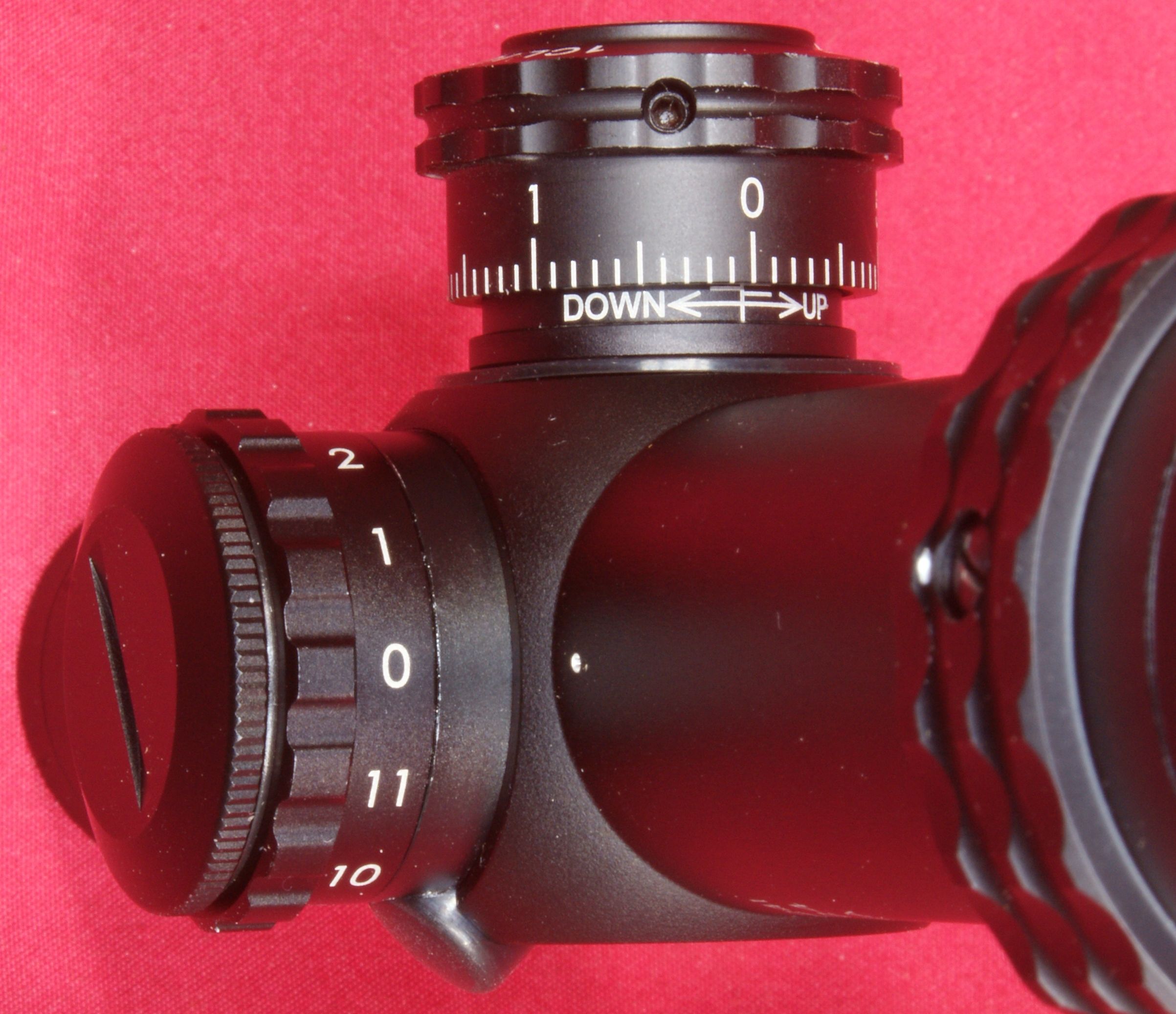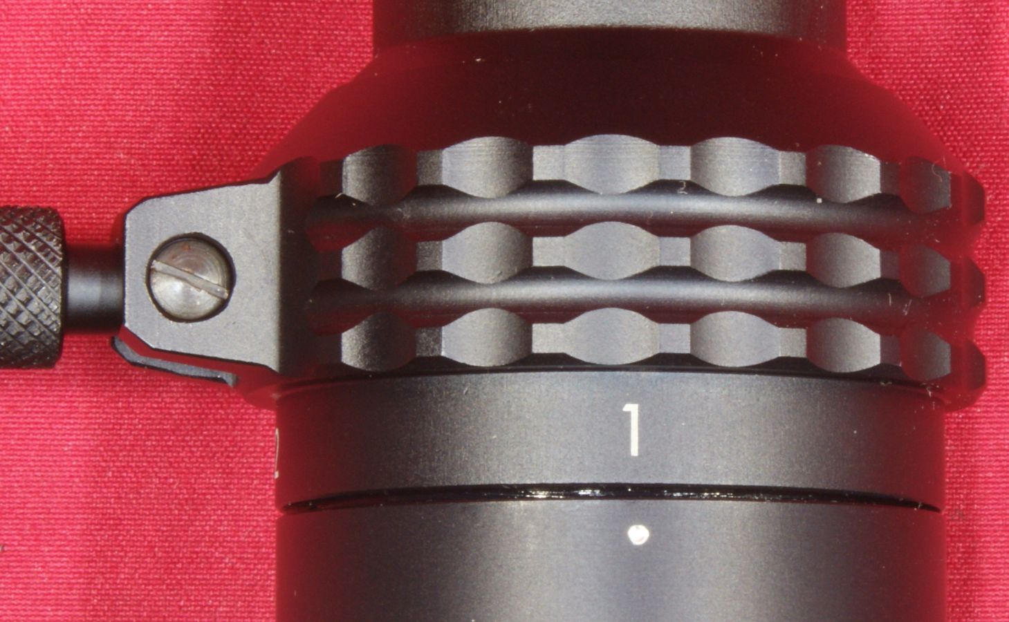 The lens caps have a very snug fit over the scope objective and ocular ends and easily stay in place even without the bungee cord. With the bungee cord, these caps are sure to stay in place on the scope. The scope has a nicely applied matte black anodized finish on the aluminum body. The scope comes with target style elevation and windage turret caps that are configured to 0.1 MIL per click. The scope also includes an illumination knob on the left and the Power Change Lever (PCL) attached to the power adjustment ring. With the fast focus eyepiece screwed all the way inside the ocular housing, the scope measured about 9.4" in length. It has taken me years to become comfortable with the looks of the 1-4x power scopes because the lack of the larger objective lens always makes me think I'm only getting half a scope. After finally getting over that issue, I can now appreciate the functionality of this style scope along with the reduction in weight. For the Bushnell AR Optics line of scopes, I think the sculpting on the turret caps, power adjustment ring and fast focus eyepiece give the scope attractive styling while at the same time some gripping texture when making adjustments. From the front of the scope to the location where the ocular housing starts to flare out measured 5.75" and I believe this is what Bushnell refers to as the Mounting Length. The scope with battery weighed in at 18.05 ounces which is slightly higher than the 17.3 advertised. The ocular or eyepiece end of the scope measures 42mm on the housing and 42.3mm on the fast focus eyepiece ridges. The edge of the fast focus eyepiece has a stiff rubber ring to provide a little cushion in the event of an eye socket strike. The Power Change Lever (PCL) is hinged so that it will ride close to the body of the scope when not in use. There is also a rubber O-ring around the lever to prevent the lever from scratching the scope. When you flip the PCL out, it is very easy to grip for shifting power settings. The photo below shows the power ring set at 1x. There is about a 185 degree throw of the PCL to switch from 1x to 4x power. Initially, I thought this lever may seem awkward sticking out like it does, but after a couple of minutes doing drill switching from 1x to 4x using my free hand, I can see that the lever is a big benefit when swapping from 1x close quarters to 4x longer distances. The power adjustment ring has markings at 1, 2, 3 and 4 power as shown below. The body of the ocular housing has a white dot for reference so you know where to turn the power ring if you want a mid power setting. The fast focus eyepiece has 1.25 turns from fully in to fully out and has firm resistance while rotating the eyepiece. The slight tint on the lens is evidence that the lenses are coated. Bushnell states the lenses are "Fully multi-coated optics: All air-to-glass surfaces feature multiple layers of anti-reflective coating. Fully multi-coated optical systems deliver the brightest, highest-contrast images with the least amount of eye strain because only a very small percentage of light is lost before it reaches the viewer's eye." I found the scope to be clear and bright with vivid colors. Considering the price and other features, the optical quality seems to be a good value. The specifications state the eye relief to be about 3.6". I found it to be more like 3.26" at 1x power and 2.94" at 4x power. Some of the difference in my measurements versus the specifications is that I don't consider a good cheek weld to be one that puts the eye on the maximum edge of the eye relief zone. Hence, I consider the eye relief to be slightly shorter. There is also error in my methods since I'm scaling photos for my measurements. To keep the numbers simple, I think the eye relief is about 3.3" to 2.9".