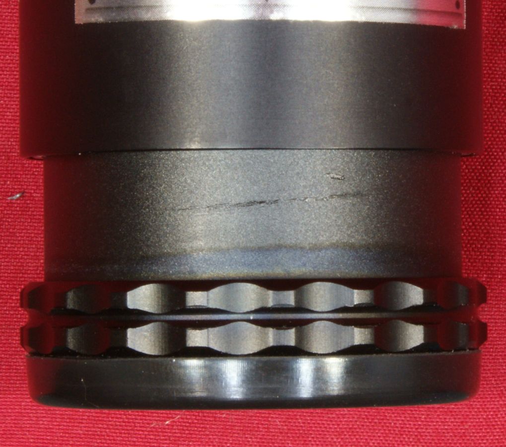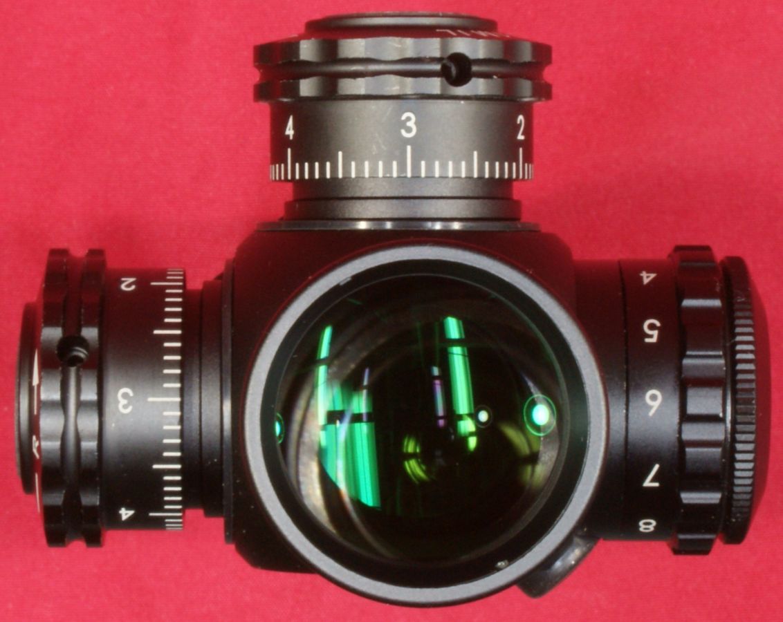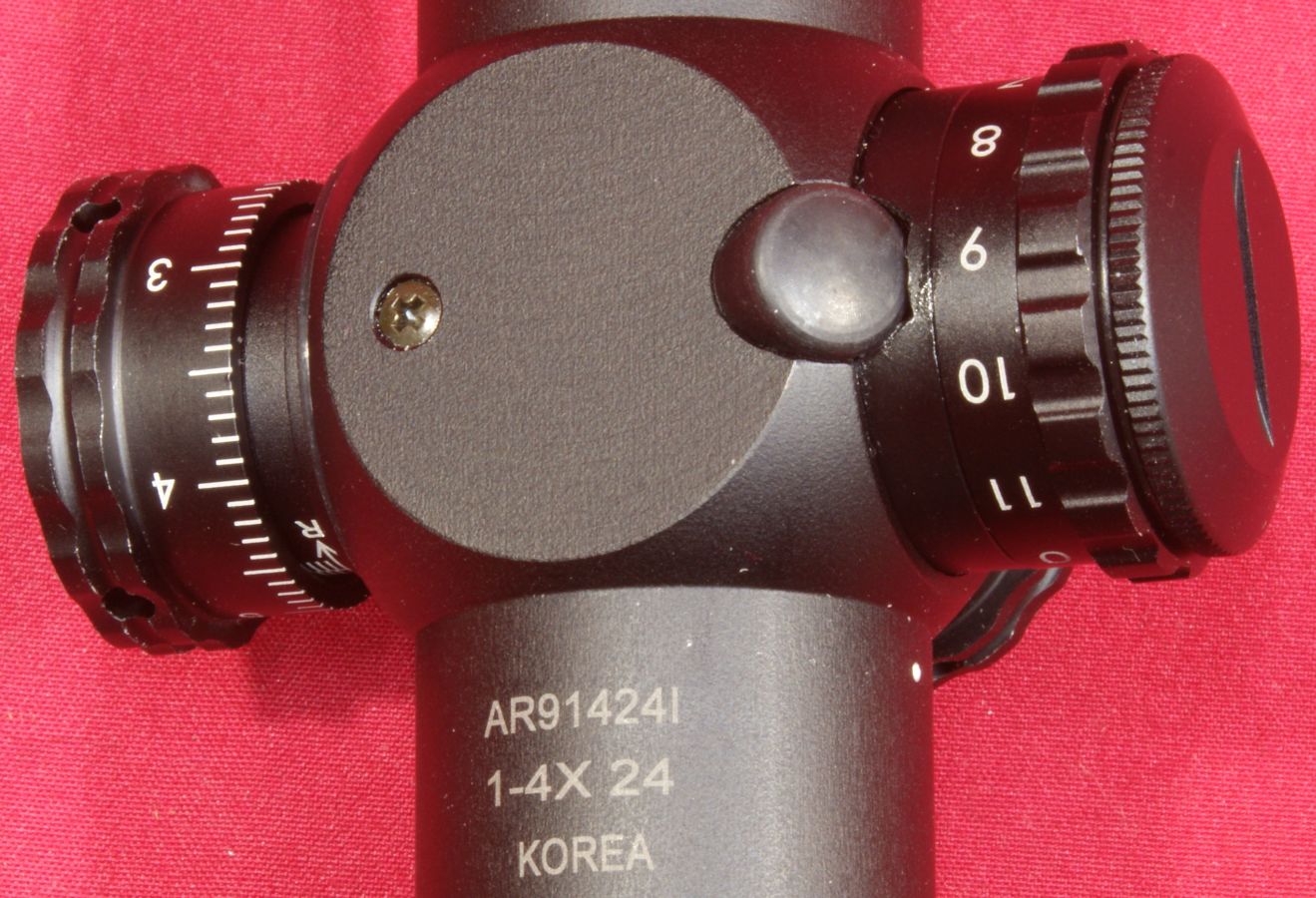Figure 23 - Eye Relief ~2.9" at 4x Power The outside diameter of the objective end is the same as the tube diameter and measured 29.9mm which is basically a 30mm tube. Inside the front of the tube is a 24mm objective lens. At 4x power, the 24mm lens give you an exit pupil diameter of about 6mm which provides a good amount of light to your eye. There is a ring at the front of the scope with the blackened "Bushnell" name on the top and bottom. This photo below just gives you a look at the scope from the front end. The scope comes with target style turret caps that are marked with 0.1 mil increments for a total of 6 mils of adjustment per revolution. For those more familiar with MOA style scopes, 1 mil = 3.4377" of movement at 100 yards. This means there is an equivalent 20.63" of adjustment per revolution at 100 yards. The turret bodies are marked with the direction to turn the caps to produce a desired change in bullet impact. They are also marked with hash marks so you can keep up with full revolution turns. The windage adjustment knob was able to turn a total of 64 mils of travel. This equates to about 220 inches of total potential travel at 100 yards. This doesn't mean that you will get this much total adjustment, it just means that knob can turn that much. The specifications state an adjustment travel of ±60 inches (120" total). The knobs turn with very distinctive clicks and seems to have a little backlash (looseness) when in position. The elevation adjustment knob could turn a total of 65 mils of travel. Again, this equates to about 223 inches of total potential travel at 100 yards but the specs say only about 120". Each cap is marked with the amount of adjustment per click, 0.1 mil = 0.34". The caps are also marked with the direction to turn to produce a change in bullet impact. The turret caps can be removed by loosening the three set screws on each cap. The turret housing has an O-ring between the housing and cap that provides a waterproof seal. The upper O-ring on the turret body is to eliminate water from coming through the set screw holes into the turret housing. One feature worth noting is that there are no grooves inside the turret cap or on the turret body. Typically these grooves are used to index the cap on the body. For this scope, the three set screws provide clamping force so the cap and body rotate together. The advantage to this design is that the cap is infinitely adjustable so that when you re-zero your cap, the zero mark on the cap can line up perfectly with the reference mark on the housing. The down side is that if your set screws work loose, you could get your cap to rotate on the turret body and may lose your zero reference. With three set screws, the chances are low that this will happen, but make sure you tighten them properly. The caps appear to be made from aluminum alloy. On the left side of the scope is an illumination knob. There are 11 different illumination settings with 1 being the lowest and 11 being the brightest. As you shift the knob between illumination settings, the illumination feature is turned off at the mid point between settings. There is no click to hold the knob at this mid point, but this knob did have enough turning resistance so that it would stay in the mid position. The range of intensity of the illumination seemed to be good with the 1 setting being barely visible in low light and the 11 setting being too much in low light. In brighter light, the 11 setting was easily visible which is important because at 1x power I consider this scope to function more like a red dot scope. Like most illuminated scopes, the illumination knob has an O-ring sealed cap that can be removed using a coin to allow you to replace the CR2032 battery. The bottom of the scope is marked with the model number "AR91424I", power range and objective lens size "1-4X 24" and location of manufacturer "KOREA". You can also see the rubbery port cap under the illumination knob that is used for purging the scope. When you look at the reticle at 1x power, you need to understand that using this scope on 1x will be similar to using a red dot scope. With normal human eyes, it is extremely difficult to use the bullet drop compensation features. Also, picking out the non-illuminated reticle with a highly contrasted or dark background can be difficult. With the illumination turned on, the reticle becomes immediately visible. The two photos below give you a pretty good idea on what I'm describing, but the photo with the reticle illuminated doesn't look nearly as bright in the photo as that when looking through the scope. Also, you need to get your eyes about 6" from the computer screen to get a better feel for the scale of the view that you would get by looking through the scope. I also want to point out that my basement wall (the background) is only about 4 feet from the scope and at 1x the image is very clear and in focus. Although it is not visible in these photos, I was able to figure out that the scope is not truly 1x when dialed to its lowest power setting. After taking some basic measurements, I believe the scope is actually about 1.15x at the lowest setting. As a note, it is typical for manufacturers to round up or down their advertised power settings. These next two photos show the scope at 4x power and you can easily see that the bullet drop features of the BTR-1 reticle are now usable. As I zoomed into 4x power, the background being so close the the scope actually went out of focus and is blurred slightly. The minimum focal distance for my eyes at 4x power seems to be about 50 feet. Since there is no parallax adjustment (side focus) on this scope, parallax is probably adjusted to be minimum error at 100 yards which is typical for most centerfire riflescopes without adjustment capabilities. Bushnell state the following about the reticle: Scopes with the BTR (Bushnell Tactical Reticle) are designed to be sighted-in at 100 yards, with aiming points every 100 yards, out 