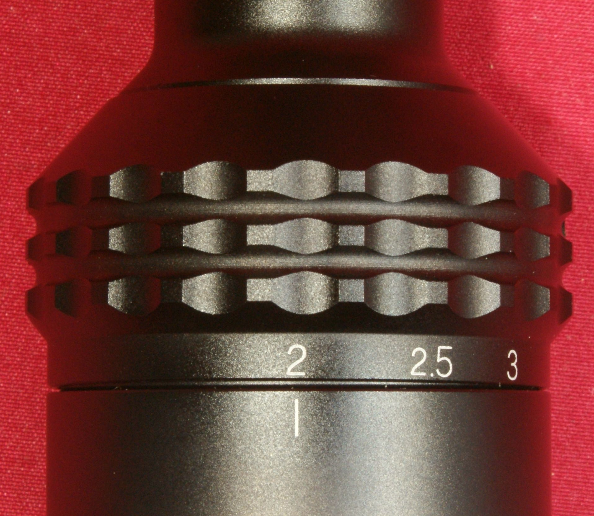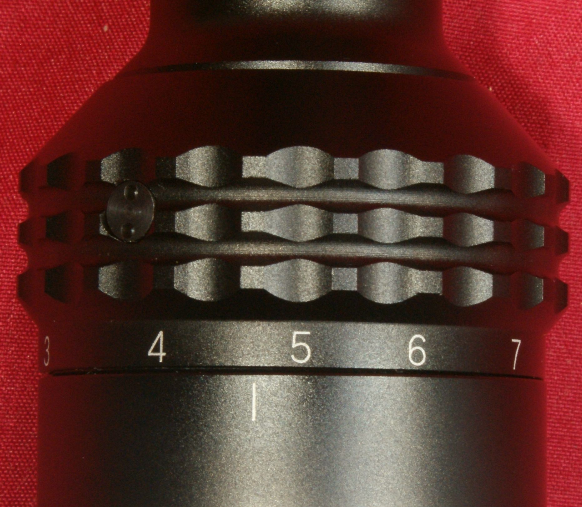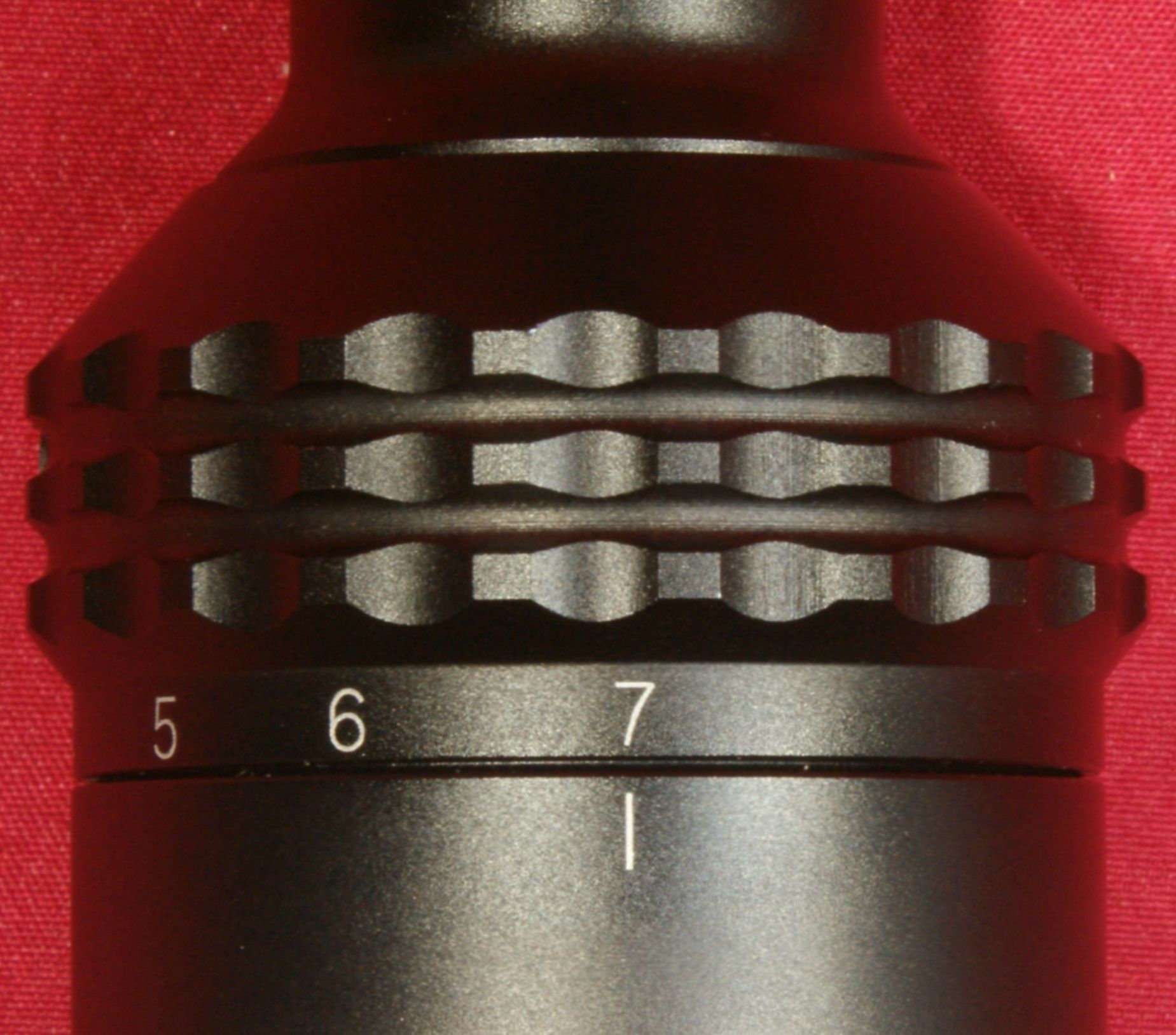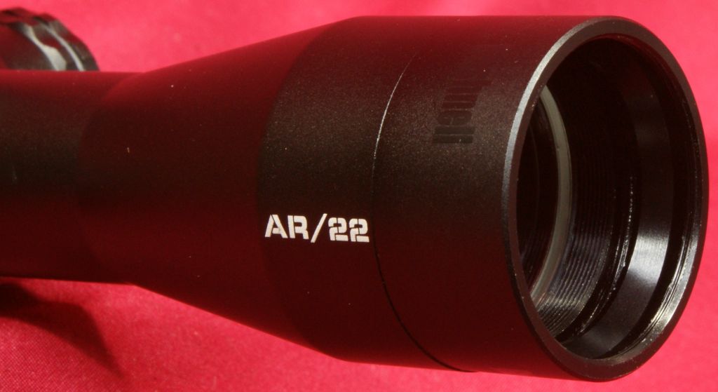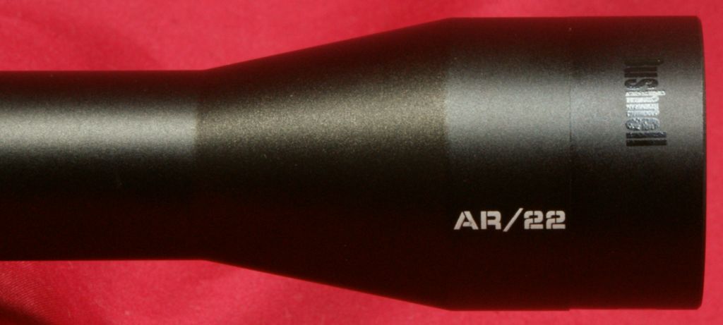 The Bushnell AR/22 Scope has a 1" one piece tube construction and comes in a black matte finish. My first impression of the scope was that it seemed like a quality product and has a very target/tactical look by having the target style turret caps and side parallax adjustment knob. Also, the ridged and sculpted caps and rings gives the scope an interesting look. The scope measures 11.07" in length with the eyepiece focus screwed all the way inside the eyepiece and 11.63" with it screwed out. The specifications state 11.3" which is close to the length for a zero focus correction position. The distance between the locations where the 1" tube starts to increase in diameter for the objective and eyepiece ends is about 4.7" and relates to the mounting length of 4.6" stated in the specifications. Notice that the gas purge/fill port located on the bottom of the scope sticks down and your rings for mounting the scope will need to be high enough so that this cover does not touch your rifle or rail. The scope weighed in at 19.7 ounces which is close enough to the 19.7 ounce specification weight. The objective lens is 32mm in diameter and the scope objective end has an outside diameter of 1.54" (39.2mm). The 32mm lens along with a range of 2x to 7x power gives it exit pupil diameters 13.5mm at 2x and 4.6mm at 7x according to Bushnell. Exit pupil diameter is typically calculated by taking the objective lens diameter and dividing it by the power of magnification. Since 32mm / 2 power should give you an exit pupil diameter of 16mm, I feel that either Bushnell's specification value is either; A - wrong, B - this is actually a 2.37x power scope on the low end, or C - Bushnell has another method for measuring true exit pupil diameter. After studying some of the other scopes in the AR Optics line, I believe they may have another method for determining this value. The objective end has the "Bushnell" name stenciled in black lettering located at a 120° spacing around the end ring and "AR/22" in white lettering located on each side of the scope body. The scope comes with target style turret caps marked in MOA increments with each click being 1/4 MOA which is approximately 1/4" at 100 yards. Each cap is marked ("UP" or "R") with the direction to turn the cap to shift your point of impact. Since this scope has a bullet drop compensating reticle, I feel the key advantage to target style turrets is that you can quickly adjust your zero for the various velocity and bullet weight of the ammunition being used (i.e. 36 gr, 40 gr, or subsonic, standard, high and hyper velocity). I found there to be a 5 MOA difference in zero at 50 yards between the 40 gr Wolf Match Target (1016 ft/sec) and 36 gr Federal Champion Value Pack (1261 ft/sec). By knowing these differences, this allows you to quickly correct for different ammunition so that your reticle center is zeroed. These next photos give you a good look at the elevation and windage turret caps. Also note the red index marks on the scope which are your reference points when making adjustments. Each cap had firm resistance and made positive audible clicks as I made my 1/4 MOA adjustments. The elevation cap had 93 MOA of adjustment from fully down to fully up. The windage adjustment knob had 117 MOA of adjustment from a fully left to fully right position. The side parallax adjustment knob has the same style as the turret caps and is marked with yard increments of 10, 15, 20, 30, 50, 75, 100, 200, 300 and ∞ (infinity). Bushnell did a nice job of explaining this feature in their Instruction Manual and I have added the text below. You may have noticed that placing your eye at different positions behind the scope’s eyepiece causes the reticle crosshairs to appear to move around to different points on your target. This is called “parallax error” (target and reticle are not in the same focal plane), and it becomes more noticeable (and more of a problem) at shorter distances and/or when the scope is set to higher powers. Your riflescope may provide an adjustment for parallax compensation, which works by moving an optical element until the target (based on its distance) appears in the same plane of focus as the reticle. Instead of the typical parallax compensation design which adjusts the objective lens at the front of the scope (“adjustable objective” or “AO”), your scope uses an movable lens back near the reticle, so the adjustment can be more easily made with a “side focus” knob placed next to the windage and elevation adjustments. Just line up the estimated distance to your target with the index dot on the body of the scope, and you will eliminate the aiming errors caused by parallax. After setting the side focus, you can double check by moving your head around from side to side behind the eyepiece-the point of aim should not shift if the side focus is correctly set. An alternative method is to look through the scope and turn the Side focus knob until the target, at whatever range, is sharply focused. Since rimfire scopes without parallax adjustment capabilities are typically set to be parallax free at 50 yards, and since I find that the majority of my rimfire shooting is much less than 50 yards, I feel that the adjustability of this scope to be parallax free all the way down to 10 yards is a major benefit. Looking back, I have personally experienced parallax aiming errors over the years and have seen many times that young or inexperienced shooters can become frustrated when they are shooting at close range and are continually getting large groups. By minimizing or removing parallax error, the scope becomes more forgiving on eye placement and the need to look down the center of the scope is not as critical. The photo below shows the end of the parallax adjustment knob. The bottom of the scope is marked with the model number "AR92732" and "Made in China". Since Bushnell offers a Limited Lifetime Warranty on their AR Optics, quality issues should not be a p