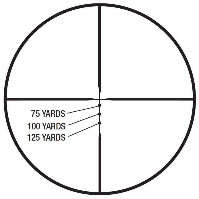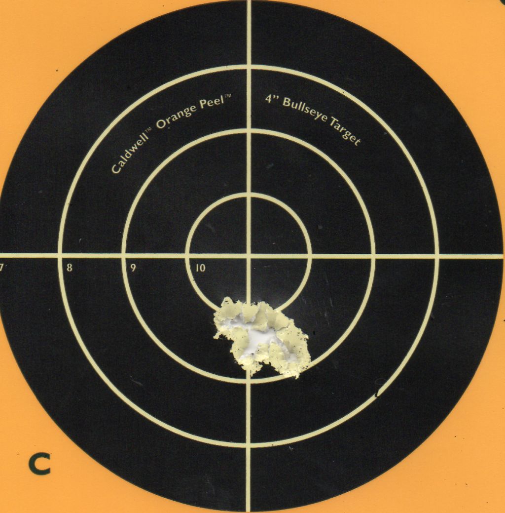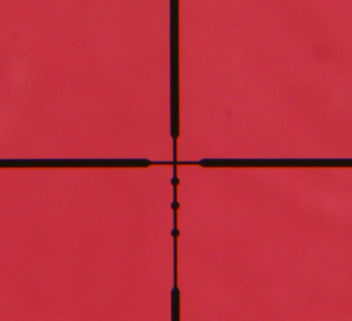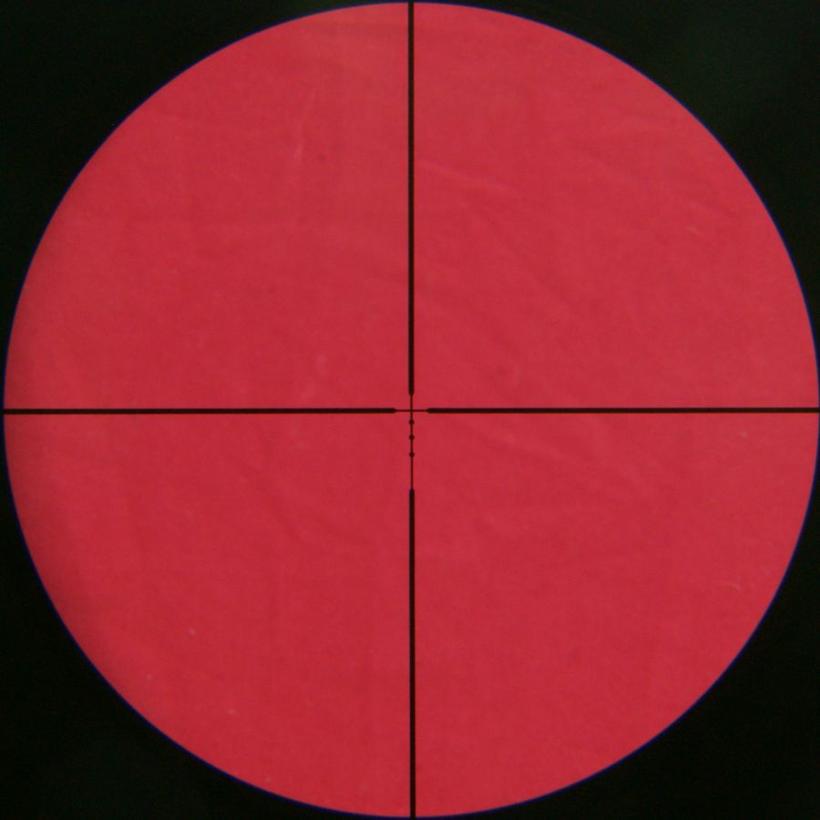Figure 34 - Eye Relief at 7x Power was about 3.2" The Bushnell AR/22 Scope comes with Bushnell's DROP ZONE-22 Rimfire Reticle. According to the Instruction Manual, the reticle is calibrated for use with .22 Long Rifle high velocity ammunition. Since this is a second focal plane reticle, the scope must be set to the highest magnification (7x) for the reticle's ballistic feature to function properly. With the scope zeroed at 50 yards with high velocity ammunition, the aiming dots below identify zeros for 75, 100 and 125 yards. This next photo is my attempt to photograph the reticle. For some reason my camera was not focusing perfectly to give me the crisp lines. When looking through the scope, the reticle is in focus when adjusting the eyepiece focus. The thick lines of the reticle will help in low light situations and the thin lines in the middle help with accuracy (my opinion). Although not verified, the top of the bottom line seems to be about 160 yards. You use the Allen wrench provided to remove the cap screw to remove the turret caps so that you can re-zero the cap with the index marks. The turret caps appear to be made from aluminum. Although I couldn't find any statement in the instruction manual or Bushnell website on this scope being waterproof and fogproof, I did find this statement in the Press Release for the AR Optics, "Constructed with a durable one-piece tube, each scope is fully waterproof and fogproof and features target turrets for rapid windage and elevation adjustments." The two O-rings on the turret housing are a definite step towards waterproofing, but I was surprised that there was not an O-ring between the turret cap and center rotating portion of the turret. Since there are only about 40 grooves around the rotating post and each cap is marked with 60 click adjustments, there are times when the click adjustment mark does not line up perfectly with the red index mark on the scope. I mounted the scope on my Ruger 10/22 Carbine with LaserMax Laser using a set of Burris Signature ZEE Medium Matte Rings. Medium height rings were required due to the protruding gas port cap on the bottom of the scope. Overall, I feel this combination of Ruger 10/22 Rifle, LaserMax Laser, Bushnell Scope and Burrs Rings makes an excellent combination of components to produce a rimfire platform for a wide range of shooters. During my range tests, I shot some of my best groups ever with auto-loading rimfire rifle and I feel some of this success is attributed to the Bushnell AR/22 Scope. The target below is a 5-shot group for an example of what I was able to achieve during my range tests and you can see the full set of results by looking my Range Test Results for the rifle.