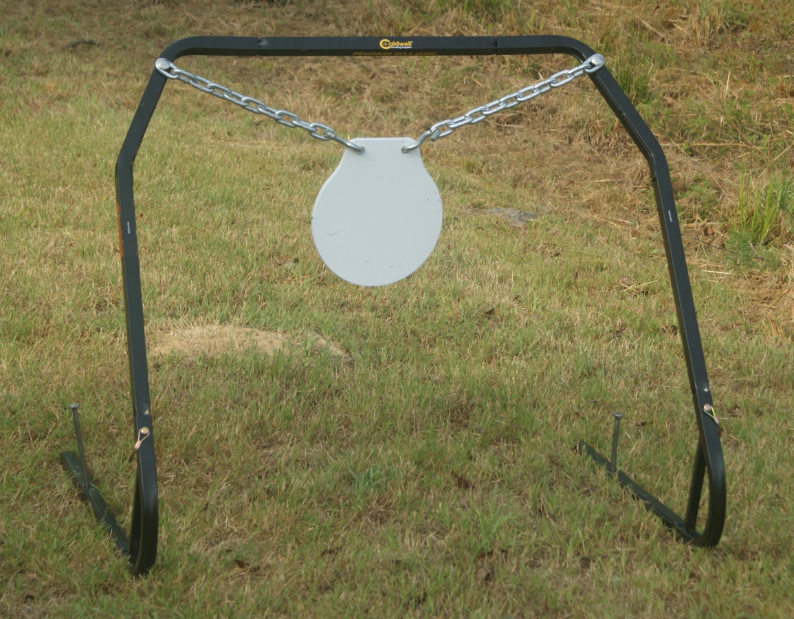 Caldwell Magnum Rifle Gong Review I'm not trying to say I'm old, but I have been shooting for over 40 years. Throughout this time I have always enjoyed reactive style targets over simply punching holes in paper. I know there is a clear need for accuracy shooting and paper gives you measurable results, but it's hard to dispute the sheer fun of a "hit/miss" approach of reactive targets. For close ranges, I have used nearly anything that I could throw out in front of me. For longer ranges I have shot at bottles (glass or plastic and with or without water), tennis balls or cans hanging from tree limbs, balloons placed on sticks, and nearly anything else I could find to have a little fun. With this approach, the big problem is having a supply of these item and resetting the target area after a shooting session. As with most problems, the right application of time and money can solve nearly anything. When I started considering what I wanted out of a reactive target, I decided on two things, a combination of sound and motion. The questions then became how much of each, what was I planning to shoot, and what type of material?. After much consideration, I decided I wanted my first target to be biased towards rifles with a plan of using the target to around 400 yards which is the maximum distance possible at my shooting range. Since seeing the target clearly at those distances becomes more challenging with each year of age, I definitely wanted to put sound as a higher priority over motion. Also knowing that it would receive much abuse over the coming years with each new rifle review, I decided on hardened steel for the material. After doing a little research, I quickly found out that hardened steel was not cheap. Another "nice to have" for a target would be some type of portable stand so I could move it to different distances easily. From all this, I felt I was heading in the direction of some type of gong target 8" to 10" in diameter that comes with a stand, so the search was on. If you do a search on Google for "gong target" you will find several manufacturers of this type of target. During my search, I came across Caldwell's new Magnum Rifle Gong target. After a quick look at the photo and specs, the combination of portable design, AR550 steel, high power rifle capable, and the 10" gong seemed to meet my needs very nicely. Next I glanced over at the MSRP of $169.99 and thought I had to be able to find a better price on the web. After doing a quick search, I found the Caldwell Magnum Rifle Gong (Battenfeld Product Item Number # 223375 ) for $112 at MidSouthShootersSupply.com and decided the street price was competitive so I wanted to get one for a review and future use. The following text in colored italics was taken directly from the