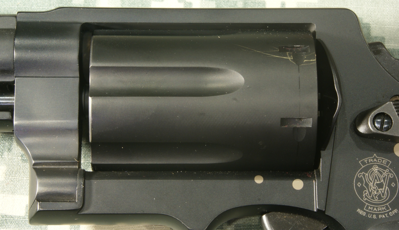 When you purchase the DeSantis Governor Dual Angle Hunter Holster it comes packaged in a zip-lock bag as shown below. The only two items in the bag were the holster and a "Holster or Thumb Break Too Tight?" pamphlet. The pamphlet information can be found here at DeSantis website. The outside of the bag has a sticker that states model "Dual Angle Hunter", hand "Right", firearm "S&W Governor 2 3/4"" and item number "016TCV1Z0". It also stated a date of "08/08/11" which tells you this is probably a holster fresh off the manufacturing line. This holster came with a nice even tan finish and has some of the basic features of the revolver molded into the leather. The holster is double stitched in the critical stress areas and single stitched in other less stressed or cosmetic areas. The holster is stamped "DeSantis 016 V1 Made In U.S.A." on the back. The two slits are used to carry the Governor in the conventional hip draw configuration and passing your belt through the long slot is used for the cross draw configuration. The slots are designed to use a belt up to 1.75" in width. The holster measures about 2.4" at it's widest point. The inside of the holster is lined with suede on the inside to prevent rubbing or scratching on a firearms finish. It comes with a single snap on the thumb break. The holster weighed in at 4.3 ounces These next several photos give you an idea on the fit of the Governor in the holster. I thought the fit was good with very little extra motion of the revolver in the holster and the revolver easily slid out of the holster. Also the revolver seated well in the bottom of the holster. The photo below shows that there was some gap between the retention strap and hammer when the thumb break was snapped. I believe there is some variability in this gap between holsters and this is probably on the wide side of the variability. One thing I noticed was that as you draw the revolver it sometimes contacts the snap on the thumb break. If so, you will get these brass looking marks on your cylinder as shown below. Fortunately the marks do wipe off easily with your thumb. These next three photos show me with the holster in the hip draw configuration. These next three photos show me with the holster in the cross draw configuration. I used the holster with a basket weave style belt and would recommend a solid style belt. It was a little more difficult than I would like feeding the belt through the longer section for the cross draw configuration because the belt wanted to compress/expand due the the weave.