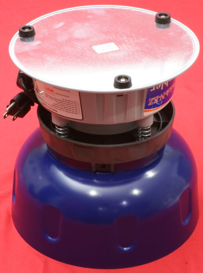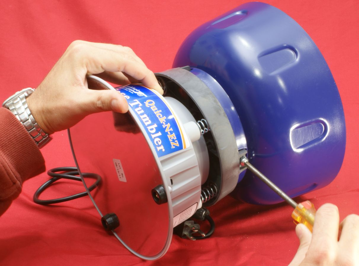 Assembly The basic steps for assembly of the Tumbler and Separator are shown below. These steps shown give you a good idea on how a product is put together and show some of the features of a product, but you should always consider the instruction manual as the official source for safety, assembly and maintenance of any product. Case Tumbler Assembly Assembly of the tumbler is pretty simple. You need the tumbler base, tumbler bowl, clear tumbler lid and the hardware pack. You also need a Phillips screwdriver and 7/16" wrench. Turn the bowl over an place three hex nuts into the slots as shown below. Flip the tumbler base over and place the tumbler tabs over the tumbler bowl so that the hole in the tumbler base line up with the hex nuts. Put a star washer on each of the three screws and thread each of the screws through the holes and into the nuts. Only tighten these screws to no more than 10 in-lbs of torque or 1/4 to 1/2 turn after the screw bottoms out. Flip the tumbler assembly over and thread the remaining nut on the threaded rod about 3/4" as shown below. Thread the threaded rod into the brass insert in the bottom of the bowl until the threaded rod bottoms out in the insert. Next hand tighten the nut on the threaded rod until it is in contact with the bottom of the bowl. Tighten the nut 1/8 turn using the wrench. Make sure you don't over tighten the nut because doing so will loosen the brass insert in the bottom of the hole. To install the tumbler lid, place the lid on the bowl and over the threaded shaft and install the flat washer and wing nut as shown below. Rotary Separator Just like with the tumbler assembly of the rotary separator is very simple. The parts you need for assembly are shown below plus the bucket.