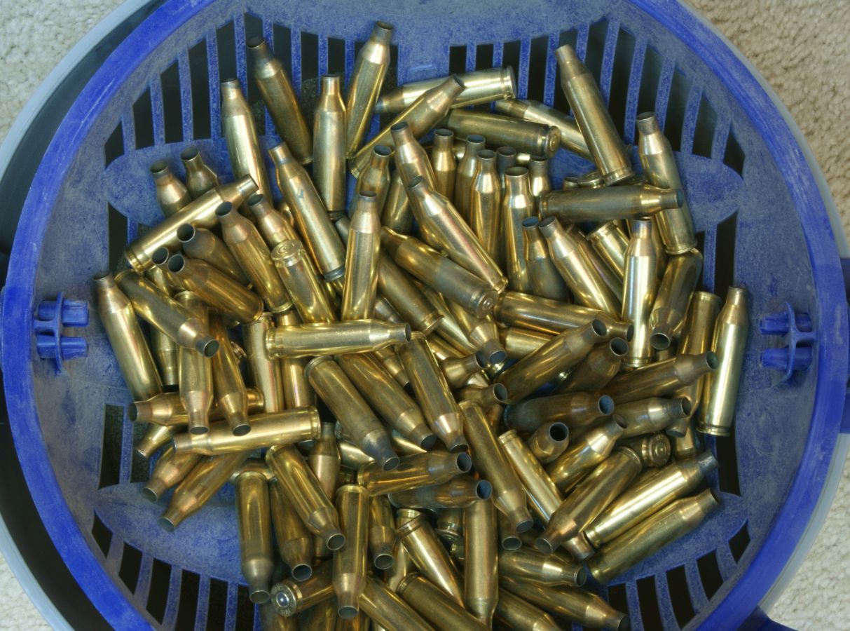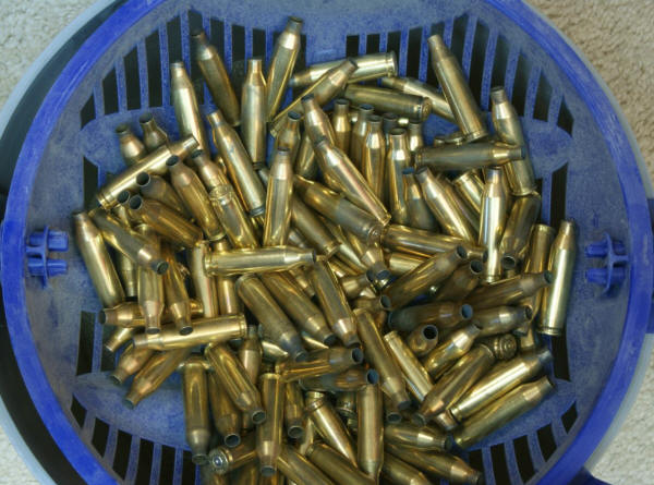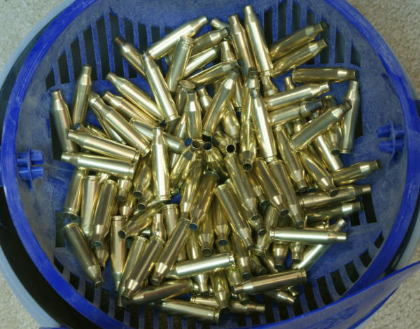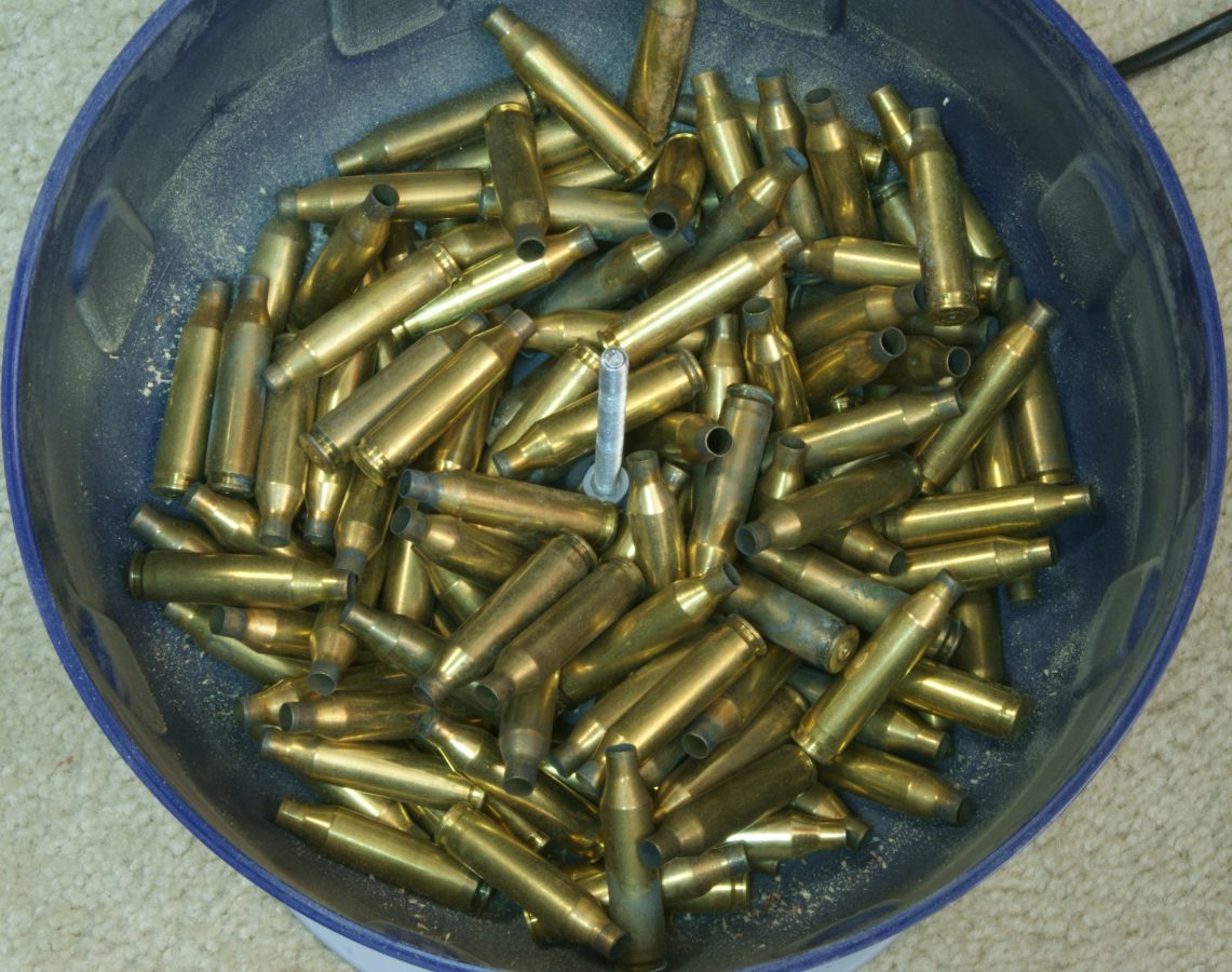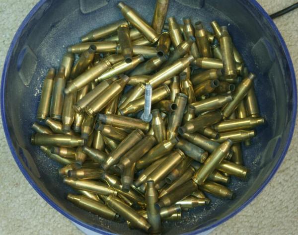 side. The top sifter half and bottom sifter half snap together to form a hinge connection. After closing the top on the bottom sifter half, insert the pin which keeps the two halves together when rotating while separating your media and cases. The two bucket adapters snap on each side of the lid as shown below in the area around the bucket handle. The kit also comes with two media shields that snap on the edge of the bucket to prevent media from flying out of the bucket when rotating the separator. The sifter assembly sits in bucket adapters as shown below. The unit is now fully assembled. To evaluate how well the Quick-N-EZ Tumbler would perform I decided to send several batches of brass through the tumbler. Since the kit comes with corn media, I decided to stick with it instead of getting some ground walnut media. I tumbled about 500 cases of .308 Win in three different batches and about 350 cases of .38 Special in a single batch. Next I decided to clean some .243 Win brass that I started collecting about 20 years ago so there is a wide variety of ages (tarnish) on these cases along with some serious corrosion on a few that I will most likely toss out in the end anyway. The photo below shows 155 cases prior to any cleaning. This next photo shows the cases after about 1.5 hours of tumbling in untreated corn media. The cases were noticeably cleaner and would probably be suitable for reloading. I feel that if I would have used ground walnut media for this cleaning stage the brass would have been noticeably cleaner. The instruction manual provides a tip which says, "Clean your brass before polishing with “untreated” ground walnut shells." Next I added the brass polish per the instructions which was 3 teaspoons per pound of media for new untreated media. Since the tumbler came with 3 pounds of media and this quantity seemed to fill the tumbler bowl to the proper level, I used all three pounds and added 9 teaspoons of brass polish then tumbled the cases for another two hours. The addition of the brass polish really helped to make the brass shine. There are two simple modification to the rotary separator that I feel would make it more user friendly. The first is the addition of rubber bands over the bucket adapter ears to keep the separator from trying to pop out when rotating. The second would be attaching the bucket adapter on the side with the crank handle so that it stays in place better when rotating the handle. A couple of screws through the adapter and bucket should fix this easily.