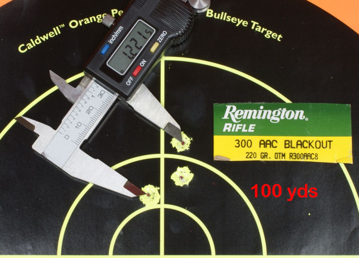 No range test would be complete without showing at least one group. This 100 yard 3-shot group was my best for the day with this rifle and measured 1.22" using the subsonic Remington 300 AAC Blackout 220 grain ammunition. This ammunition also produced my best group average 1.59" based on five 3-shot groups.