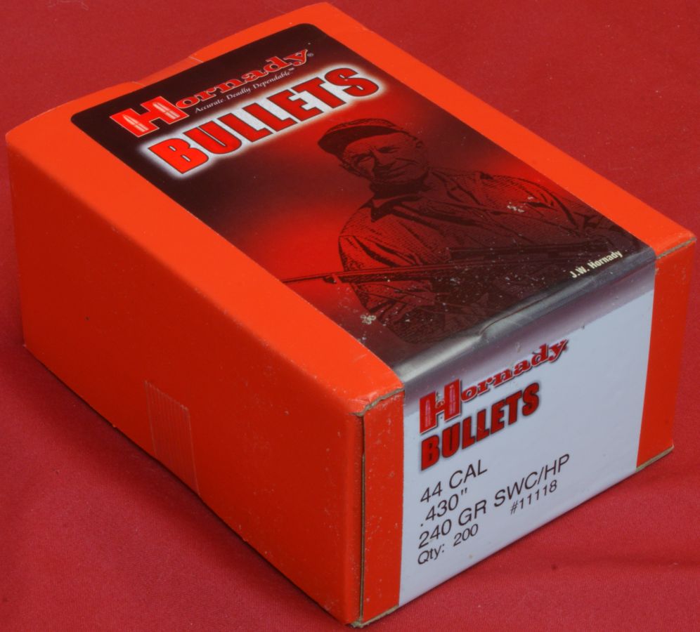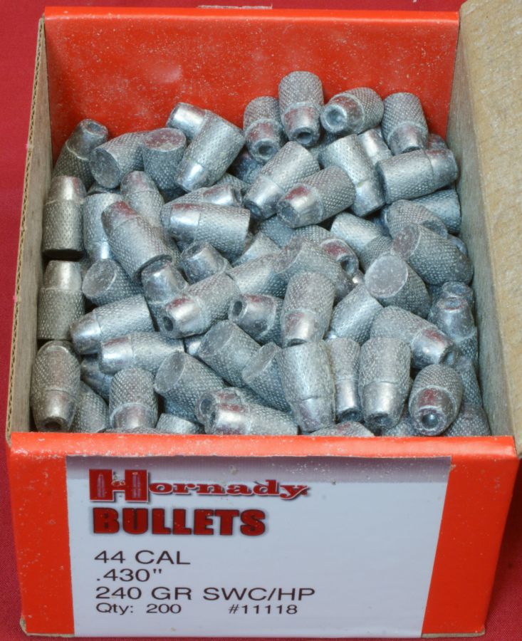 Hornady Bullets 44 CAL .430" 240 gr SWC/HP Data shown in colored italics was taken from the manufacture's website. Key Features "Hornady lead bullets are pre-lubricated and cold-swaged for total uniformity and balance. Our exclusive knurling system retains lubricant over the entire bearing surface to reduce leading in your barrel."