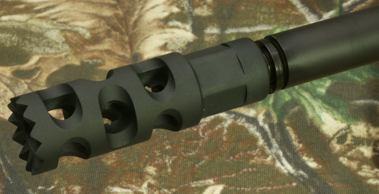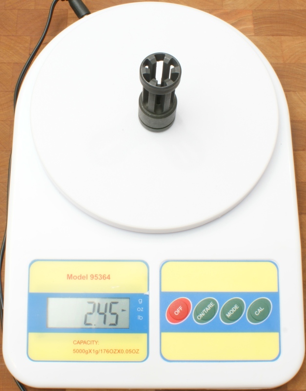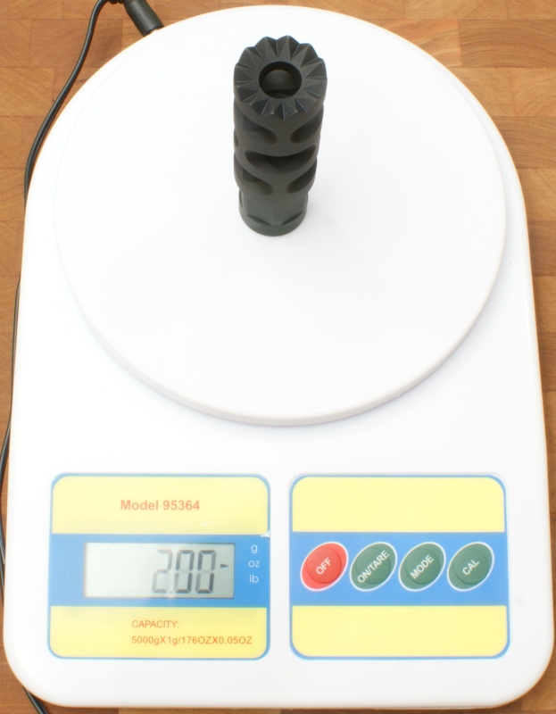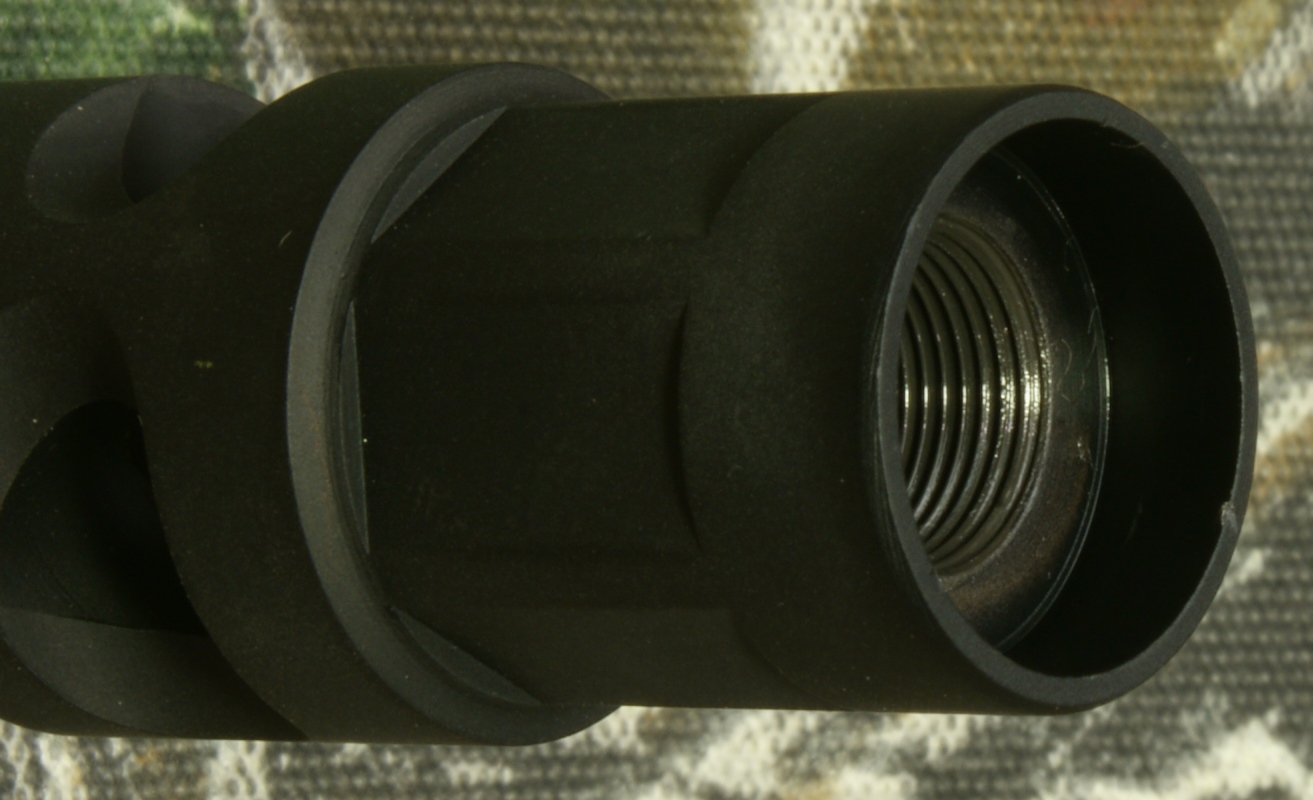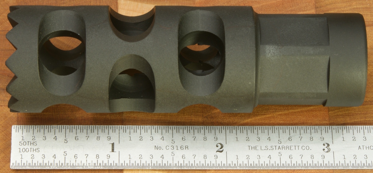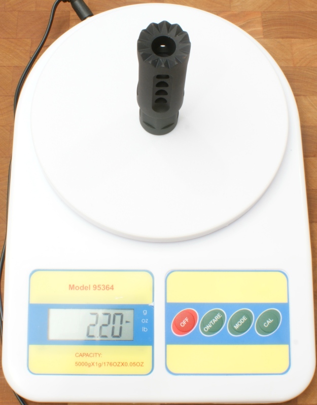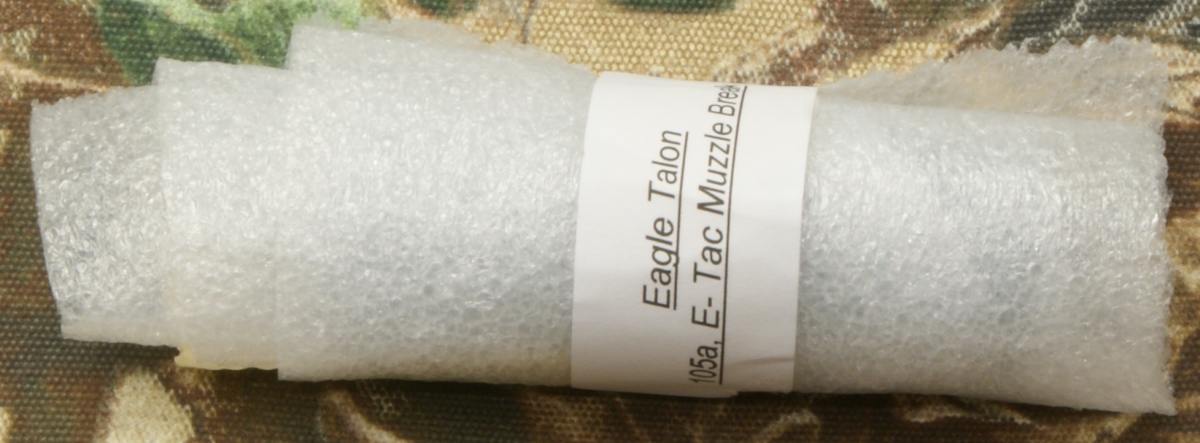 Each Talon is machined from 6061-T6 aluminum alloy, is type 3 hard coat anodized, and has a non-reflective black surface. You can purchase these Talons directly from Iron Eagle Tactical for $55.95, $65.95 or $75.95, depending on the model, with free shipping to the lower 48 states and Canada. Although Iron Eagle Tactical produces custom products specifically for the Ruger SR-22 Rifle, the Talons can be used on a variety of caliber firearms such as the .22, .223, 5.56mm, .308 and 7.62mm, provided that firearm has a 1/2-28 right hand thread on the end of the barrel. The original Talons were designed for the .22, .223 and 5.56mm calibers, but now the Talons come with a .375" hole to allow use on the .308 and 7.62mm calibers. Before you install your Talon on this larger caliber, you should make sure you did not somehow get an older model by verifying the larger bore size. I was able to get two Talons for this review and to also use on my new Ruger SR-22 Rifle and Colt AR-15. The two Talons in this review are the Model 105a and Model 105c and are shown below installed on my Ruger SR-22 Rifle. Also installed on this rifle is an Iron Eagle Tactical Combat Brush Guard and Iron Eagle Tactical Rails. The other two Talons not shown in this review are the Model 105b which has the same pattern shown above at each 120 degree location around the body of this Talon and the Model 105d which has the two patterns of holes staggered as shown above at each 120 degrees around the body of this Talon. Other than these image differences, all other features of these four Talons are the same. There is nothing fancy about the packaging and shipping materials. The Talons arrived in a bubble wrap envelope and then were wrapped in thin foam sheet as shown below. They arrived in great condition. The next several photos show different features of the Talons. One thing you will notice is that the Talons will develop white marks when you rub your fingers across the surfaces. This is because the slight roughness of the hard coat anodizing will actually rub some skin off your fingers. Don't worry because this is common and these white marks can be removed easily by rubbing with a piece of cloth. If you notice any white marks on these parts below, it's only because I failed to wipe them off before I took the photos. Each of these Talons measures about 3.25" in length with a maximum outside diameter of about 0.996" The end of the Talon that screws on to the barrel is counter-bored to a depth of slightly under 0.25". Having this counter-bore creates an installed length of 3.00" which you can compare to that of the flash hider that come on the Ruger SR-22 Rifle which is 2.24". Adding these Talons will add about 3/4" to the total length of your Ruger SR-22 Rifle. This counter-bore allows the end of the Talon to screw over the barrel washer and over the smooth portion of the barrel. I believe this gives the installation of the Talon a cleaner and more integral look as part of the rifle than the original flash hider that comes on the Ruger SR-22 Rifle. The two Talons I received weighed in at 2.00 ounces for the Model 105a and 2.20 ounces for the Model 105c. These Talons are actually a weight savings when compared to the Ruger SR-22 Rifle's flash hider which weighed in at 2.45 ounces.
