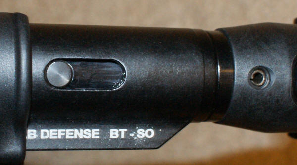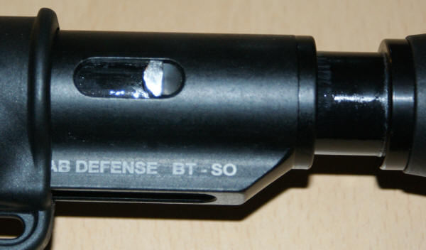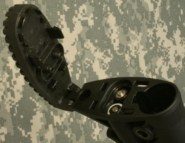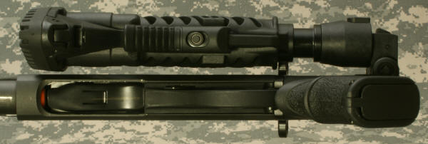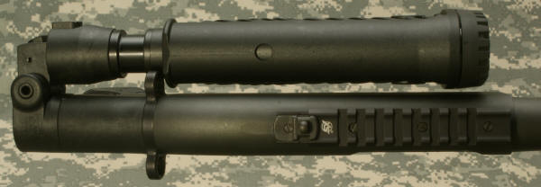 The photo below on the left shows the pistol grip installed along with an ambidextrous sling adapter. The rough looking area on the threads is actually some type of lubricant. The photo on the right shows the grip with the buffer tube disk screwed into the grip. This is actually the next step in the installation process for the buttstock. In these next several photos, I removed the buffer tube disk and installed it on the buffer tube (since there is no buffer in the 870, this is really more accurately called a receiver extension but I'm choosing to use the more commonly called term). There are four key features in this assembly. The first is the attachment of this assembly to the pistol grip which is done by inserting the attachment bolt through the hinge portion of this assembly and screwing it into the disk inside the pistol grip. The next is the hinge which allows this to be a folding stock. The third feature is the felt-recoil reducing features, and finally the multi-position tube that interfaces with the actual buttstock. The photo below shows the hinge folded and you can see the end of the attachment screw. Also notice the large thumb button which you must press to rotate the stock to it's folded position. When you look at the bottom of the buffer tube, you will see 5 holes that represent the different potential positions of the stock on the buffer tube. The stock will only lock into the rear four positions. Because of the taper on the hinge, the buttstock interferes and cannot move far enough forward to lock in the first hole. From my point of view, this is not a big deal, but these are the facts. The felt-recoil reducing feature can travel a maximum of 0.60". I will discuss the feature in more detail further in this review. The actual size of the buffer tube would be classified as a Commercial Buffer Tube. Overall the hinge is very streamlined except for the bulge on the left side of the gun in a normal installation. Mako advertises that this can be converted to fold to the right or left. Clearly it is possible to do this by pressing out the role pin that holds the tube and hinge together and rotating the hinge. Since a right folded stock would cover the ejection port on the Remington 870, I'm not sure you would want to do this if breaching were required. If not, it could be reconfigured to a left handed shooter's preference for carrying as a second weapon.In the photo below you can see the "claw" that engages inside the pocked in the other half of the hinge to lock the stock in the open position. My impression is this is a very simple, yet sturdy folding/locking feature. The hinge is attached to the grip by a screw that goes through the interface side of the hinge and into the disk screwed inside the grip. The grip and hinge have mating profiles that prevent the stock from rotating.