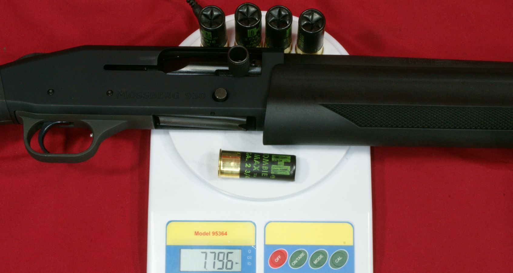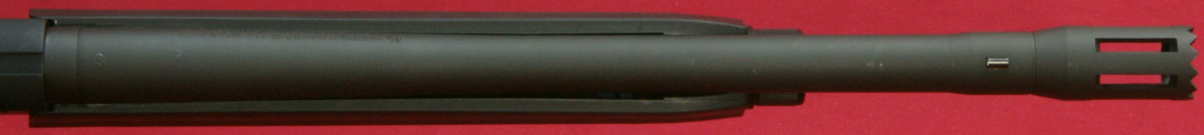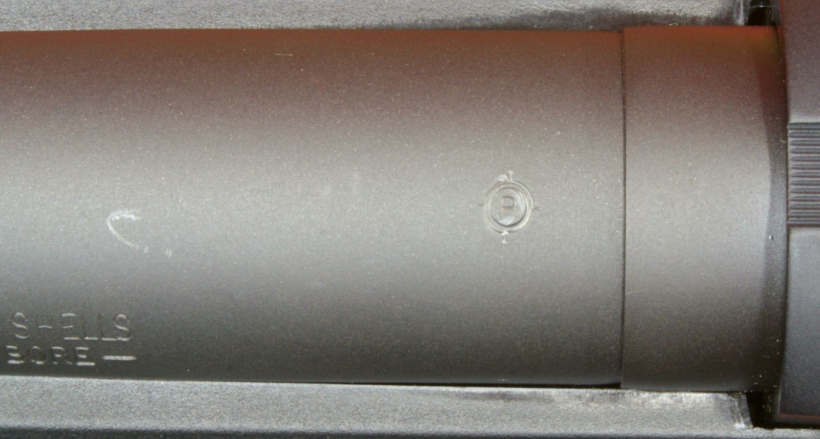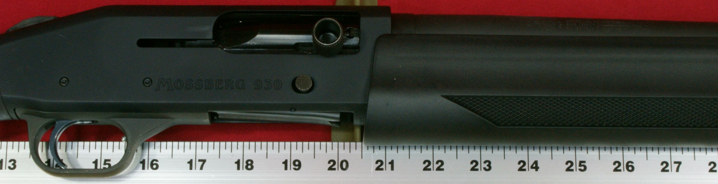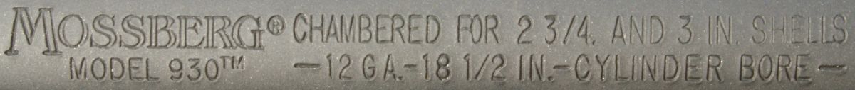 These next four photos are the same as shown in Part 2 of this review and give direct views of the Mossberg 930 Tactical Shotgun. The shotgun has a total overall length of 39" which matched the specification length. The shotgun weighed in at 7.37 pounds empty and 7.80 pounds with 5 rounds of Hornady Zombie Z-Max 2.75" 00 Buckshot. The CG (center of gravity) of this shotgun was about 20" forward of the buttpad unloaded and about 20.4" loaded. The photos below show the balance point (CG) of the shotgun. "Point-ability" is related to the weight and center of gravity (CG) of the shotgun and is the "mass moment of inertia" (MMI) about your shoulder. The MMI (or point-ability) is basically the weight x (distance to CG)2 and represents the resistance to movement of the shotgun as it pivots about your shoulder. The 930 Tactical has point-ability numbers of 2948 lbs-in2 unloaded and 3246 lbs-in2 loaded. Based on comparing this semi-automatic shotgun against several other pump shotguns, there is no real penalty in weight or point-ability of the semi-automatic shotgun compared to similar home defense style pump shotguns. One feature that sets the Mossberg 930 Tactical 5-Shot Shotgun from the rest is its integral breacher that is machined with the barrel. This is not a removable tactical choke. By the breacher being integral (not removable) with the barrel, the length of the breacher is included in the barrel length of the shotgun. This gives the 930 Tactical a total barrel length of 18.5" including the breacher. You can see below that there is a slight undercut where the breacher tapers into the barrel and may give the initial appearance that it is removable, but if you look closer, you will see there in no interface line between these parts. This next photo shows looking down the breacher at the bore of the barrel. You can see how the breacher has a larger internal diameter than the barrel. This means that the true effective barrel length is 1.75" shorter than the total barrel length. Essentially you are getting a 16.75" barrel with a beefy breaching device on the end. The barrel comes with no constriction which means it has a cylinder bore choke. This will allow you to shoot rifled slugs along with buckshot or any other type of shot loads. I'm sure there are strong opinions for and against the need for a breacher on a home defense shotgun. Either way, there is no doubt that this vented area and aggressive saw tooth front face add an interesting look to the shotgun and I wouldn't want that barrel thrust into my ribs. The front sight seems to be made from aluminum and has a highly visible white dot on both the front and rear surfaces. The magazine cap is aluminum and includes a steel sling swivel stud. The total barrel length measures 18.5" including the breacher and the barrel has a black matte finish. The forearm is made from some type of polymer (synthetic) material and includes a checkered area on each side on the lower portion of the forearm. The magazine tube measured about 12" in length and holds four 2.75" shells. I was barely able to get four 3" shells in the tube, but the first shell would not feed properly. On the right side of the barrel (about 1/3 of the way down the forearm) is stamped the warning statement shown below. The forearm had a very tight feel on the forward end, but at the rear end I was able to flex it slightly so that it would push against the lower portion of the receiver and then flex back out slightly. I wouldn't consider this an issue, but instead an observation. On the left side of the barrel (about 1/3 of the way down the forearm) is stamped the manufacturer "MOSSBERG®", model "MODEL 930TM", chamber size "CHAMBERED FOR 2 3/4 AND 3 IN SHELLS", gauge "12 GA, barrel length "18 1/2 IN" and choke "CYLINDER BORE". The top of the barrel near the receiver had a proof mark as shown below. The Mossberg 930 Tactical Shotgun has an aluminum black anodized receiver and comes drilled and tapped for mounting a rail if desired. It also comes with an upper mounted safety button on the rear of the receiver. Another non-standard feature included with the 930 Tactical is the oversized operating handle. The handle is knurled and .63" in diameter and sticks out about 1" from the side of the receiver. The bolt release is located on the right side of the receiver. Also, the the lettering "MOSSBERG 930" appears to be machined into the right side of the receiver. This next photo shows the receiver with the bolt locked open in the rear position. Pushing in on the bolt release will cause the spring loaded bolt to slam forward. The action had a typical semi-automatic feel and didn't seem overly smooth or rough. The marks on the side of the receiver were there when I purchased this shotgun and are due to this shotgun being the Wal-Mart display model and being handled many times in the store. The bottom of the receiver houses the aluminum trigger housing. The trigger housing seemed to have some freeplay (rattle) inside receiver. You can see in the photo how the trigger housing is resting on the bottom of the slot in the receiver and there is a slight gap at the top of the housing. At first glance, it would appear that there are no markings on the lower receiver, but if you take a close look under the end of the forearm, you will see the marking shown below. The 930 also includes an aluminum magazine tube follower. The only marking on the left side of the receiver is the serial number located between the two trigger housing pins. This shotgun has an aluminum polished trigger. The trigger pull on this shotgun averaged 4.8 pounds based on 5 pulls using a Lyman Digital Trigger Pull Gauge. The trigger seemed to have a little creep, then broke fairly crisp and had very little over-travel. Overall, I think most people would be pleased with this trigger pull on a shotgun. The 930 includes a "cocking indicator" located on the front of the trigger guard. When the hammer is cocked and ready to fire, the in