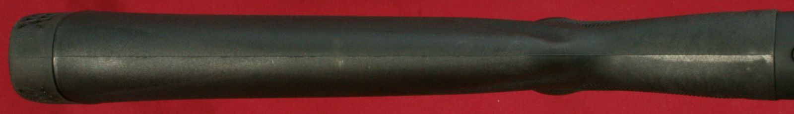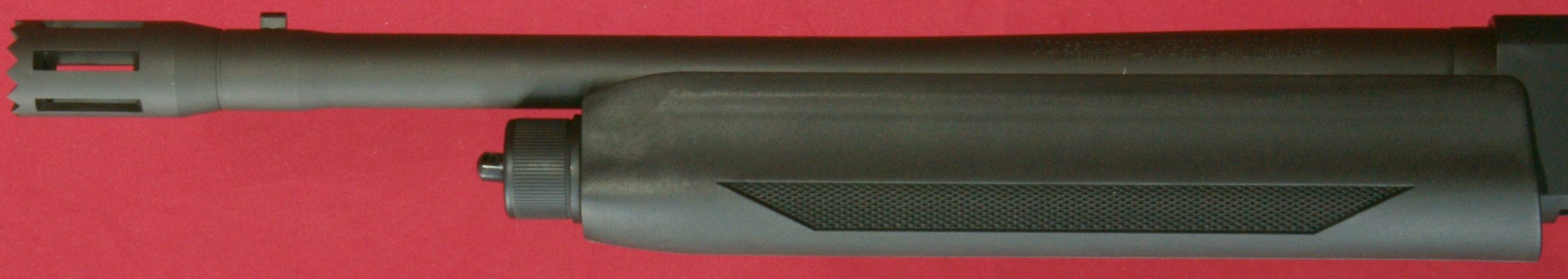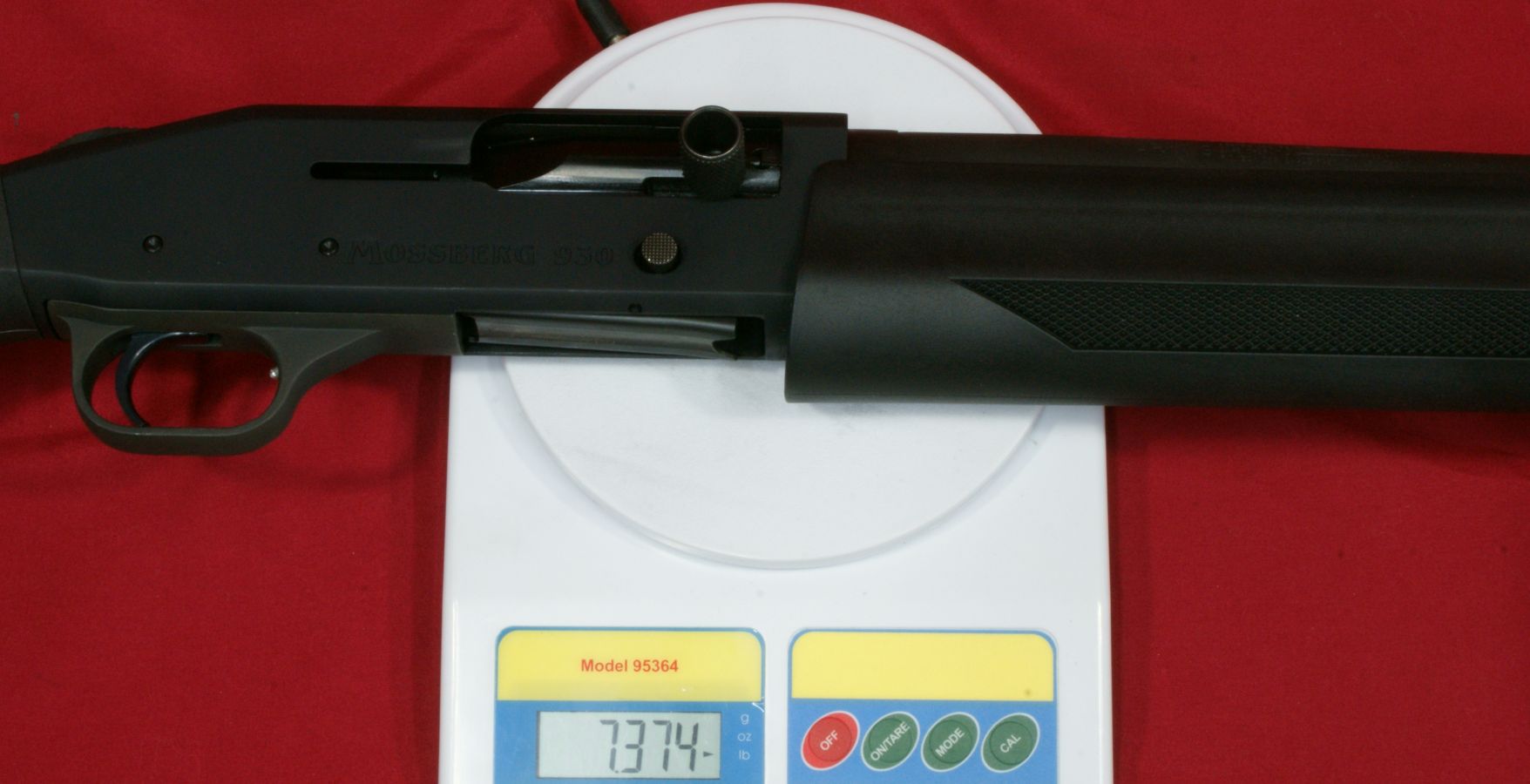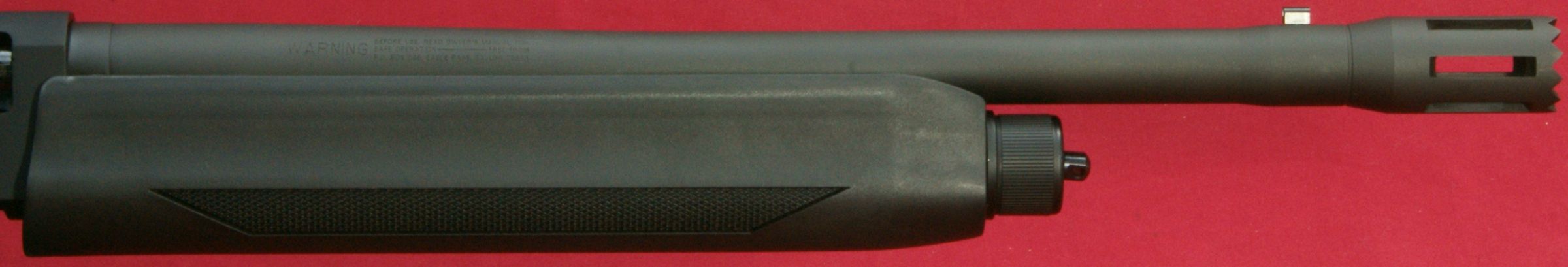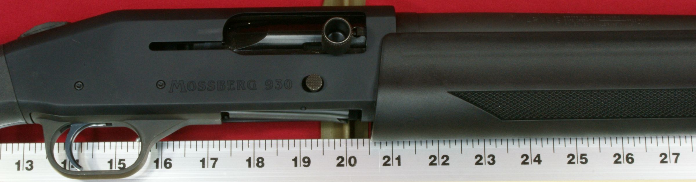 These next four photos are the same as shown in Part 2 of this review and give direct views of the Mossberg 930 Tactical Shotgun. The shotgun has a total overall length of 39" which matched the specification length. The shotgun weighed in at 7.37 pounds empty and 7.80 pounds with 5 rounds of Hornady Zombie Z-Max 2.75" 00 Buckshot. The CG (center of gravity) of this shotgun was about 20" forward of the buttpad unloaded and about 20.4" loaded. The photos below show the balance point (CG) of the shotgun. "Point-ability" is related to the weight and center of gravity (CG) of the shotgun and is the "mass moment of inertia" (MMI) about your shoulder. The MMI (or point-ability) is basically the weight x (distance to CG)2 and represents the resistance to movement of the shotgun as it pivots about your shoulder. The 930 Tactical has point-ability numbers of 2948 lbs-in2 unloaded and 3246 lbs-in2 loaded. Based on comparing this semi-automatic shotgun against several other pump shotguns, there is no real penalty in weight or point-ability of the semi-automatic shotgun compared to similar home defense style pump shotguns. One feature that sets the Mossberg 930 Tactical 5-Shot Shotgun from the rest is its integral breacher that is machined with the barrel. This is not a removable tactical choke. By the breacher being integral (not removable) with the barrel, the length of the breacher is included in the barrel length of the shotgun. This gives the 930 Tactical a total barrel length of 18.5" including the breacher. You can see below that there is a slight undercut where the breacher tapers into the barrel and may give the initial appearance that it is removable, but if you look closer, you will see there in no interface line between these parts. This next photo shows looking down the breacher at the bore of the barrel. You can see how the breacher has a larger internal diameter than the barrel. This means that the true effective barrel length is 1.75" shorter than the total barrel length. Essentially you are getting a 16.75" barrel with a beefy breaching device on the end. The barrel comes with no constriction which means it has a cylinder bore choke. This will allow you to shoot rifled slugs along with buckshot or any other type of shot loads. I'm sure there are strong opinions for and against the need for a breacher on a home defense shotgun. Either way, there is no doubt that this vented area and aggressive saw tooth front face add an interesting look to the shotgun and I wouldn't want that barrel thrust into my ribs. The front sight seems to be made from aluminum and has a highly visible white dot on both the front and rear surfaces. The magazine cap is aluminum and includes a steel sling swivel stud. The total barrel length measures 18.5" including the breacher and the barrel has a black matte finish. The forearm is made from some type of polymer (synthetic) material and includes a checkered area on each side on the lower portion of the forearm. The magazine tube measured about 12" in length and holds four 2.75" shells. I was barely able to get four 3" shells in the tube, but the first shell would not feed properly. On the right side of the barrel (about 1/3 of the way down the forearm) is stamped the warning statement shown below. The forearm had a very tight feel on the forward end, but at the rear end I was able to flex it slightly so that it would push against the lower portion of the receiver and then flex back out slightly. I wouldn't consider this an issue, but instead an observation. On the left side of the barrel (about 1/3 of the way down the forearm) is stamped the manufacturer "MOSSBERG®", model "MODEL 930TM", chamber size "CHAMBERED FOR 2 3/4 AND 3 IN SHELLS", gauge "12 GA, barrel length "18 1/2 IN" and choke "CYLINDER BORE". The top of the barrel near the receiver had a proof mark as shown below. The Mossberg 930 Tactical Shotgun has an aluminum black anodized receiver and comes drilled and tapped for mounting a rail if desired. It also comes with an upper mounted safety button on the rear of the receiver. Another non-standard feature included with the 930 Tactical is the oversized operating handle. The handle is knurled and .63" in diameter and sticks out about 1" from the side of the receiver. The bolt release is located on the right side of the receiver. Also, the the lettering "MOSSBERG 930" appears to be machined into the right side of the receiver. This next photo shows the receiver with the bolt locked open in the rear position. Pushing in on the bolt release will cause the spring loaded bolt to slam forward. The action had a typical semi-automatic feel and didn't seem overly smooth or rough. The marks on the side of the receiver were there when I purchased this shotgun and are due to this shotgun being the Wal-Mart display model and being handled many times in the store. The bottom of the receiver houses the aluminum trigger housing. The trigger housing seemed to have some freeplay (rattle) inside receiver. You can see in the photo how the trigger housing is resting on the bottom of the slot in the receiver and there is a slight gap at the top of the housing. At first glance, it would appear that there are no markings on the lower receiver, but if you take a close look under the end of the forearm, you will see the marking shown below. The 930 also includes an aluminum magazine tube follower. The only marking on the left side of the receiver is the serial number located between the two trigger housing pins. This shotgun has an aluminum polished trigger. The trigger pull on this shotgun averaged 4.8 pounds based on 5 pulls using a Lyman Digital Trigger Pull Gauge. The trigger seemed to have a little creep, then broke fairly crisp and had very little over-travel. Overall, I think most people would be pleased with this trigger pull on a shotgun. The 930 includes a "cocking indicator" located on the front of the trigger guard. When the hammer is cocked and ready to fire, the in