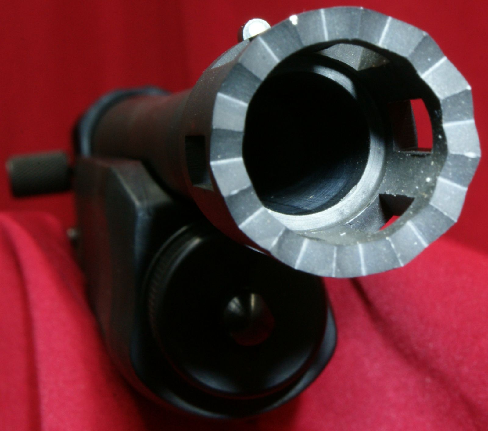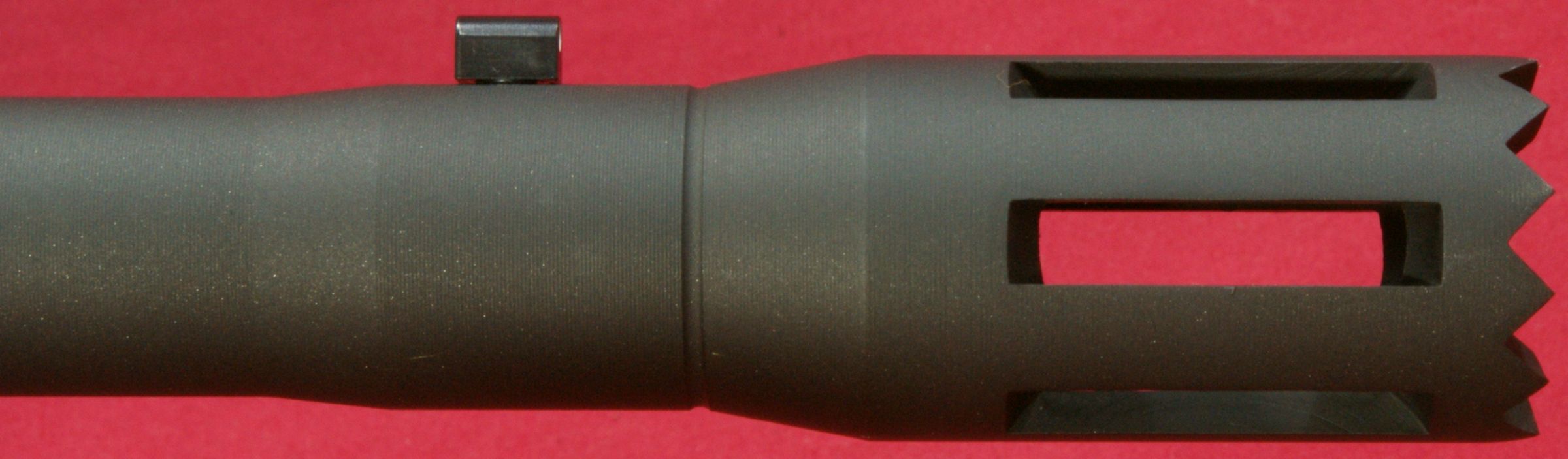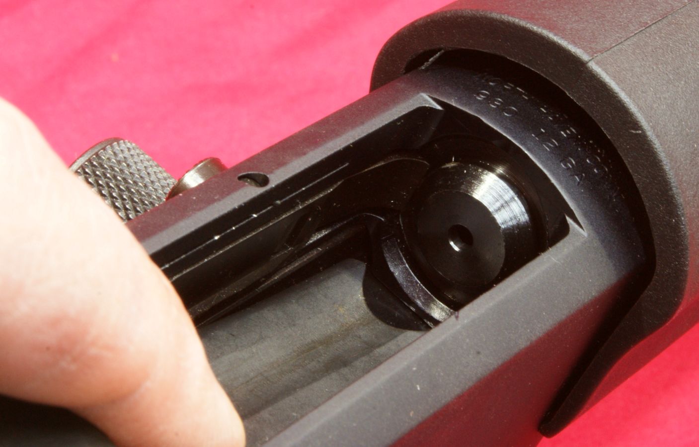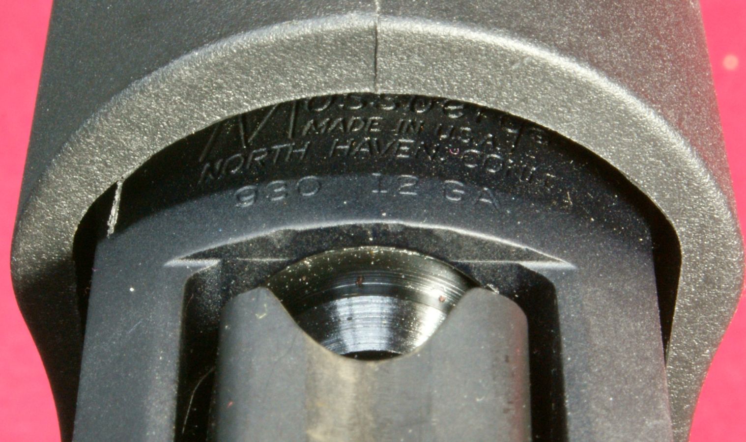 These next four photos are the same as shown in Part 2 of this review and give direct views of the Mossberg 930 Tactical Shotgun. The shotgun has a total overall length of 39" which matched the specification length. The shotgun weighed in at 7.37 pounds empty and 7.80 pounds with 5 rounds of Hornady Zombie Z-Max 2.75" 00 Buckshot. The CG (center of gravity) of this shotgun was about 20" forward of the buttpad unloaded and about 20.4" loaded. The photos below show the balance point (CG) of the shotgun. "Point-ability" is related to the weight and center of gravity (CG) of the shotgun and is the "mass moment of inertia" (MMI) about your shoulder. The MMI (or point-ability) is basically the weight x (distance to CG)2 and represents the resistance to movement of the shotgun as it pivots about your shoulder. The 930 Tactical has point-ability numbers of 2948 lbs-in2 unloaded and 3246 lbs-in2 loaded. Based on comparing this semi-automatic shotgun against several other pump shotguns, there is no real penalty in weight or point-ability of the semi-automatic shotgun compared to similar home defense style pump shotguns. One feature that sets the Mossberg 930 Tactical 5-Shot Shotgun from the rest is its integral breacher that is machined with the barrel. This is not a removable tactical choke. By the breacher being integral (not removable) with the barrel, the length of the breacher is included in the barrel length of the shotgun. This gives the 930 Tactical a total barrel length of 18.5" including the breacher. You can see below that there is a slight undercut where the breacher tapers into the barrel and may give the initial appearance that it is removable, but if you look closer, you will see there in no interface line between these parts. This next photo shows looking down the breacher at the bore of the barrel. You can see how the breacher has a larger internal diameter than the barrel. This means that the true effective barrel length is 1.75" shorter than the total barrel length. Essentially you are getting a 16.75" barrel with a beefy breaching device on the end. The barrel comes with no constriction which means it has a cylinder bore choke. This will allow you to shoot rifled slugs along with buckshot or any other type of shot loads. I'm sure there are strong opinions for and against the need for a breacher on a home defense shotgun. Either way, there is no doubt that this vented area and aggressive saw tooth front face add an interesting look to the shotgun and I wouldn't want that barrel thrust into my ribs. The front sight seems to be made from aluminum and has a highly visible white dot on both the front and rear surfaces. The magazine cap is aluminum and includes a steel sling swivel stud. The total barrel length measures 18.5" including the breacher and the barrel has a black matte finish. The forearm is made from some type of polymer (synthetic) material and includes a checkered area on each side on the lower portion of the forearm. The magazine tube measured about 12" in length and holds four 2.75" shells. I was barely able to get four 3" shells in the tube, but the first shell would not feed properly. On the right side of the barrel (about 1/3 of the way down the forearm) is stamped the warning statement shown below. The forearm had a very tight feel on the forward end, but at the rear end I was able to flex it slightly so that it would push against the lower portion of the receiver and then flex back out slightly. I wouldn't consider this an issue, but instead an observation. On the left side of the barrel (about 1/3 of the way down the forearm) is stamped the manufacturer "MOSSBERG®", model "MODEL 930TM", chamber size "CHAMBERED FOR 2 3/4 AND 3 IN SHELLS", gauge "12 GA, barrel length "18 1/2 IN" and choke "CYLINDER BORE". The top of the barrel near the receiver had a proof mark as shown below. The Mossberg 930 Tactical Shotgun has an aluminum black anodized receiver and comes drilled and tapped for mounting a rail if desired. It also comes with an upper mounted safety button on the rear of the receiver. Another non-standard feature included with the 930 Tactical is the oversized operating handle. The handle is knurled and .63" in diameter and sticks out about 1" from the side of the receiver. The bolt release is located on the right side of the receiver. Also, the the lettering "MOSSBERG 930" appears to be machined into the right side of the receiver. This next photo shows the receiver with the bolt locked open in the rear position. Pushing in on the bolt release will cause the spring loaded bolt to slam forward. The action had a typical semi-automatic feel and didn't seem overly smooth or rough. The marks on the side of the receiver were there when I purchased this shotgun and are due to this shotgun being the Wal-Mart display model and being handled many times in the store. The bottom of the receiver houses the aluminum trigger housing. The trigger housing seemed to have some freeplay (rattle) inside receiver. You can see in the photo how the trigger housing is resting on the bottom of the slot in the receiver and there is a slight gap at the top of the housing. At first glance, it would appear that there are no markings on the lower receiver, but if you take a close look under the end of the forearm, you will see the marking shown below. The 930 also includes an aluminum magazine tube follower. The only marking on the left side of the receiver is the serial number located between the two trigger housing pins. This shotgun has an aluminum polished trigger. The trigger pull on this shotgun averaged 4.8 pounds based on 5 pulls using a Lyman Digital Trigger Pull Gauge. The trigger seemed to have a little creep, then broke fairly crisp and had very little over-travel. Overall, I think most people would be pleased with this trigger pull on a shotgun. The 930 includes a "cocking indicator" located on the front of the trigger guard. When the hammer is cocked and ready to fire, the in