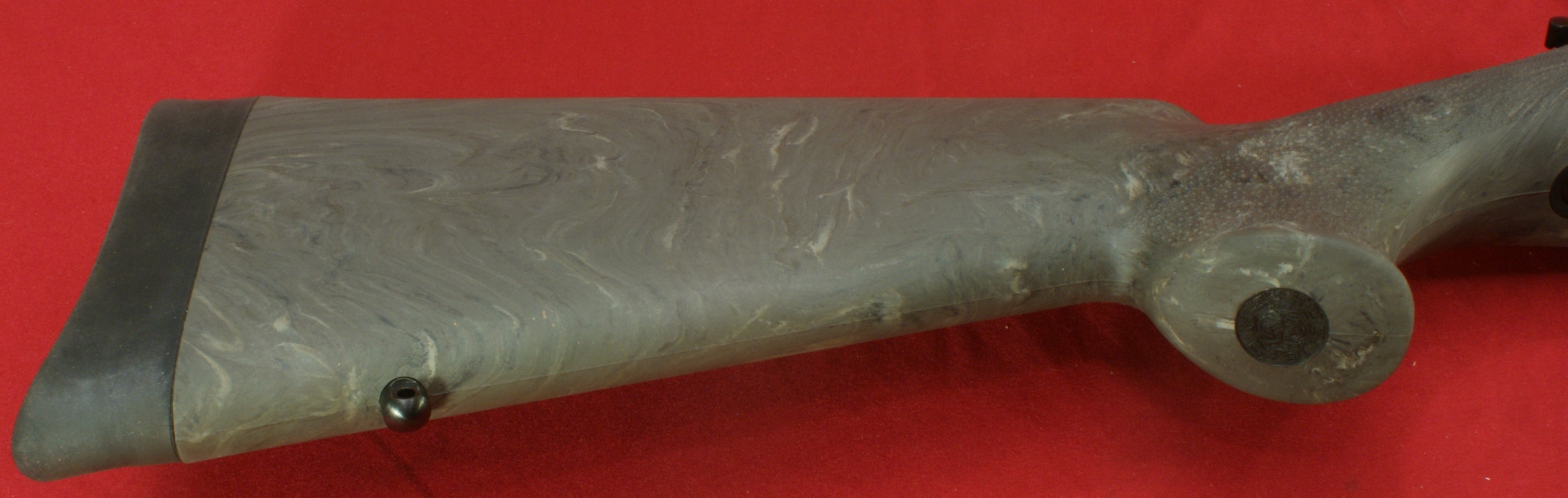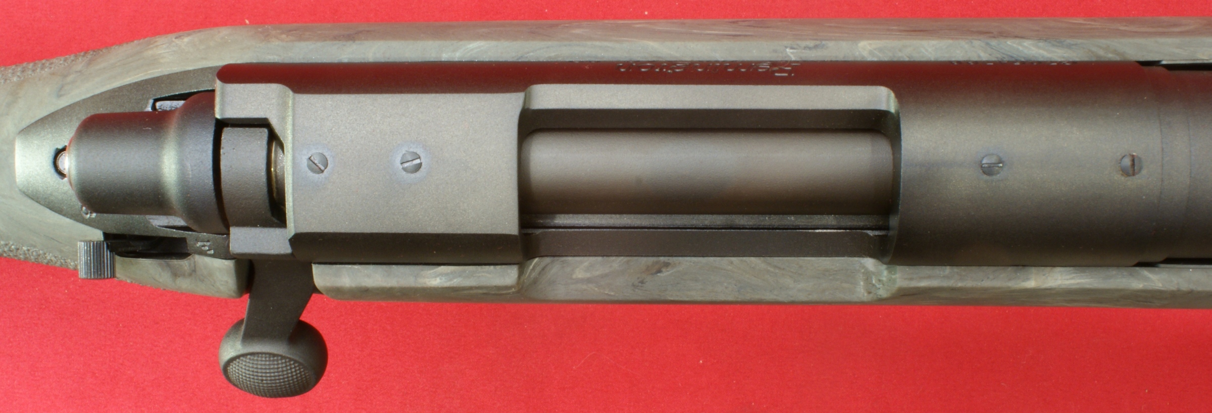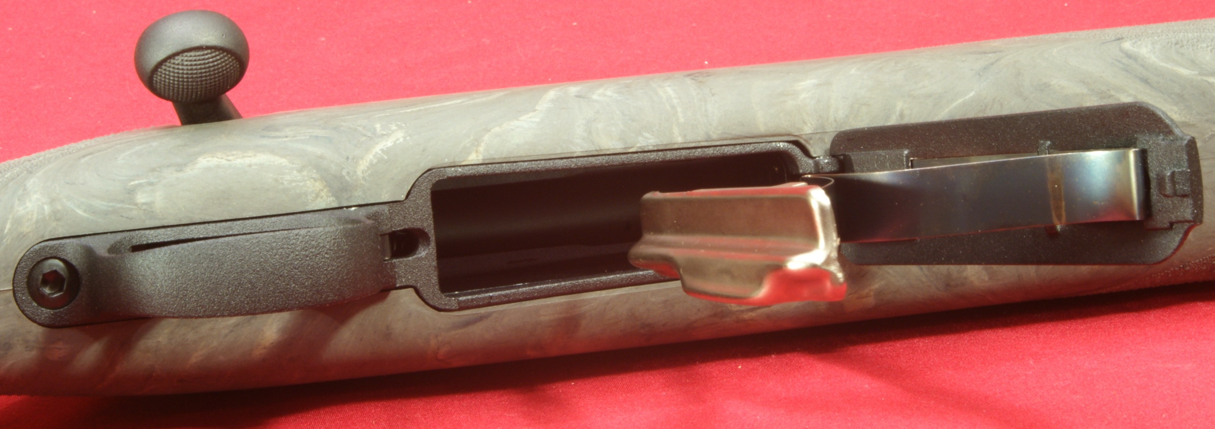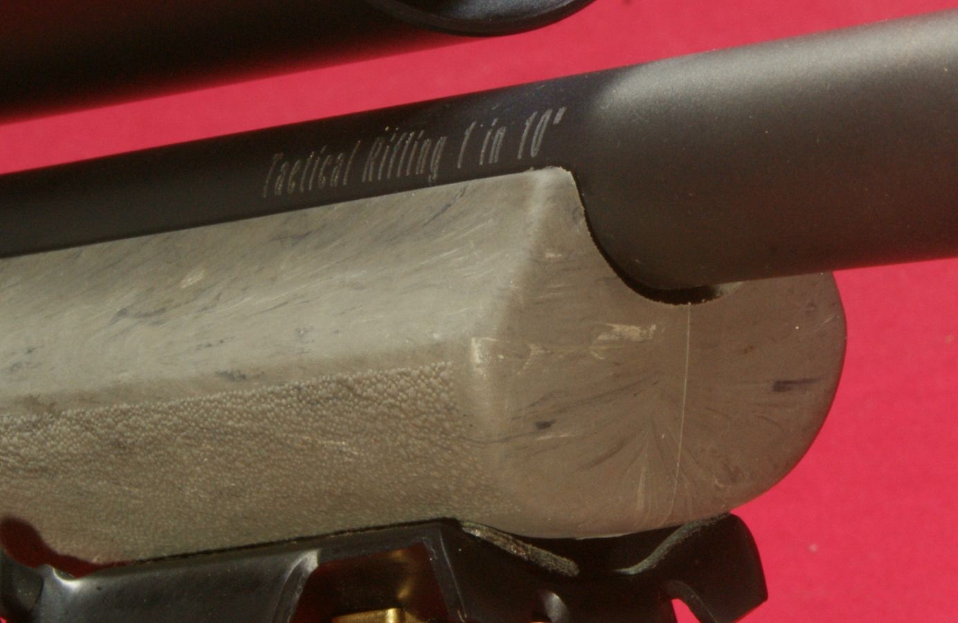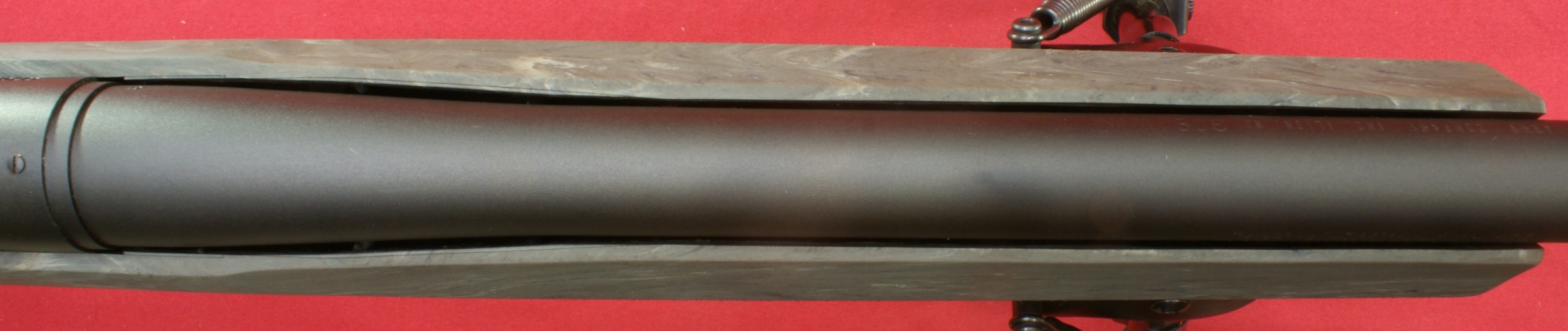 Figure 22 Update 11/30/13: I eventually sanded this area down to give some clearance between the stock and barreland these next two photos show the results. It was very easy to do and I used a Dremel and round sanding drum. I took my time to make sure I kept a professional look by trying not to round the visible edges and trying to keep the curve looking smooth and uniform. The photo below shows the final results. This next photo shows the configuration of the rifle when I took the photo above. Also, the range tests shown in Part 5 were prior to me making this modification. I cannot say for certain that this modification made a big difference in group size, but it did make me feel better. The receiver of the Model 700 SPS Tactical is made from low carbon steel and has the same matte black oxide finish as the barrel. The bolt is also finished with the same matte black oxide finish. The front of the receiver is higher than the rear of the receiver which requires your scope mounts to be at different heights. There are no visible markings on the right side of the receiver when the bolt is down. When you rotate the bolt up, you can see that the serial number of the rifle along with a 2D bar codes is stamped on the receiver. The left side of the receiver is marked with the serial number along with "Remington MODEL 700 AAC-SD". The receiver is drilled and tapped and comes with four plug screws installed. I removed one of the screws as shown below. I'm always amazed at how little thread engagement is used for mounting scopes and wish that manufacturers would shift towards including an integral Picatinny rail section on their receivers. In these next two sets of photos I'm trying to show the receiver and bolt in both the closed and open positions. The bolt has a 90 degree throw for opening and closing. The rifle comes with a two position safety; Safe and Fire. The photos below show the safety in both positions. Also notice that the silver surface which is the end of the firing pin assembly is in the rear (cocked) position in the left photo and is in the forward (fired) position in the right photo. The trigger guard assembly appears to be made primarily from an aluminum alloy and comes with a matte black highly textured finish. The trigger guard assembly comes with a hinged floor plate to allow a simple and quick unload sequence. The magazine capacity on this rifle is 4 rounds. The trigger is made from stainless steel and the rifle includes the Remington X-Mark Pro Trigger System. This trigger system is externally adjustable by a set screw in the top of the trigger. According to the advertising, this trigger comes set at 3.5 pounds and had an adjustable range of 2 pounds (2.5 to 4.5 pounds). My rifle came adjusted to an average of 6.2 pounds based on 10 trigger pulls using my Lyman Trigger Pull Gauge. I was able to adjust it down to an average trigger pull of 5.8 pounds and up to an average of 8.8 pounds. The trigger also had a very crisp pull but was clearly not adjustable in the rage specified by Remington. In front of the trigger is the bolt stop release (stainless steel). By pressing up on the release, you can remove the bolt from the receiver. In front of the bolt stop release is the magazine floor plate latch (black). I measured the length of pull of the rifle to be 13.7". Although drop at heal and comb may seem like a simple measurement, I struggle what represents the line of sight on a split level receiver so I made my measurements from the front (high) area and got a drop at heal of about 1.5" and drop at comb of about 1 ¼" which where the same as the Remington Catalogue. I was very pleased with the marble-ish look of the Hogue Overmolded Ghillie Green Stock. A rear swivel stud is mounted on the rear of the stock. The bottom of the pistol grip area contains a black ring with the Hogue name and symbol. The end of the stock has a Hogue recoil pad. This pad is extremely soft and should do a nice job at helping to reduce the felt recoil of this rifle.