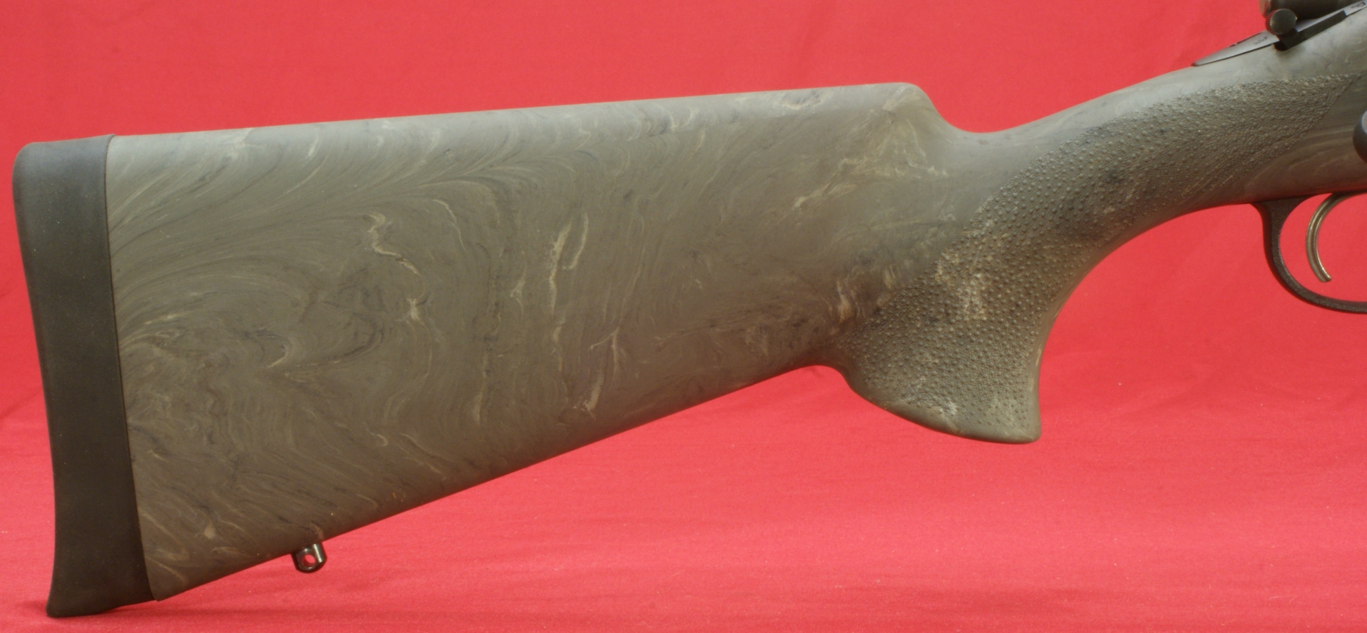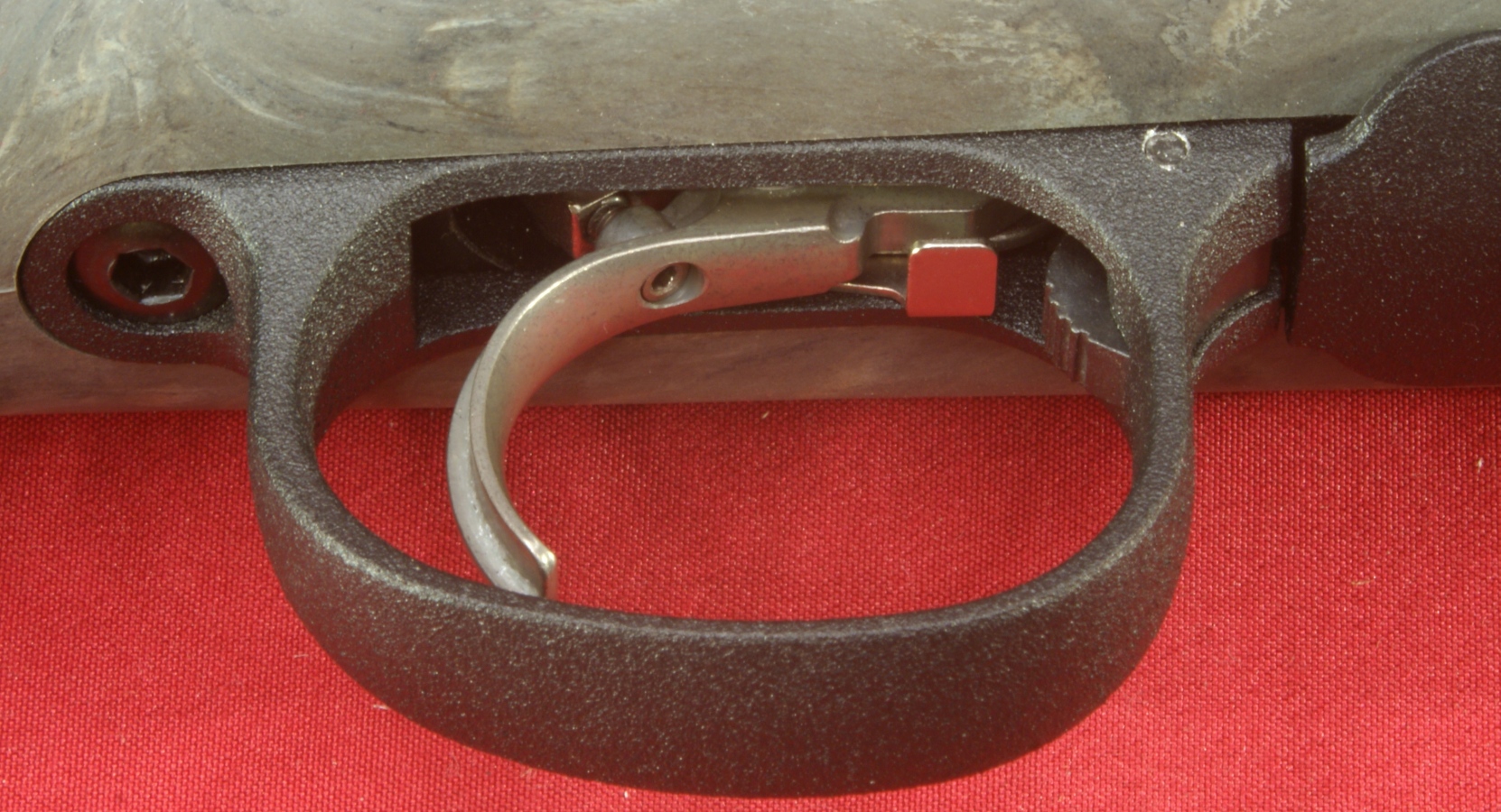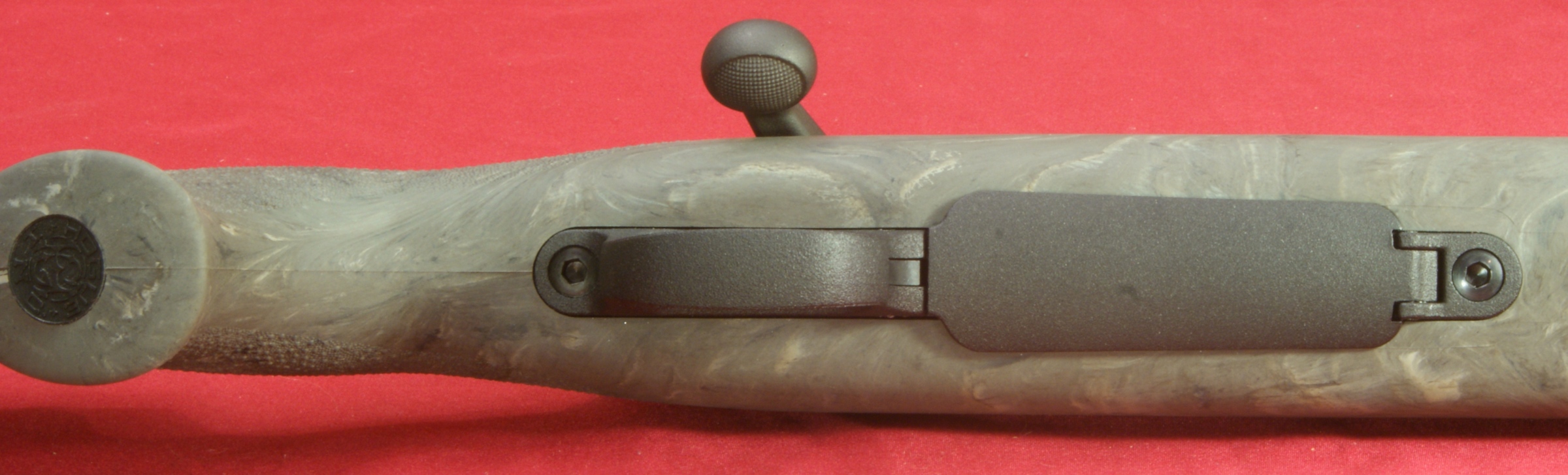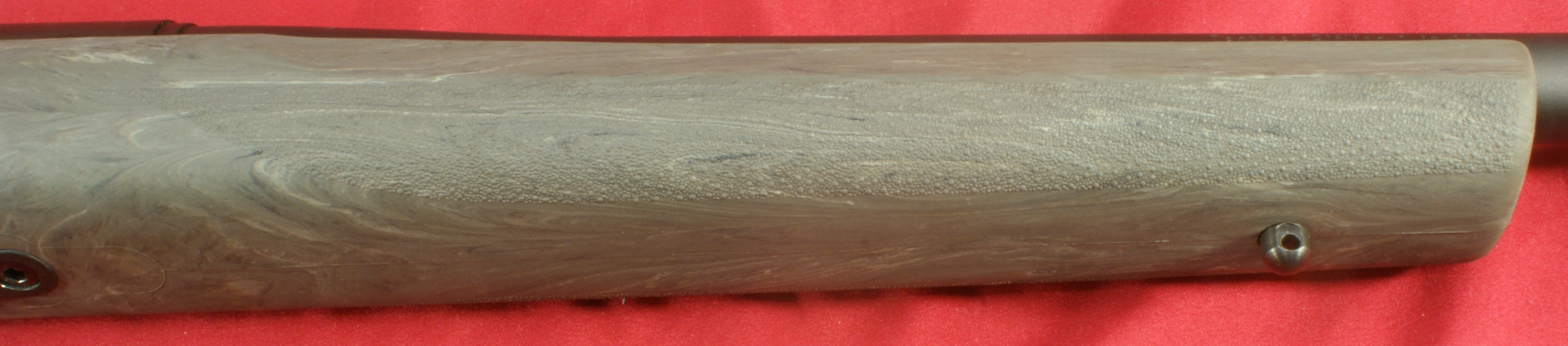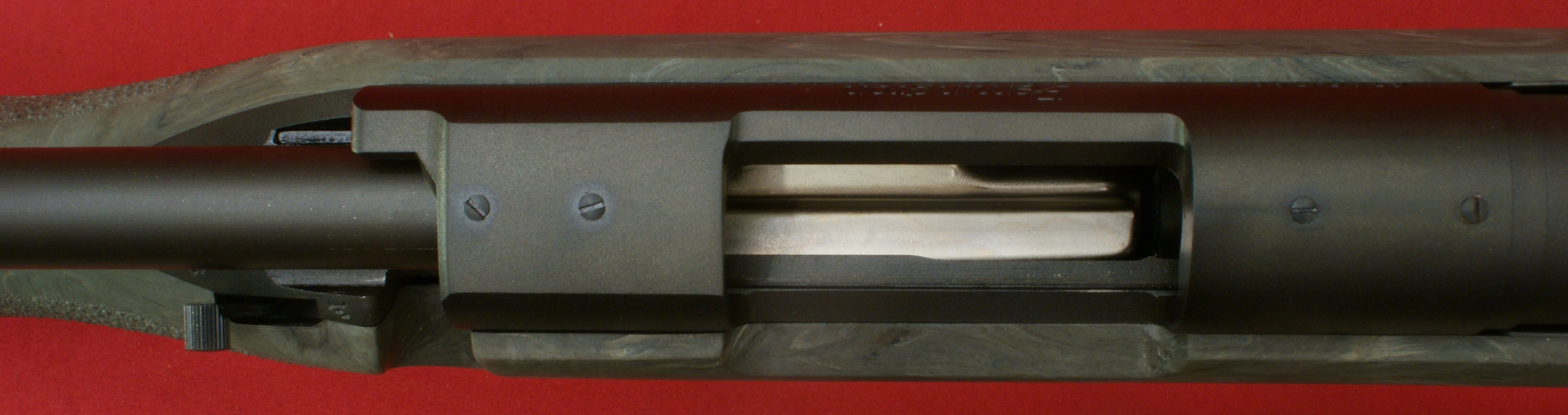 Figure 22 Update 11/30/13: I eventually sanded this area down to give some clearance between the stock and barreland these next two photos show the results. It was very easy to do and I used a Dremel and round sanding drum. I took my time to make sure I kept a professional look by trying not to round the visible edges and trying to keep the curve looking smooth and uniform. The photo below shows the final results. This next photo shows the configuration of the rifle when I took the photo above. Also, the range tests shown in Part 5 were prior to me making this modification. I cannot say for certain that this modification made a big difference in group size, but it did make me feel better. The receiver of the Model 700 SPS Tactical is made from low carbon steel and has the same matte black oxide finish as the barrel. The bolt is also finished with the same matte black oxide finish. The front of the receiver is higher than the rear of the receiver which requires your scope mounts to be at different heights. There are no visible markings on the right side of the receiver when the bolt is down. When you rotate the bolt up, you can see that the serial number of the rifle along with a 2D bar codes is stamped on the receiver. The left side of the receiver is marked with the serial number along with "Remington MODEL 700 AAC-SD". The receiver is drilled and tapped and comes with four plug screws installed. I removed one of the screws as shown below. I'm always amazed at how little thread engagement is used for mounting scopes and wish that manufacturers would shift towards including an integral Picatinny rail section on their receivers. In these next two sets of photos I'm trying to show the receiver and bolt in both the closed and open positions. The bolt has a 90 degree throw for opening and closing. The rifle comes with a two position safety; Safe and Fire. The photos below show the safety in both positions. Also notice that the silver surface which is the end of the firing pin assembly is in the rear (cocked) position in the left photo and is in the forward (fired) position in the right photo. The trigger guard assembly appears to be made primarily from an aluminum alloy and comes with a matte black highly textured finish. The trigger guard assembly comes with a hinged floor plate to allow a simple and quick unload sequence. The magazine capacity on this rifle is 4 rounds. The trigger is made from stainless steel and the rifle includes the Remington X-Mark Pro Trigger System. This trigger system is externally adjustable by a set screw in the top of the trigger. According to the advertising, this trigger comes set at 3.5 pounds and had an adjustable range of 2 pounds (2.5 to 4.5 pounds). My rifle came adjusted to an average of 6.2 pounds based on 10 trigger pulls using my Lyman Trigger Pull Gauge. I was able to adjust it down to an average trigger pull of 5.8 pounds and up to an average of 8.8 pounds. The trigger also had a very crisp pull but was clearly not adjustable in the rage specified by Remington. In front of the trigger is the bolt stop release (stainless steel). By pressing up on the release, you can remove the bolt from the receiver. In front of the bolt stop release is the magazine floor plate latch (black). I measured the length of pull of the rifle to be 13.7". Although drop at heal and comb may seem like a simple measurement, I struggle what represents the line of sight on a split level receiver so I made my measurements from the front (high) area and got a drop at heal of about 1.5" and drop at comb of about 1 ¼" which where the same as the Remington Catalogue. I was very pleased with the marble-ish look of the Hogue Overmolded Ghillie Green Stock. A rear swivel stud is mounted on the rear of the stock. The bottom of the pistol grip area contains a black ring with the Hogue name and symbol. The end of the stock has a Hogue recoil pad. This pad is extremely soft and should do a nice job at helping to reduce the felt recoil of this rifle.