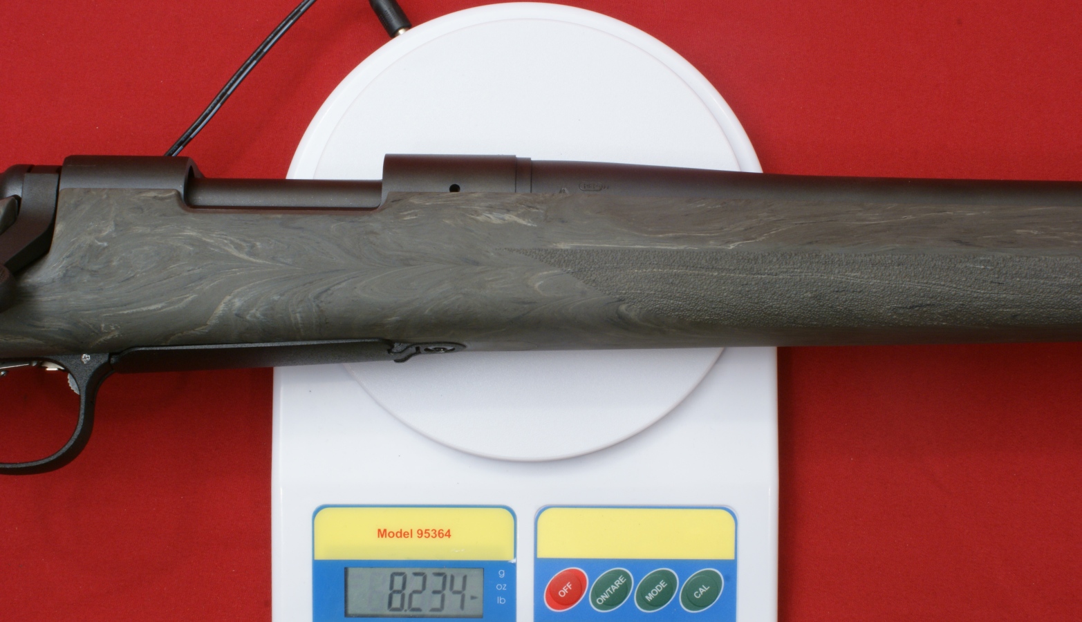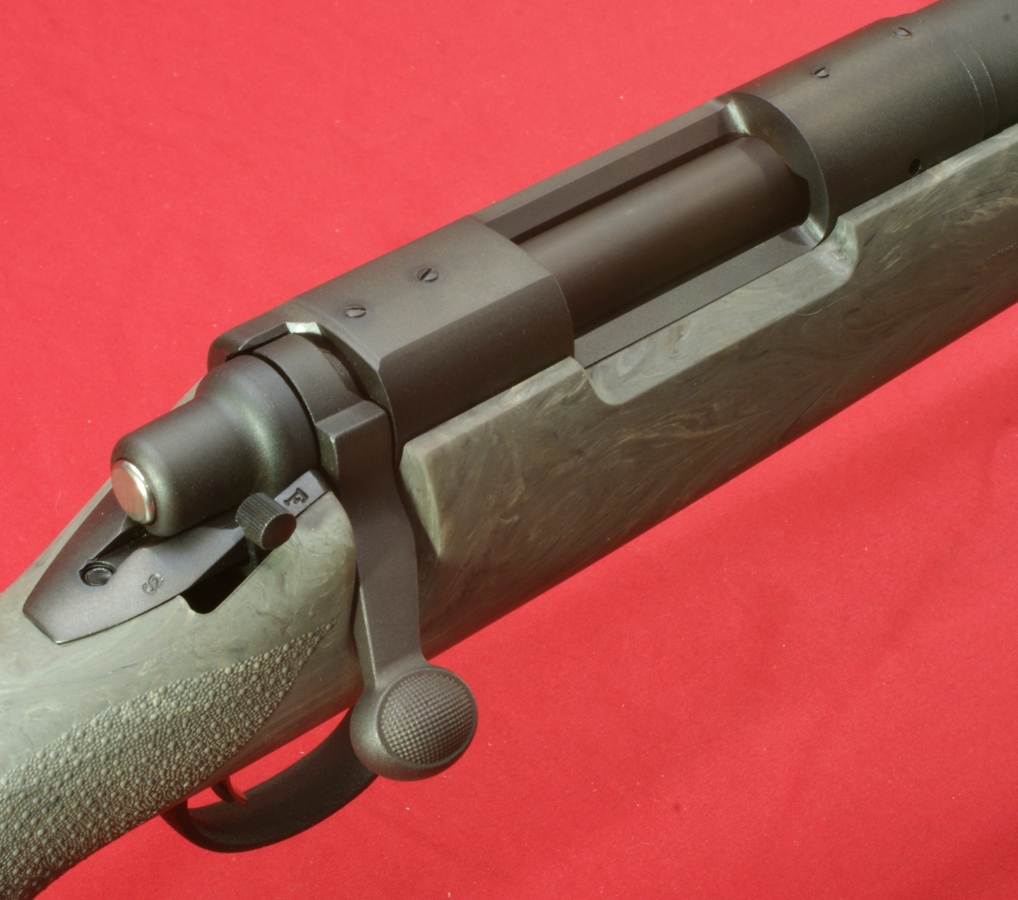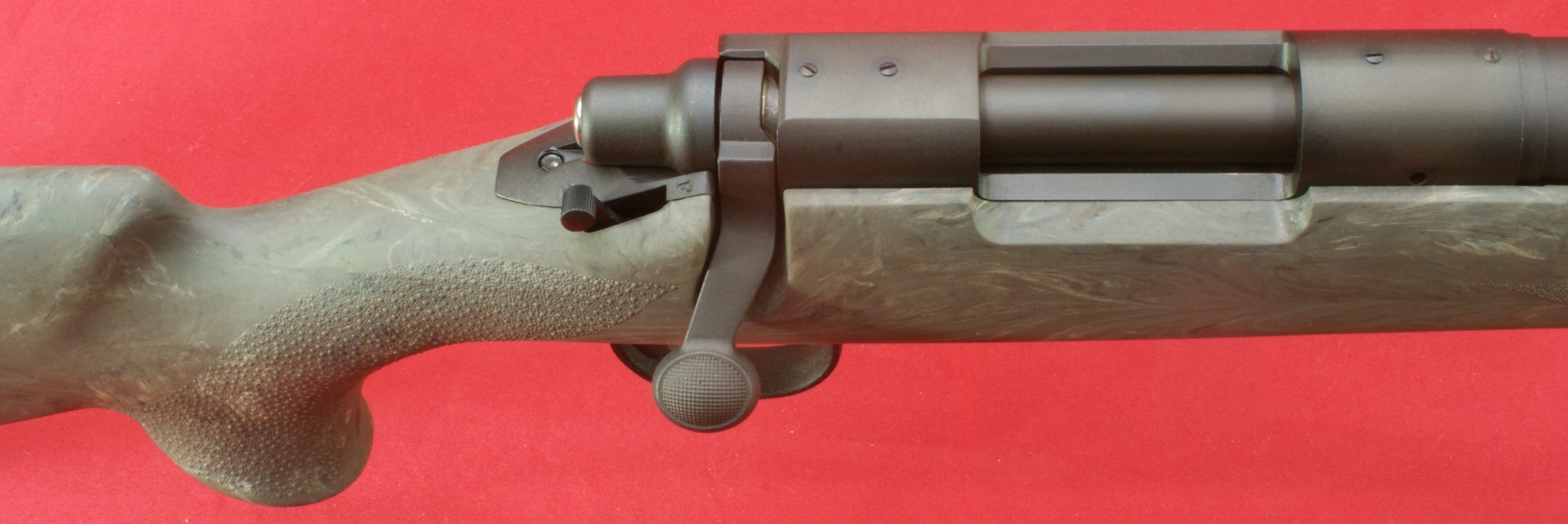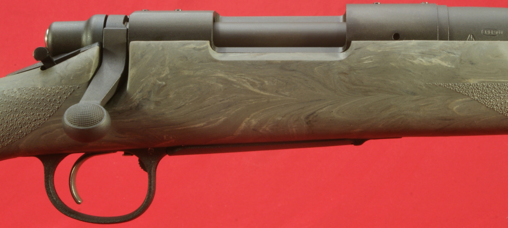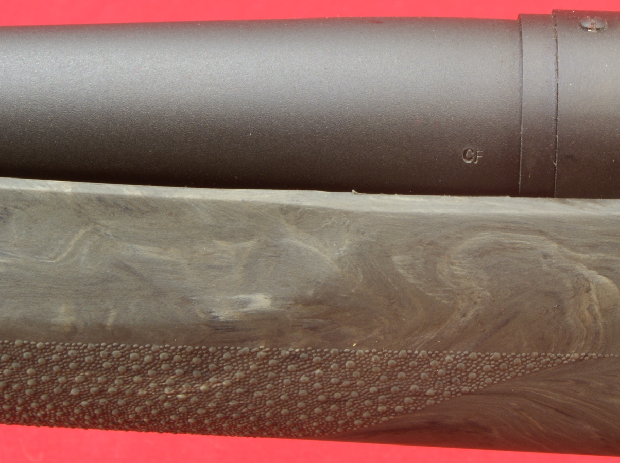 Figure 22 Update 11/30/13: I eventually sanded this area down to give some clearance between the stock and barreland these next two photos show the results. It was very easy to do and I used a Dremel and round sanding drum. I took my time to make sure I kept a professional look by trying not to round the visible edges and trying to keep the curve looking smooth and uniform. The photo below shows the final results. This next photo shows the configuration of the rifle when I took the photo above. Also, the range tests shown in Part 5 were prior to me making this modification. I cannot say for certain that this modification made a big difference in group size, but it did make me feel better. The receiver of the Model 700 SPS Tactical is made from low carbon steel and has the same matte black oxide finish as the barrel. The bolt is also finished with the same matte black oxide finish. The front of the receiver is higher than the rear of the receiver which requires your scope mounts to be at different heights. There are no visible markings on the right side of the receiver when the bolt is down. When you rotate the bolt up, you can see that the serial number of the rifle along with a 2D bar codes is stamped on the receiver. The left side of the receiver is marked with the serial number along with "Remington MODEL 700 AAC-SD". The receiver is drilled and tapped and comes with four plug screws installed. I removed one of the screws as shown below. I'm always amazed at how little thread engagement is used for mounting scopes and wish that manufacturers would shift towards including an integral Picatinny rail section on their receivers. In these next two sets of photos I'm trying to show the receiver and bolt in both the closed and open positions. The bolt has a 90 degree throw for opening and closing. The rifle comes with a two position safety; Safe and Fire. The photos below show the safety in both positions. Also notice that the silver surface which is the end of the firing pin assembly is in the rear (cocked) position in the left photo and is in the forward (fired) position in the right photo. The trigger guard assembly appears to be made primarily from an aluminum alloy and comes with a matte black highly textured finish. The trigger guard assembly comes with a hinged floor plate to allow a simple and quick unload sequence. The magazine capacity on this rifle is 4 rounds. The trigger is made from stainless steel and the rifle includes the Remington X-Mark Pro Trigger System. This trigger system is externally adjustable by a set screw in the top of the trigger. According to the advertising, this trigger comes set at 3.5 pounds and had an adjustable range of 2 pounds (2.5 to 4.5 pounds). My rifle came adjusted to an average of 6.2 pounds based on 10 trigger pulls using my Lyman Trigger Pull Gauge. I was able to adjust it down to an average trigger pull of 5.8 pounds and up to an average of 8.8 pounds. The trigger also had a very crisp pull but was clearly not adjustable in the rage specified by Remington. In front of the trigger is the bolt stop release (stainless steel). By pressing up on the release, you can remove the bolt from the receiver. In front of the bolt stop release is the magazine floor plate latch (black). I measured the length of pull of the rifle to be 13.7". Although drop at heal and comb may seem like a simple measurement, I struggle what represents the line of sight on a split level receiver so I made my measurements from the front (high) area and got a drop at heal of about 1.5" and drop at comb of about 1 ¼" which where the same as the Remington Catalogue. I was very pleased with the marble-ish look of the Hogue Overmolded Ghillie Green Stock. A rear swivel stud is mounted on the rear of the stock. The bottom of the pistol grip area contains a black ring with the Hogue name and symbol. The end of the stock has a Hogue recoil pad. This pad is extremely soft and should do a nice job at helping to reduce the felt recoil of this rifle.