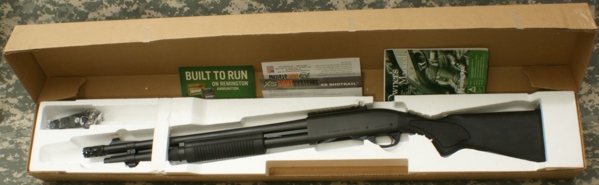 Remington 870 Express Tactical Review When you purchase the Remington Model 870 Express Tactical Shotgun, it will come boxed as shown below. The photo below shows the label that was on the end of the box which gives all the critical information; identifying model number, serial number and basic description of the key features of the shotgun. When you open the box, you see the shotgun comes fully assembled and is packed in a foam liner as shown below. The packing is clearly nothing fancy, but the gun is well protected for transportation purposes.