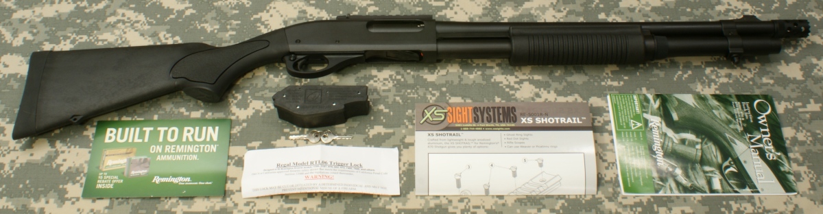 Inside the box were the shotgun, gun lock & instructions, Owner's Manual, XS Shotrail Installation & Adjustment Instructions, and a card for a rebate on Remington Ammo. Also, not shown in the photo below, was the Magazine Extension Kit Instruction Folder that was tucked inside the Owner's Manual. Since I was not able to find linkable web documents for the XS Shotrail and Magazine Extension Kit, I scanned these documents and you can see them below. You will need to click on these images to see the detail. The next two photos are provided to give you basic views of the shotgun. By clicking these photos (or typically any other photo in my reviews), a high resolution image will be displayed.