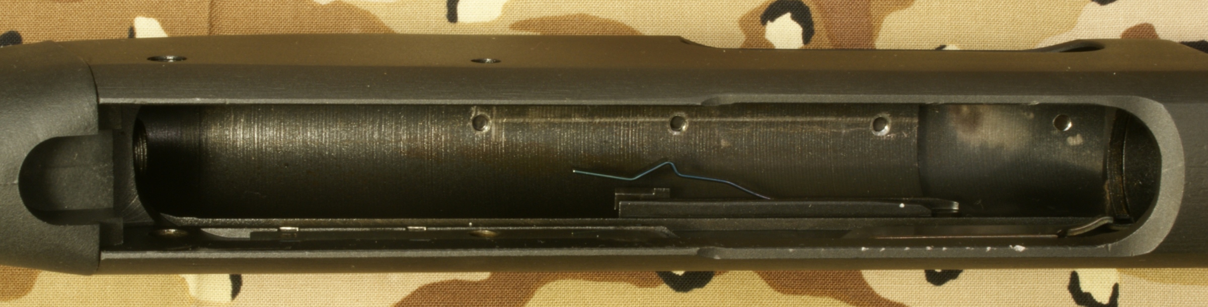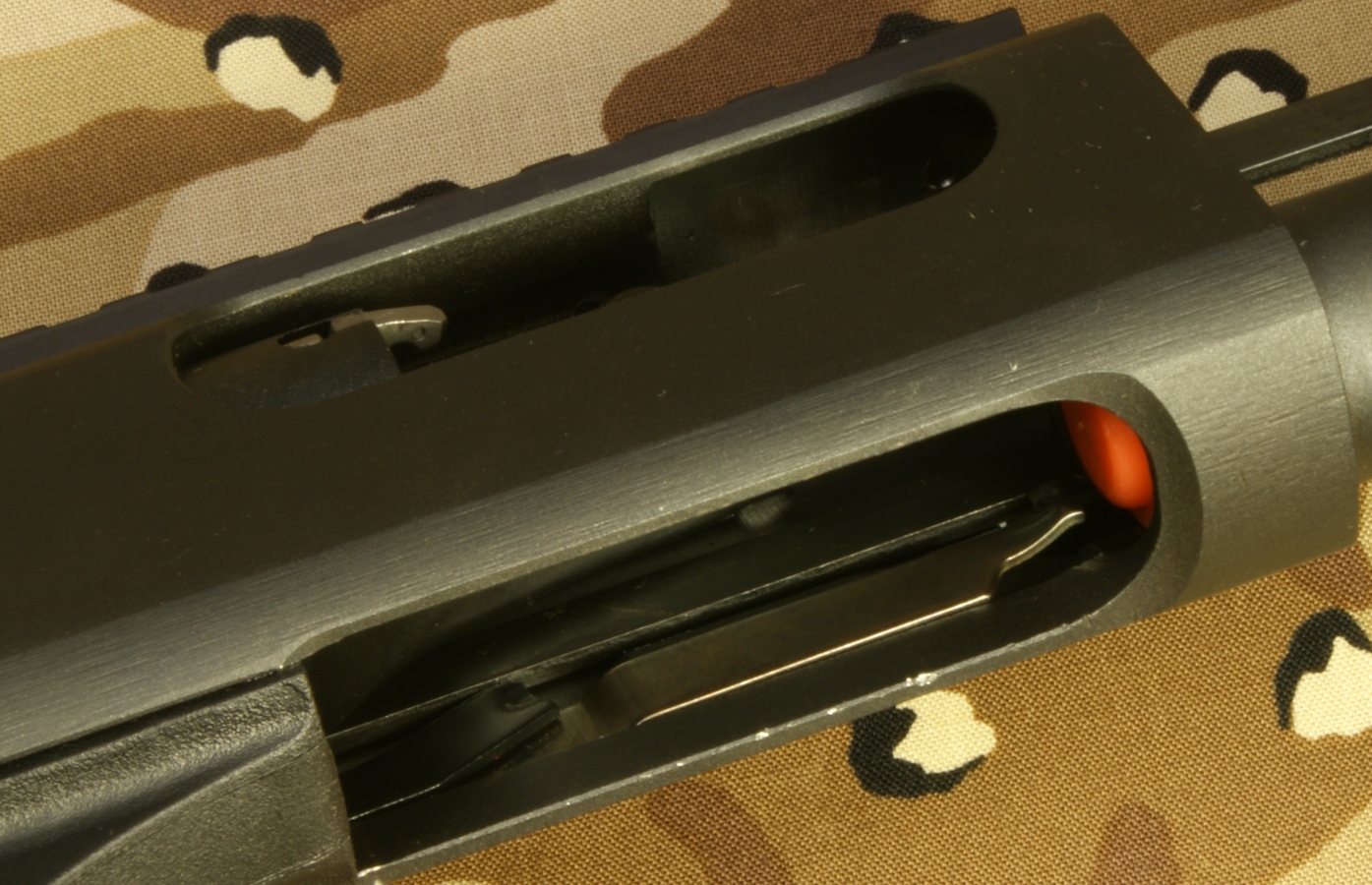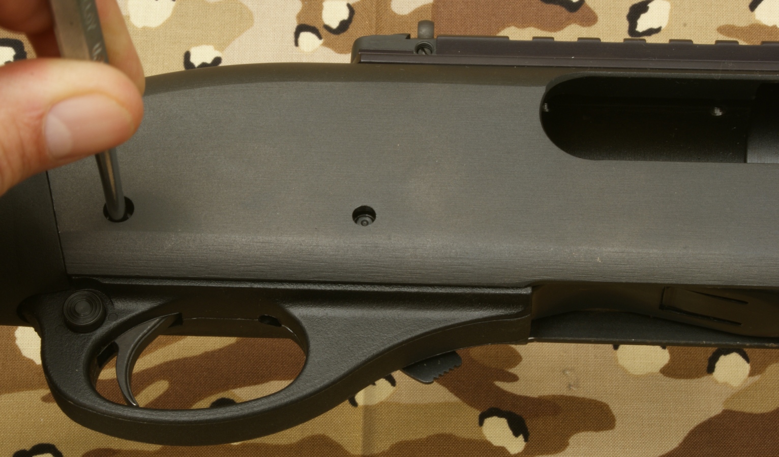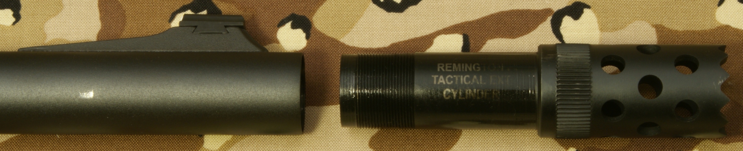 Remington 870 Express Tactical Review In this part of the review, I'm going to cover basic disassembly of the shotgun for normal cleaning and show some of the internal features of the shotgun. Although I show many photos and give comments on the steps for disassembly, you should always refer to the manufacturer's Owner's Manual as the official source for these instructions. Also you should always make sure your firearm is unloaded and on safety prior to any disassembly. Step 1: Removal of the 2-Shot Extension Tube To remove the 2-shot extension tube, you must remove the extension swivel assembly by removing the screw using a flat head screwdriver. With the screw removed, the swivel assembly will slide over choke tube. The actual extension tube can be removed at the same time that you remove the magazine cap. Remember that the magazine spring is held in place by the cap/extension tube, so you should be careful once the cap is screwed off the magazine tube because the spring is under compression. The 2-shot extension tube is actually threaded into the magazine cap and can be removed if needed. Step 2: Removal of the Barrel With the magazine cap removed and the action at about mid travel, you are able to pull the barrel out of the receiver and off the magazine tube. The circled "REP" mark below (left photo) on the chamber end of the barrel stands for "Remington English Proof". This mark is applied after the firearm has passed it's proof test which consists of shooting the shotgun with a high pressure shell to proof pressure check the shotgun. On the bottom of the barrel is a lug that includes a spring loaded pin that seats in the indents on the magazine nut to keep the nut from working loose when shooting the shotgun. Step 3: Removal of the Tactical Choke Removal of the choke is just a matter of grabbing it with your hand and unscrewing it out of the barrel. This is a "Cylinder" choke that has no constriction and you should be able to shoot nearly any shot or slug without damaging the choke and barrel. In the photo below you can see the threaded area inside the barrel for the choke and also thinness of the front of the barrel. When the choke is removed you should always be careful not to drop the barrel because this thin wall on the end is much easier to bend with impact than when the choke is installed. Step 4: Removal of the Fore-end, Slide Assembly and Breech Bolt With the action all the way open, push up on the carrier from below then press and hold the left shell latch (shiny piece of metal just behind the orange follower shown below) as you slide the fore-end off the magazine tube. The slide assembly rests in the notches of the action bars and the breech bolt assembly sits on top of the slide assembly. When the fore-end is removed, these items may fall off if you are not holding the shotgun level with the barrel up. Step 5: Removal of the Trigger Assembly Removal of the Trigger Assembly is done by pushing out the two trigger plate pins. The rear pin on this shotgun was easy to remove, but the forward pin required the use of a punch throughout the entire effort. With the pins removed, you can pull the trigger assembly out of the receiver. Mine was a snug fit but still came out without a problem. The Normal Disassembled Level for Cleaning This is the level at which Remington identifies (per the Owner's Manual) to disassemble the shotgun for cleaning. The photo below shows all of these basic parts and assemblies. I also agree that you should be able to clean your shotgun at this level.