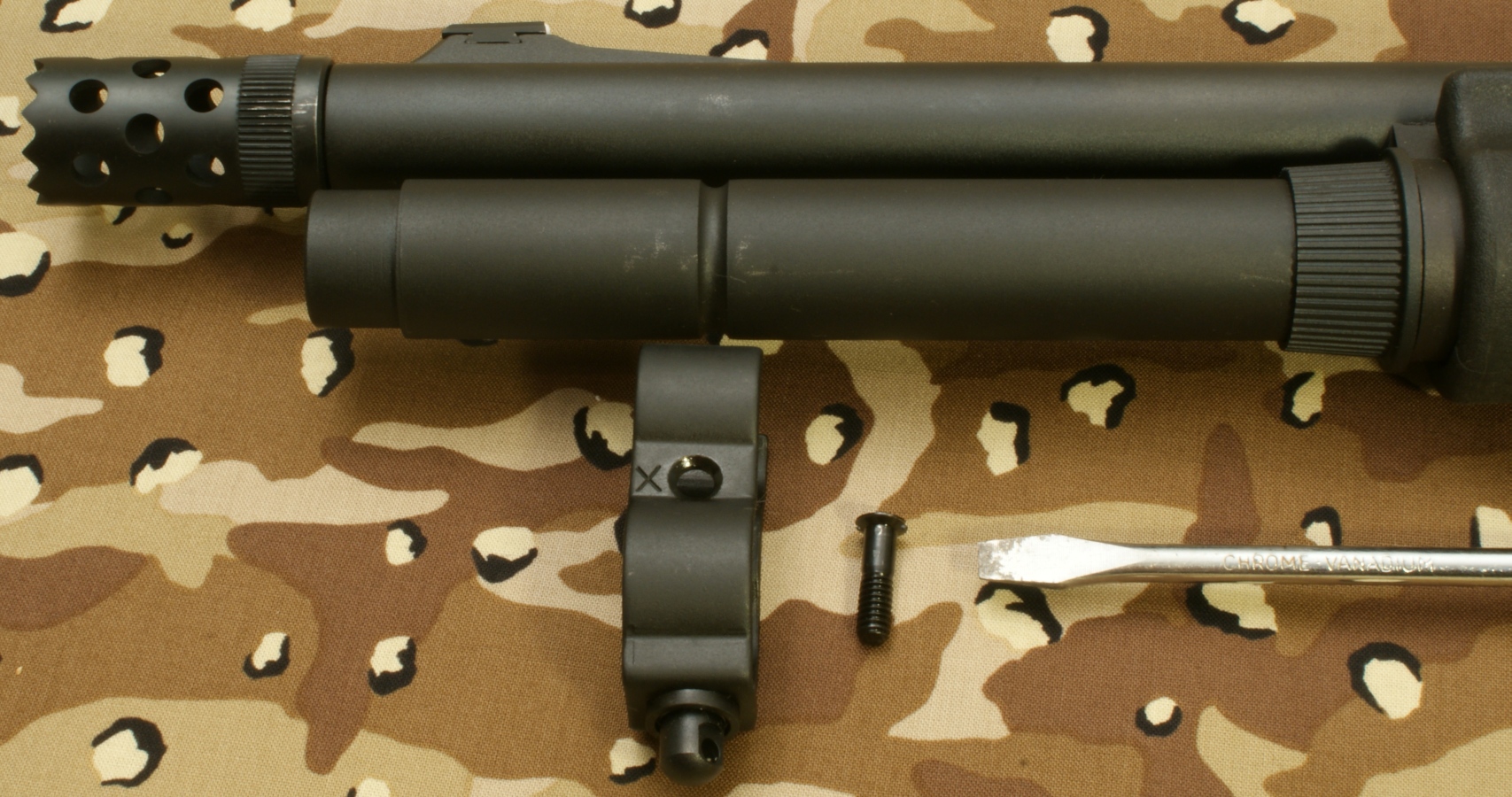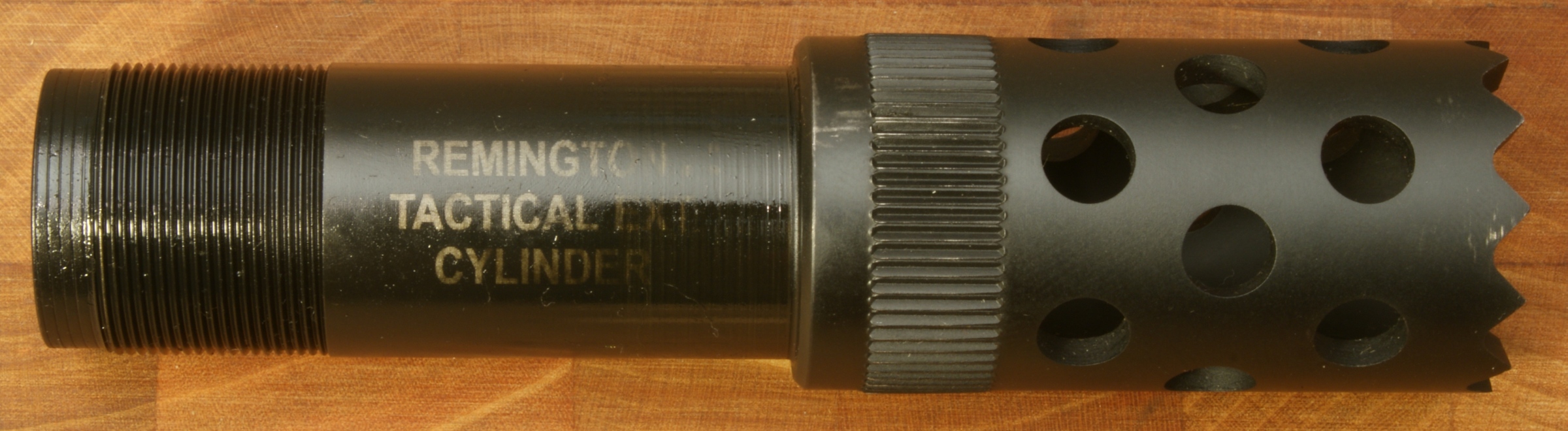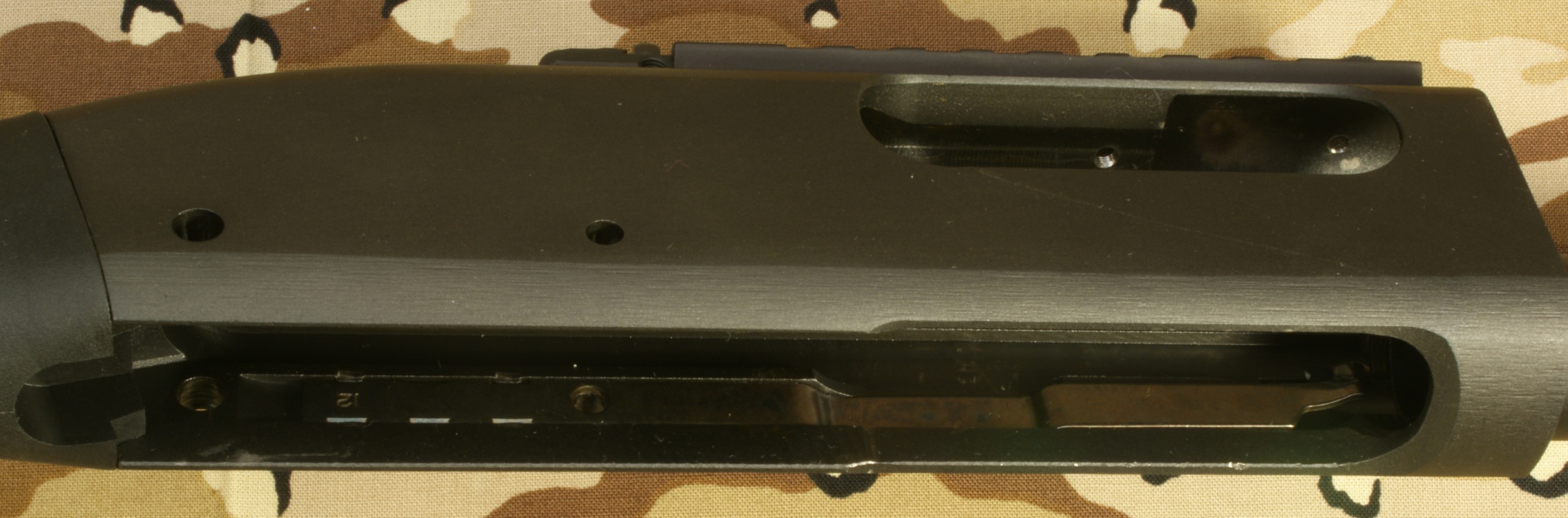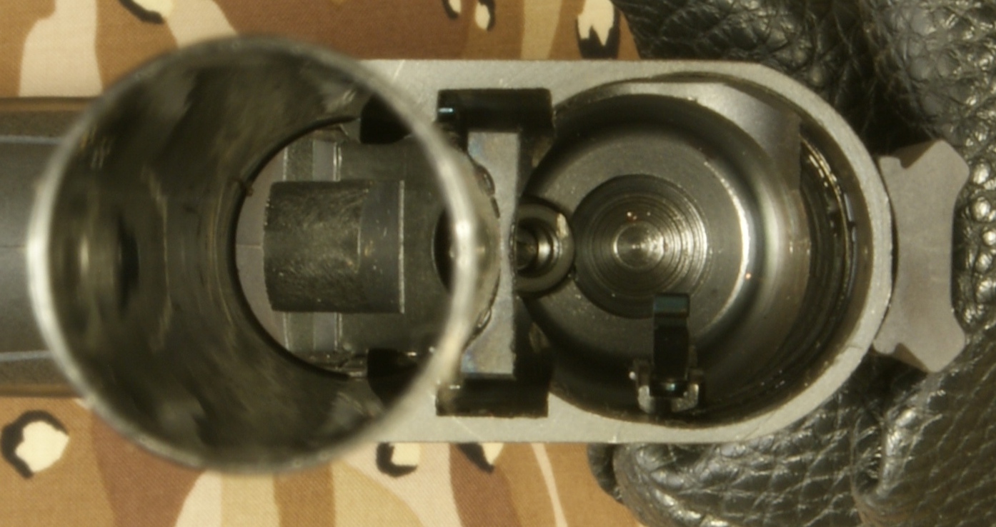 Remington 870 Express Tactical Review In this part of the review, I'm going to cover basic disassembly of the shotgun for normal cleaning and show some of the internal features of the shotgun. Although I show many photos and give comments on the steps for disassembly, you should always refer to the manufacturer's Owner's Manual as the official source for these instructions. Also you should always make sure your firearm is unloaded and on safety prior to any disassembly. Step 1: Removal of the 2-Shot Extension Tube To remove the 2-shot extension tube, you must remove the extension swivel assembly by removing the screw using a flat head screwdriver. With the screw removed, the swivel assembly will slide over choke tube. The actual extension tube can be removed at the same time that you remove the magazine cap. Remember that the magazine spring is held in place by the cap/extension tube, so you should be careful once the cap is screwed off the magazine tube because the spring is under compression. The 2-shot extension tube is actually threaded into the magazine cap and can be removed if needed. Step 2: Removal of the Barrel With the magazine cap removed and the action at about mid travel, you are able to pull the barrel out of the receiver and off the magazine tube. The circled "REP" mark below (left photo) on the chamber end of the barrel stands for "Remington English Proof". This mark is applied after the firearm has passed it's proof test which consists of shooting the shotgun with a high pressure shell to proof pressure check the shotgun. On the bottom of the barrel is a lug that includes a spring loaded pin that seats in the indents on the magazine nut to keep the nut from working loose when shooting the shotgun. Step 3: Removal of the Tactical Choke Removal of the choke is just a matter of grabbing it with your hand and unscrewing it out of the barrel. This is a "Cylinder" choke that has no constriction and you should be able to shoot nearly any shot or slug without damaging the choke and barrel. In the photo below you can see the threaded area inside the barrel for the choke and also thinness of the front of the barrel. When the choke is removed you should always be careful not to drop the barrel because this thin wall on the end is much easier to bend with impact than when the choke is installed. Step 4: Removal of the Fore-end, Slide Assembly and Breech Bolt With the action all the way open, push up on the carrier from below then press and hold the left shell latch (shiny piece of metal just behind the orange follower shown below) as you slide the fore-end off the magazine tube. The slide assembly rests in the notches of the action bars and the breech bolt assembly sits on top of the slide assembly. When the fore-end is removed, these items may fall off if you are not holding the shotgun level with the barrel up. Step 5: Removal of the Trigger Assembly Removal of the Trigger Assembly is done by pushing out the two trigger plate pins. The rear pin on this shotgun was easy to remove, but the forward pin required the use of a punch throughout the entire effort. With the pins removed, you can pull the trigger assembly out of the receiver. Mine was a snug fit but still came out without a problem. The Normal Disassembled Level for Cleaning This is the level at which Remington identifies (per the Owner's Manual) to disassemble the shotgun for cleaning. The photo below shows all of these basic parts and assemblies. I also agree that you should be able to clean your shotgun at this level.
