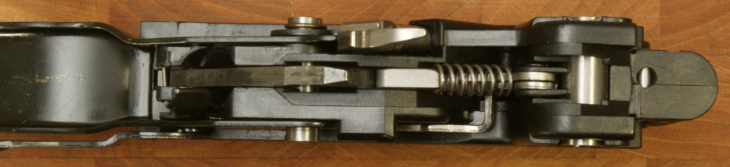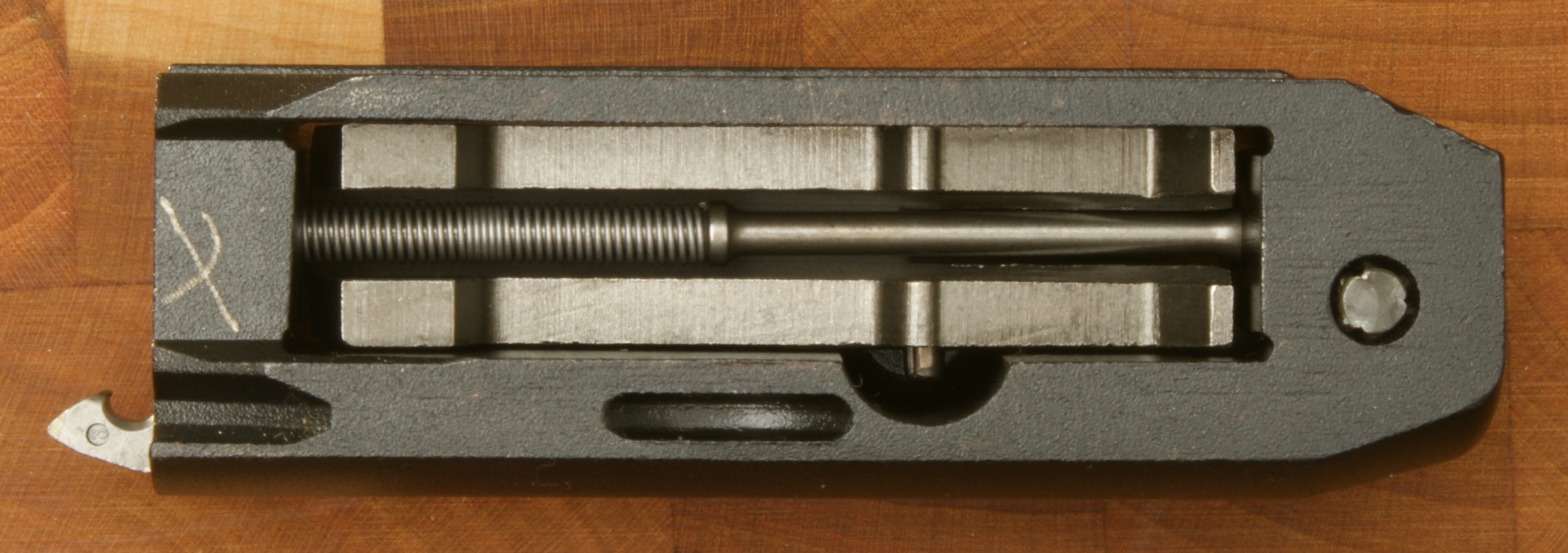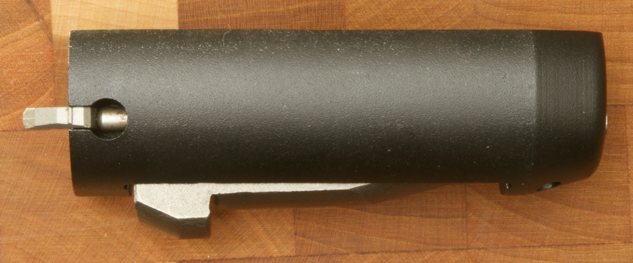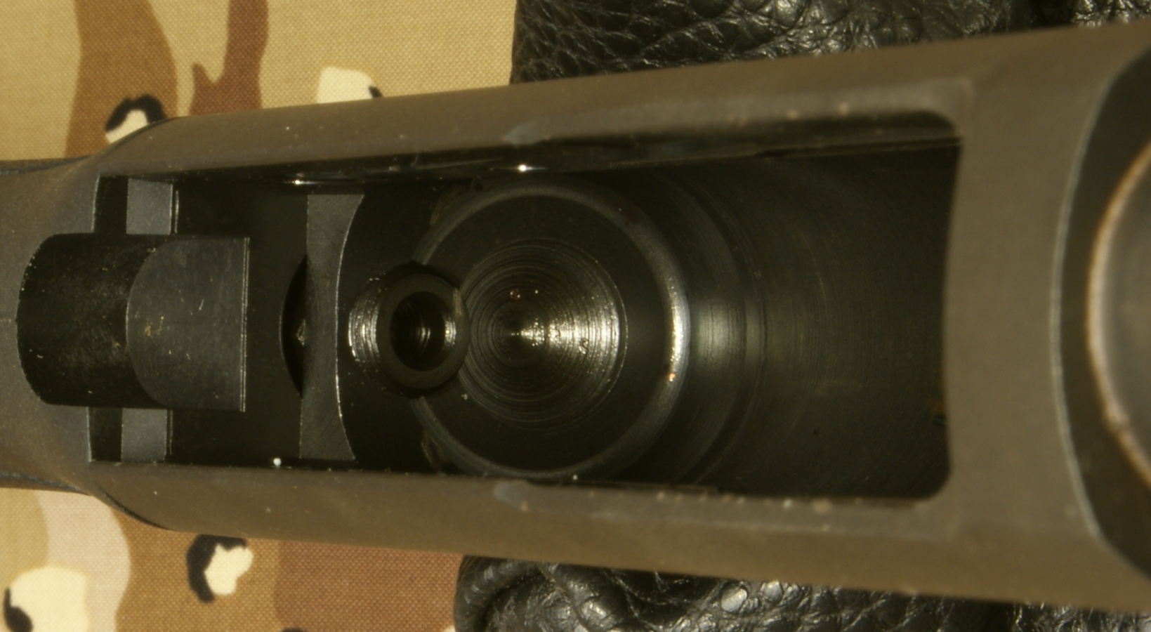 Remington 870 Express Tactical Review In this part of the review, I'm going to cover basic disassembly of the shotgun for normal cleaning and show some of the internal features of the shotgun. Although I show many photos and give comments on the steps for disassembly, you should always refer to the manufacturer's Owner's Manual as the official source for these instructions. Also you should always make sure your firearm is unloaded and on safety prior to any disassembly. Step 1: Removal of the 2-Shot Extension Tube To remove the 2-shot extension tube, you must remove the extension swivel assembly by removing the screw using a flat head screwdriver. With the screw removed, the swivel assembly will slide over choke tube. The actual extension tube can be removed at the same time that you remove the magazine cap. Remember that the magazine spring is held in place by the cap/extension tube, so you should be careful once the cap is screwed off the magazine tube because the spring is under compression. The 2-shot extension tube is actually threaded into the magazine cap and can be removed if needed. Step 2: Removal of the Barrel With the magazine cap removed and the action at about mid travel, you are able to pull the barrel out of the receiver and off the magazine tube. The circled "REP" mark below (left photo) on the chamber end of the barrel stands for "Remington English Proof". This mark is applied after the firearm has passed it's proof test which consists of shooting the shotgun with a high pressure shell to proof pressure check the shotgun. On the bottom of the barrel is a lug that includes a spring loaded pin that seats in the indents on the magazine nut to keep the nut from working loose when shooting the shotgun. Step 3: Removal of the Tactical Choke Removal of the choke is just a matter of grabbing it with your hand and unscrewing it out of the barrel. This is a "Cylinder" choke that has no constriction and you should be able to shoot nearly any shot or slug without damaging the choke and barrel. In the photo below you can see the threaded area inside the barrel for the choke and also thinness of the front of the barrel. When the choke is removed you should always be careful not to drop the barrel because this thin wall on the end is much easier to bend with impact than when the choke is installed. Step 4: Removal of the Fore-end, Slide Assembly and Breech Bolt With the action all the way open, push up on the carrier from below then press and hold the left shell latch (shiny piece of metal just behind the orange follower shown below) as you slide the fore-end off the magazine tube. The slide assembly rests in the notches of the action bars and the breech bolt assembly sits on top of the slide assembly. When the fore-end is removed, these items may fall off if you are not holding the shotgun level with the barrel up. Step 5: Removal of the Trigger Assembly Removal of the Trigger Assembly is done by pushing out the two trigger plate pins. The rear pin on this shotgun was easy to remove, but the forward pin required the use of a punch throughout the entire effort. With the pins removed, you can pull the trigger assembly out of the receiver. Mine was a snug fit but still came out without a problem. The Normal Disassembled Level for Cleaning This is the level at which Remington identifies (per the Owner's Manual) to disassemble the shotgun for cleaning. The photo below shows all of these basic parts and assemblies. I also agree that you should be able to clean your shotgun at this level.