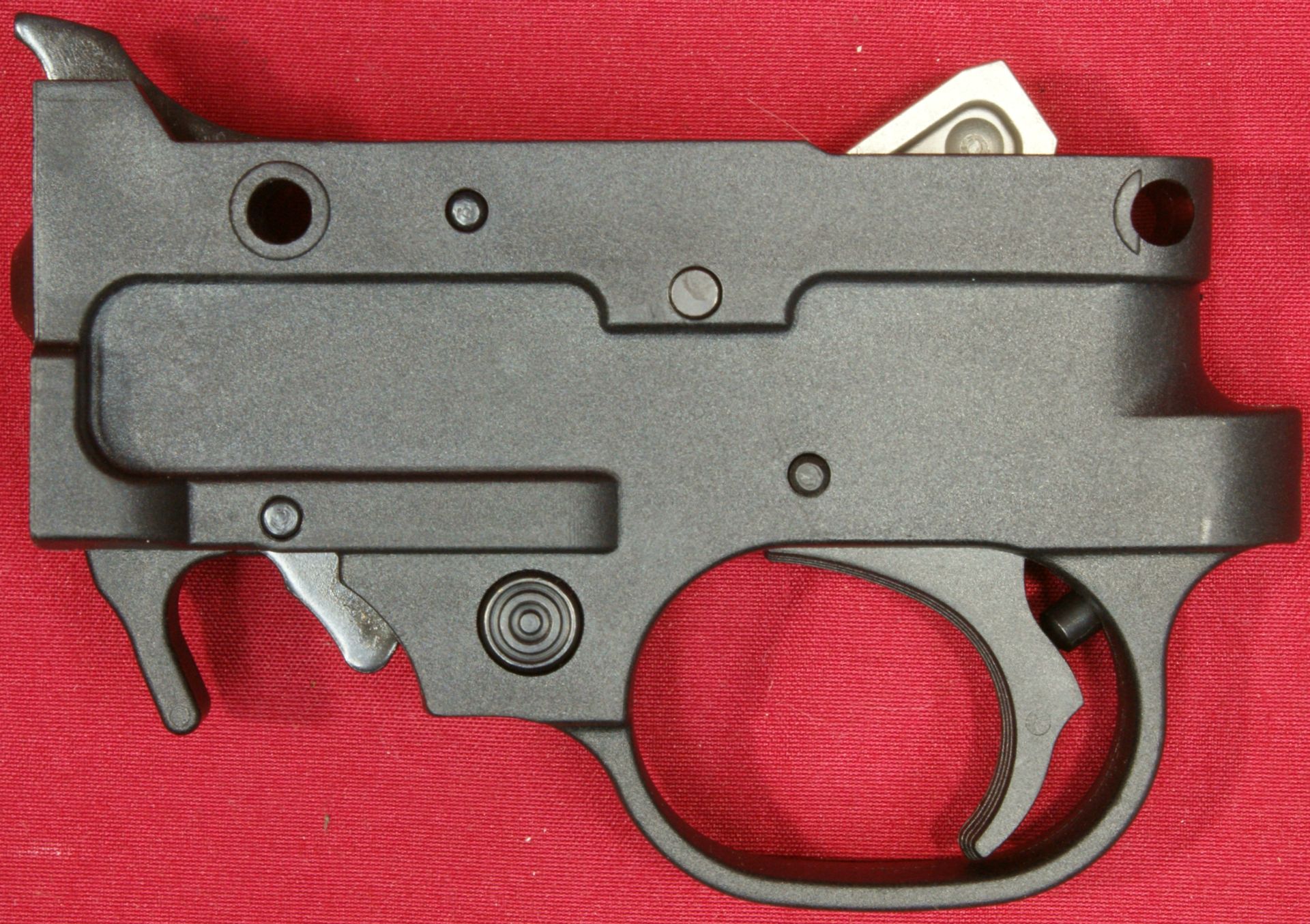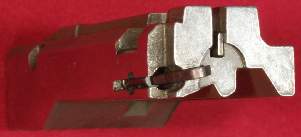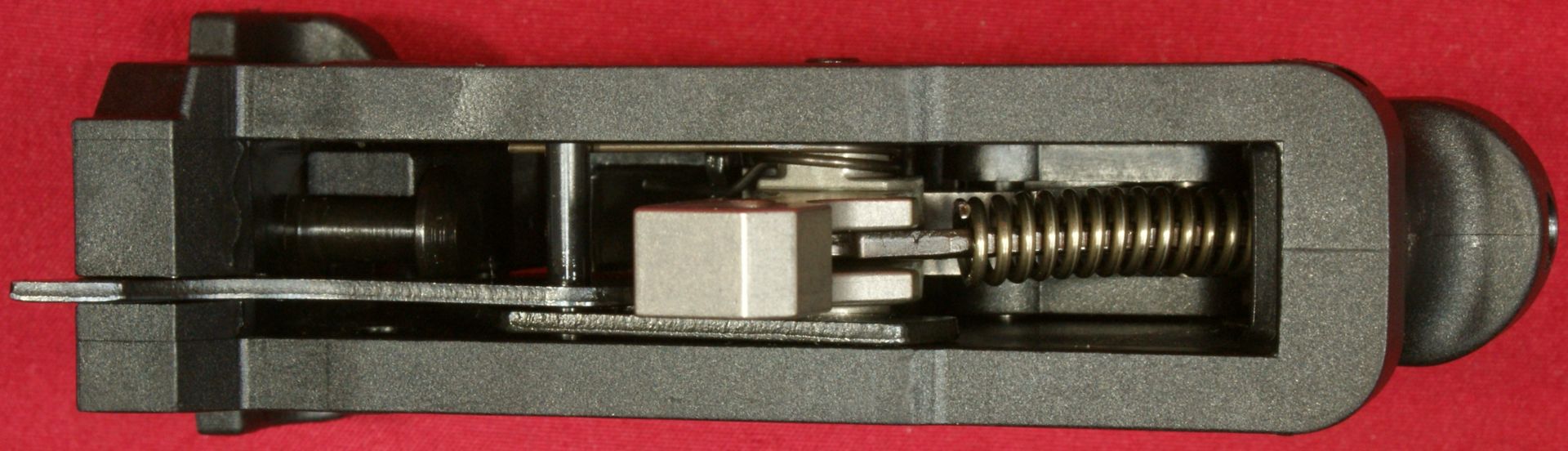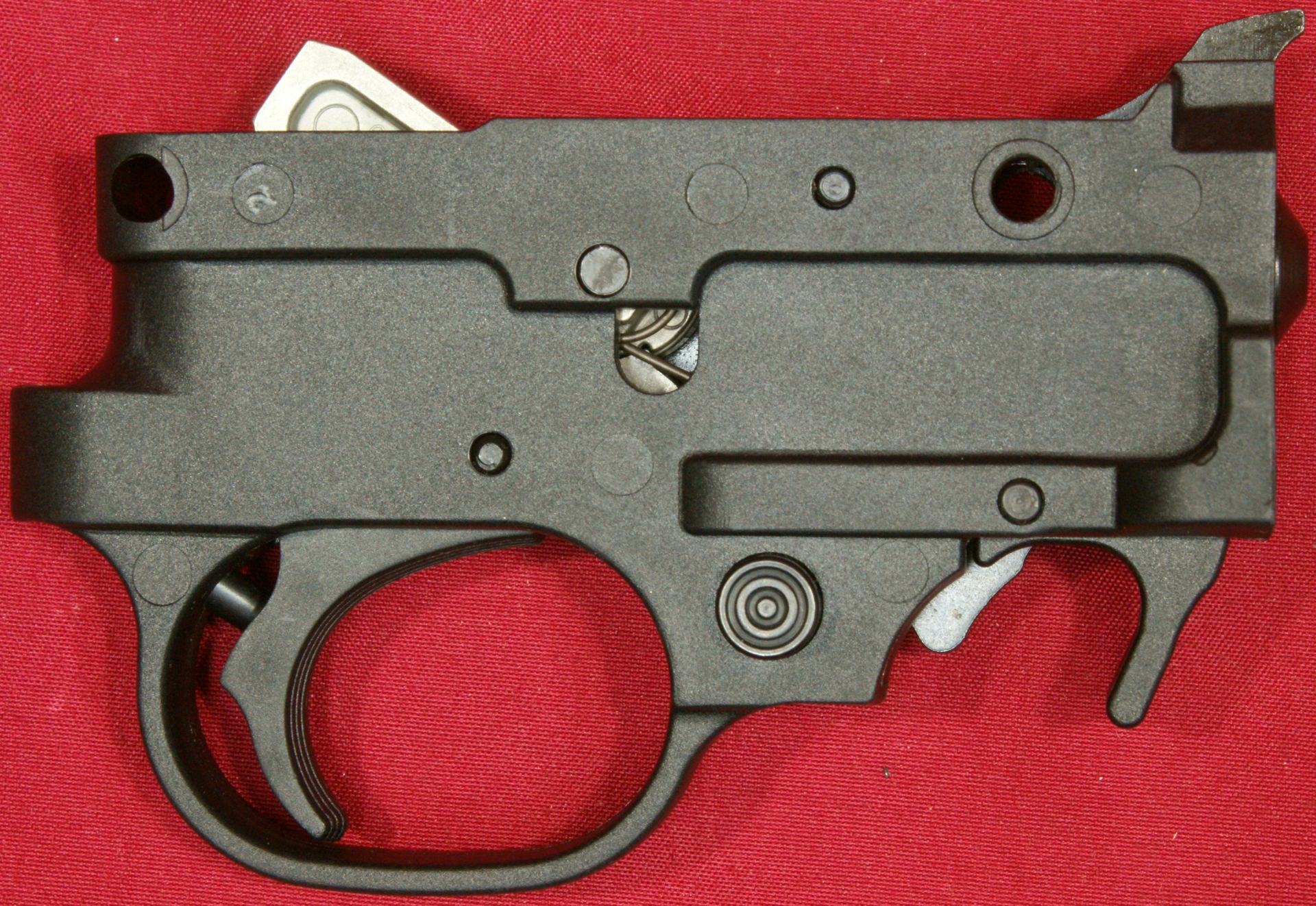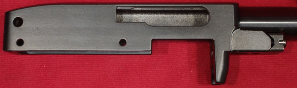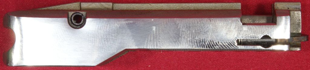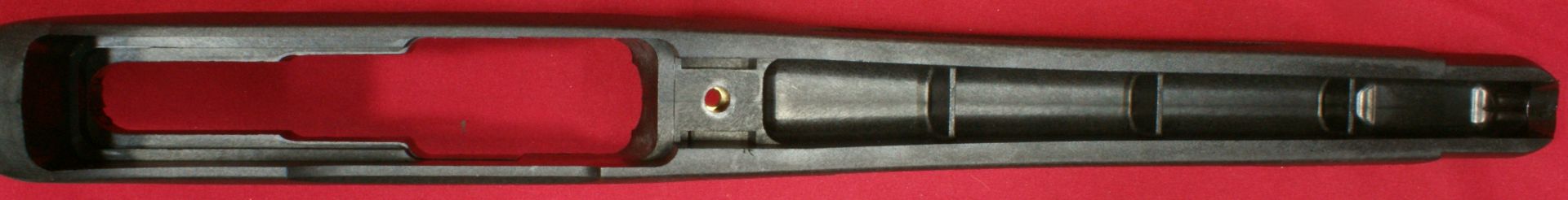 Figure 8 The surface that is exposed through the ejection port is polished to a mirror finish (forgive the finger prints). Other areas are machined as required to produce the desired final dimensions. Clearly areas that are not critical didn't receive the same level of machining based on the tool marks shown below. Cocking Handle, Guide Rod and Recoil Spring Assembly The cocking handle appears to be a MIM part and this assembly is never intended to be disassembled by the user. Trigger Guard Assembly The trigger guard assembly is made up of 27 parts as shown below. The complexity of this assembly is probably why you should think twice before deciding to disassemble the trigger guard assembly. The hammer and sear appear to be made from stainless steel. You can see where the hammer engages the sear by looking through the cutout on the right side of the trigger guard assembly. This cutout allows you the ability to lubricate this surface directly to achieve the best trigger pulls possible. Clearly, looking at the trigger guard assembly you will see that the majority of the components are polymer and the critical components are metallic. I feel this is a good blend of materials to keep costs down and quality up. These next two photos show the hammer in the uncocked position. Below you can see the hammer strut and spring located behind the hammer. The ejector is the piece of metal that sticks forward in front of the hammer. Stock Assembly These photos give you a look at the inside molded areas of the stock. Ruger has added a brass insert to prevent wear on the polymer material that would have been caused by the stock bolt.