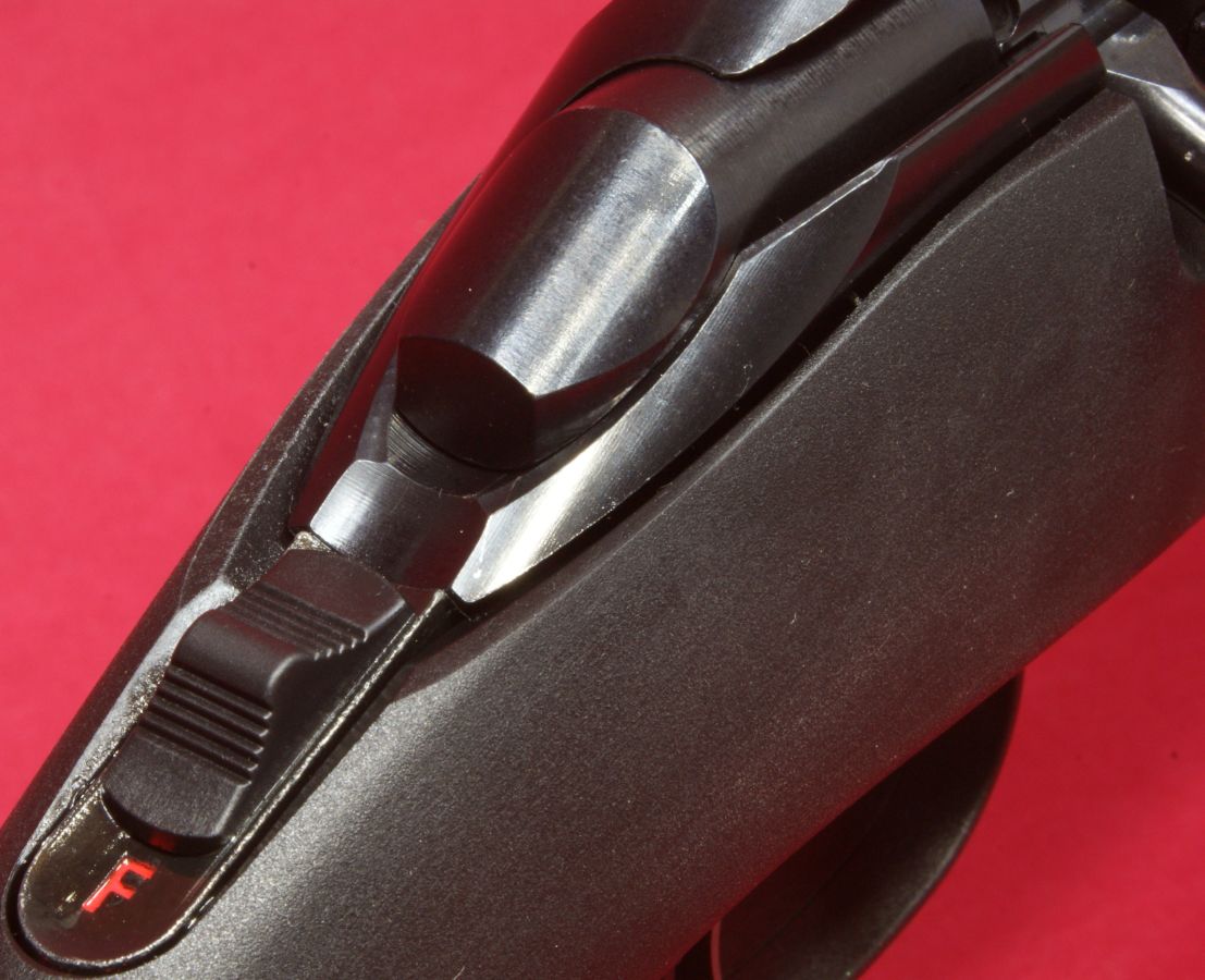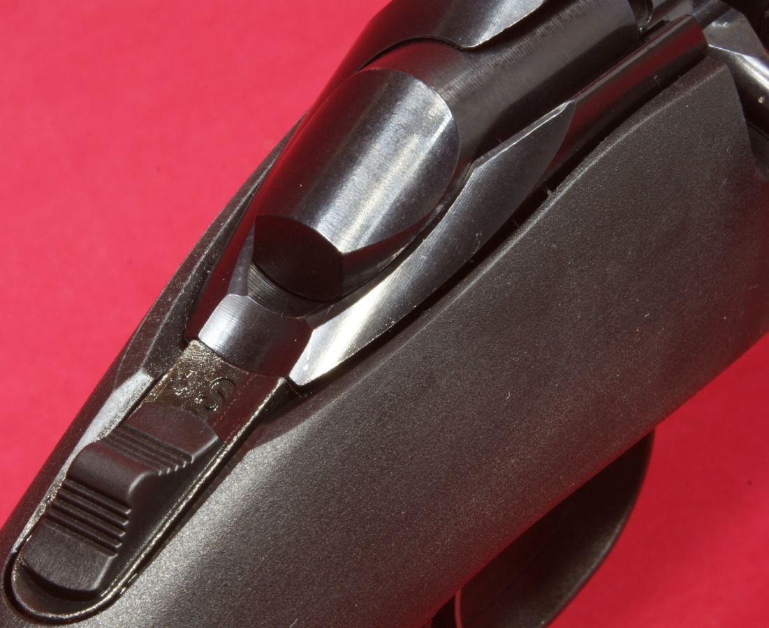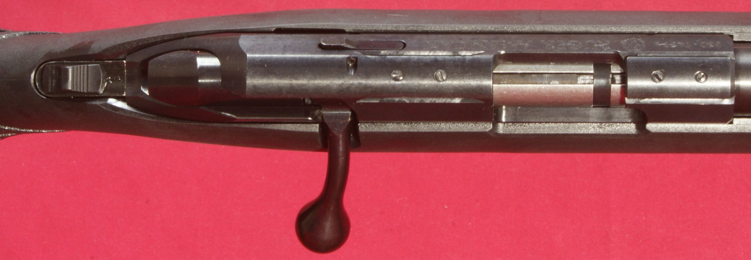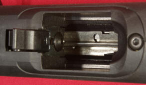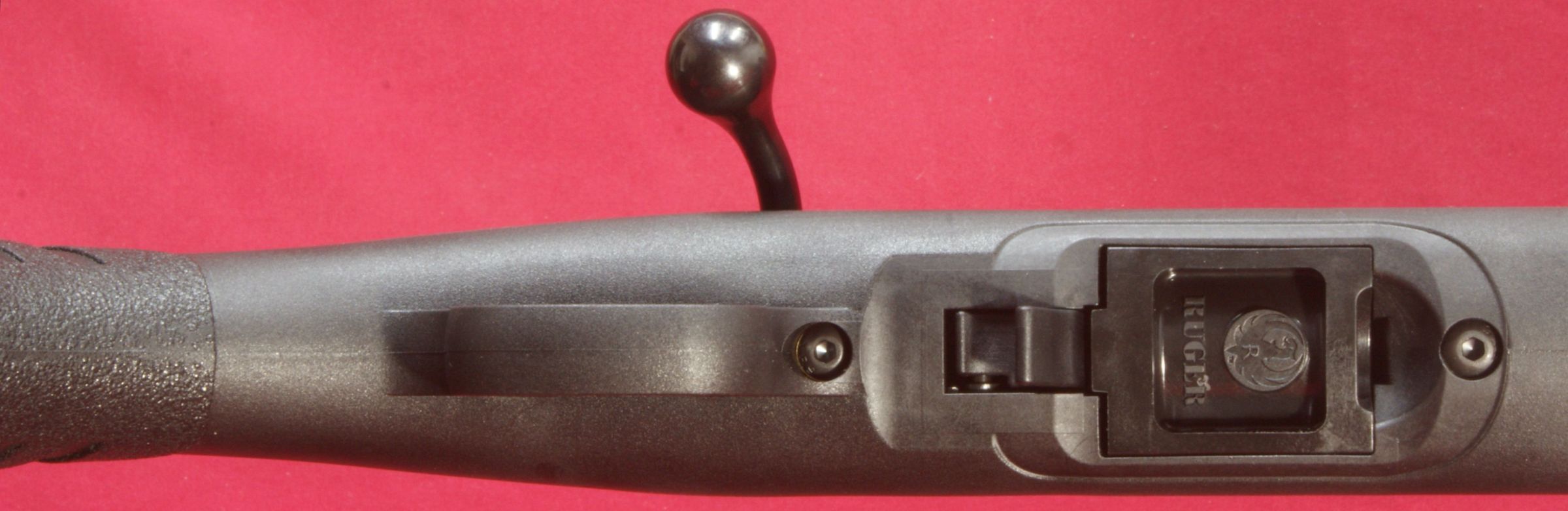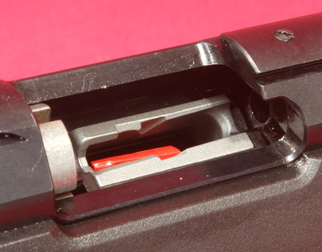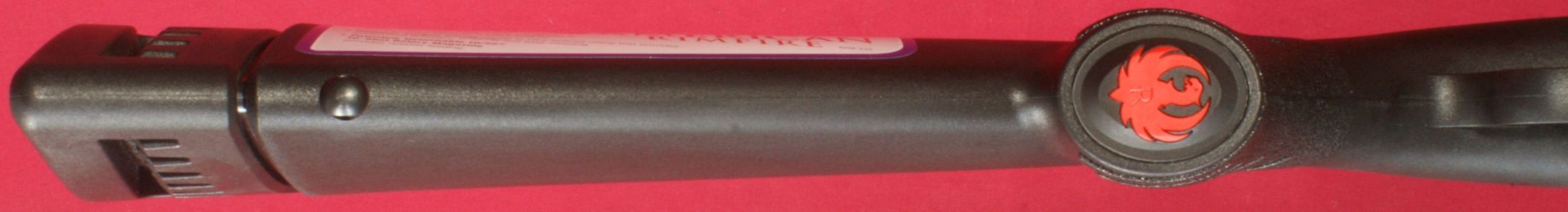 Figure 13 The front sight is held in place with a single screw. I did my normal torque check to make sure it wasn't loose and found it to be tight. The barrel is cold hammer forged from 4140 alloy steel and has a black satin finish. The barrel measured 22.0" in length and has what I think of as a traditional sporter profile. This barrel length should come close to getting the maximum velocity out of high velocity ammunition. The barrel length also provides room for an 18.3" sight radius. At the muzzle, the barrel measures 0.600" in diameter and at the receiver it measures about 0.860" in diameter. The forend includes a ridged area along with texturing to give a somewhat "anti-slip" grip. The reason I say "somewhat" is that because the stock is all polymer, there is still a slight slickness to the touch, even in these textured areas. There is no doubt by looking at the clearance between the front of the forend and barrel that the barrel is fully free floated. The forend also includes a sling swivel point that is screwed into the polymer stock. The barrel has stamped into it Ruger's standard warning statement "BEFORE USING GUN READ WARNINGS IN INSTRUCTION MANUAL AVAILABLE FREE FROM RUGER, NEWPORT, NH USA." At the rear of the barrel is stamped the caliber "22 L R". Ruger decided to use their folding leaf rear sight assembly from their Ruger 10/22 Carbine for this new rifle. This sight is adjusted for elevation by loosening the two screws and moving the sight blade in the direction you want the bullet impact to move. Each graduation on the scale represents about 1" at 25 yards. The blade of the sight can also be reversed to give a square notch rear sight picture. Windage adjustments must be made by drifting the sight in the direction that you want the point of impact to move. The receiver and bolt assembly have the same general looks as that of the American Rifle, but they have both been redesigned to be optimized in size for the rimfire calibers. The receiver is made from 4140 alloy steel and comes drilled and tapped to accept Weaver #12 bases. I was a little surprised to see that this rifle didn't come with the #12 bases like the American®, but since Ruger machined 3/8" dovetails integral into the receiver for standard tip-off mounts, the lack of #12 bases does make a little more sense. If you are planning to use the 3/8" dovetail mount, then be warned that all 3/8" dovetails or mounts are not the same. It seems there are low radius 3/8" dovetails and high radius 3/8" dovetails, in addition, there are also slight differences in width between these two style mounts. The combination of these differences made it hard to locally find 3/8" tip-off mounts that properly fit the American Rimfire™. After trying four different sets of rings, I finally found a set made by Millett which were part of their Angle-Loc series that seemed to work great on the Ruger high radius 3/8" dovetails. I show these rings in detail in Part 6 of this review. Ruger has plans to setup a web page to identify which rings work on this rifle so that you don't have to go through multiple rings before you find the right ones. I hope they also update their instruction manual with this same information. The single greatest feature carried over from the Ruger 10/22 platform is the use of their standard 10-shot rotary magazine. I still use my first 10-shot rotary magazine from a rifle I received as a graduation gift over 25 years ago. Using the 10/22 magazine not only gives the Ruger American Rimfire Rifle a 10+1 capacity, it also gives this rifle the ability to use Ruger's 25-shot BX-25® magazines or any other aftermarket 10/22 magazine available. Ruger also incorporated their 10/22 extended magazine release to allow quick magazine changes. The area around the magazine has some molded recesses that I feel are more cosmetic in nature, but they do give it a nice look. Engraved on the left side of the receiver are the serial number, Ruger logo and "RUGER AMERICAN". The bolt stop lever is also located on this side. Also notice that on the left side is a vent hole to allow the release of hot gasses in the event a case ruptures. These next two photos are intended to show the bolt in the closed and open positions. Total bolt travel measured 1.54". In the left photo below, you can see the bolt face, firing pin, extractor and positioner spring. The right photo shows a magazine installed and the entrance into the chamber. One deviation from the American Rifle is the ejector mechanism. On the American Rifle, the bolt used an ejector plunger to flip the case out of the chamber as soon as the end of the case passed the rear of the chamber. On the American Rimfire, the case or cartridge is held firm against the bolt face by the positioner spring as the bolt is moved to the rear. You see this in the two photos below. One shows a live round being removed and the other shows an empty case being removed. As you continue to pull the bolt rearward from these positions, you pull the rear of the case into a fixed ejector which flips the case out the ejection port. The Ruger American Rimfire™ appears to have a relatively short bolt throw and based on my measurements it appears that the bolt has a 60 degree throw as advertised. The bolt handle also has a smooth rounded end that sticks well away from the stock to help with quick cycling of the bolt when shouldered. The Ruger American Rimfire™ comes with a tang safety which is easily accessible with your thumb and accommodates both a right and left hand shooter. The photo on the left below shows the safety "on" (in "safe" position). The photo on the right below shows the safety "off" (in "fire" position). Once fired, the bolt must be cycled to cock the firing pin before you can move the safety back to the "on" or "safe" position. The bolt can be cycled with the safety in either position after the bolt is initially cocked. The Ruger American Rimfire™ comes with the Ruger Marksman Adjustable™ T
