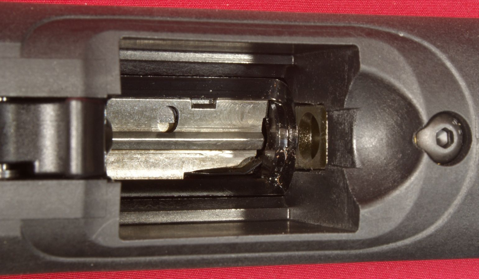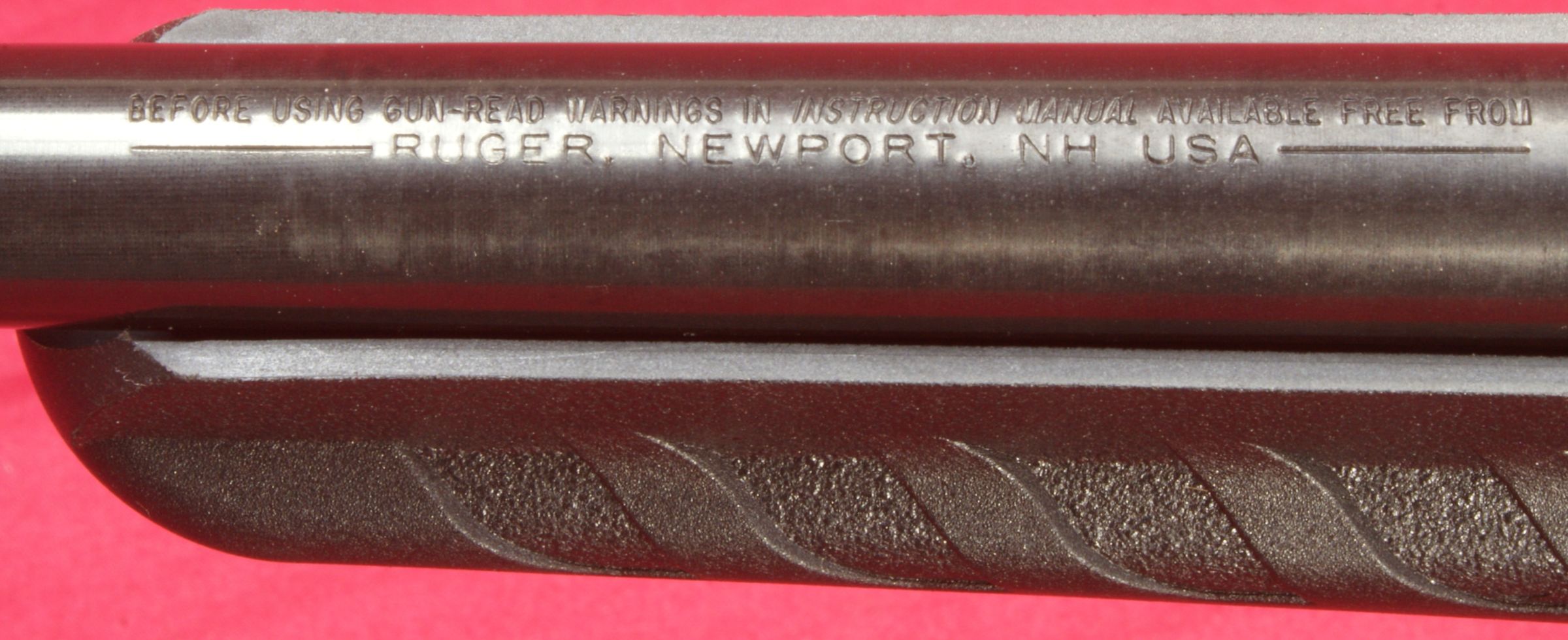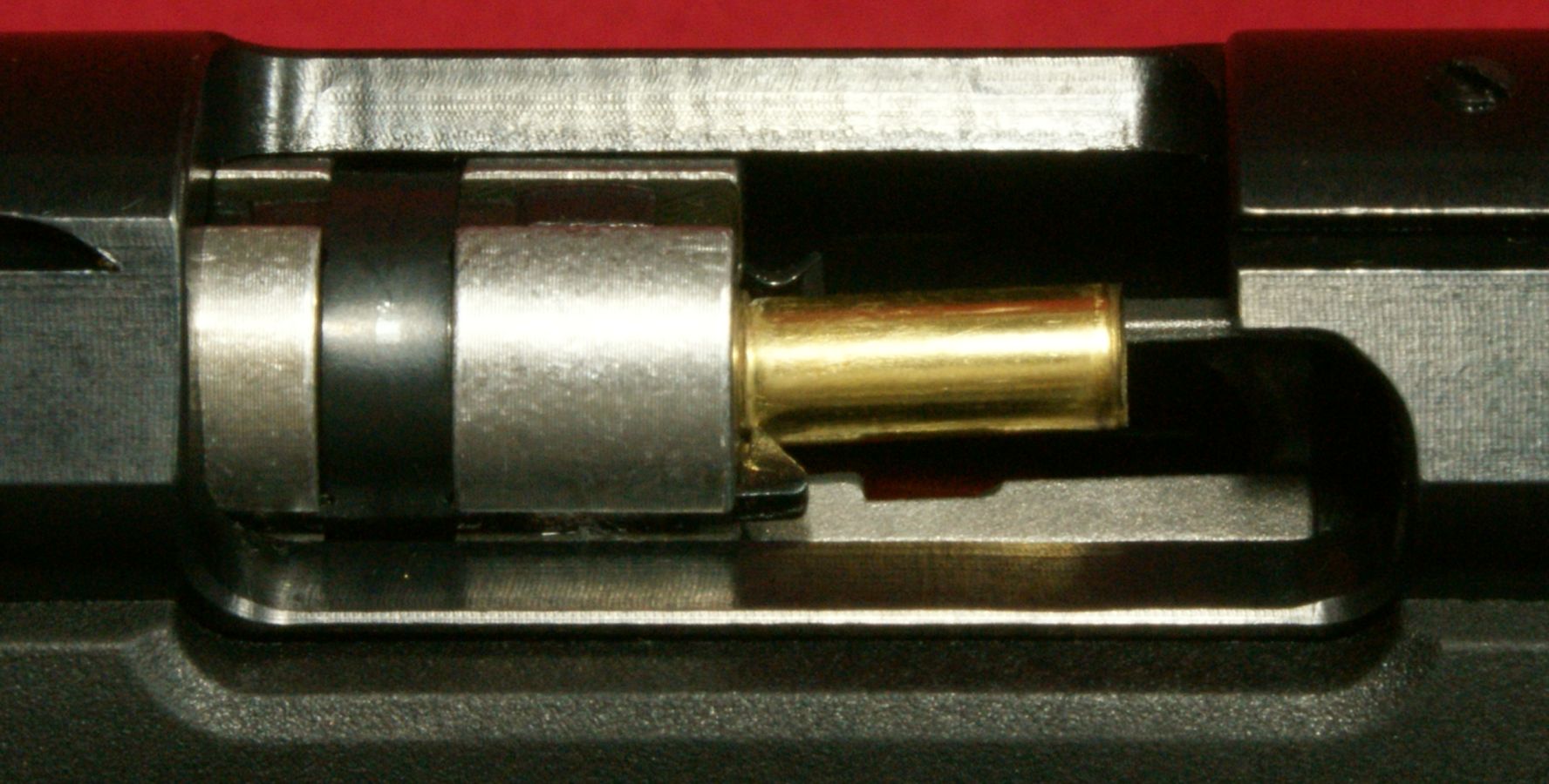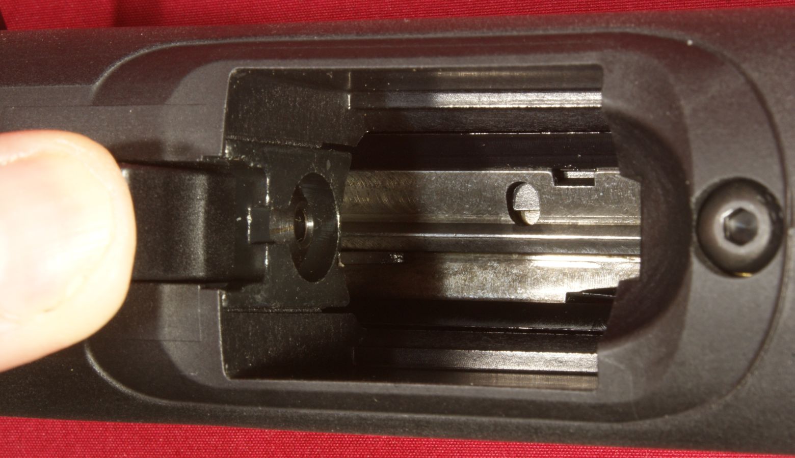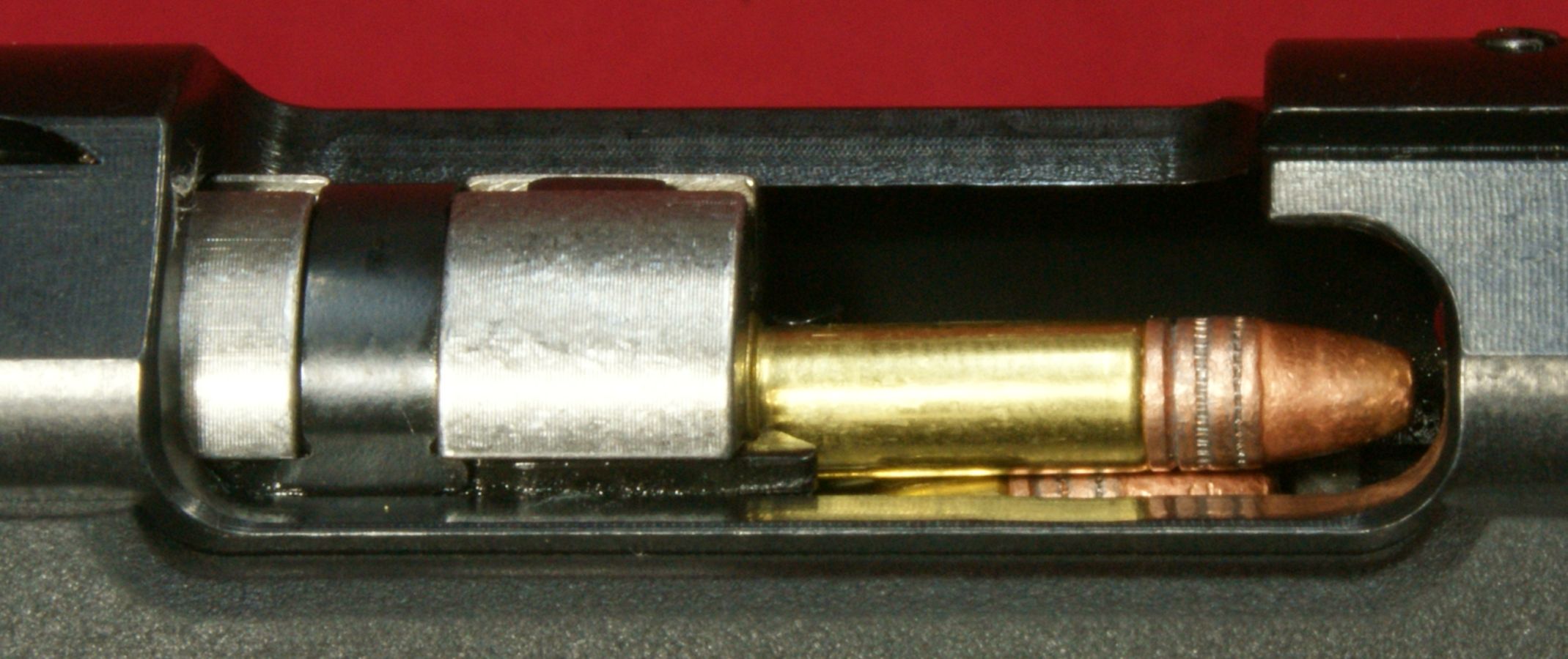 Figure 13 The front sight is held in place with a single screw. I did my normal torque check to make sure it wasn't loose and found it to be tight. The barrel is cold hammer forged from 4140 alloy steel and has a black satin finish. The barrel measured 22.0" in length and has what I think of as a traditional sporter profile. This barrel length should come close to getting the maximum velocity out of high velocity ammunition. The barrel length also provides room for an 18.3" sight radius. At the muzzle, the barrel measures 0.600" in diameter and at the receiver it measures about 0.860" in diameter. The forend includes a ridged area along with texturing to give a somewhat "anti-slip" grip. The reason I say "somewhat" is that because the stock is all polymer, there is still a slight slickness to the touch, even in these textured areas. There is no doubt by looking at the clearance between the front of the forend and barrel that the barrel is fully free floated. The forend also includes a sling swivel point that is screwed into the polymer stock. The barrel has stamped into it Ruger's standard warning statement "BEFORE USING GUN READ WARNINGS IN INSTRUCTION MANUAL AVAILABLE FREE FROM RUGER, NEWPORT, NH USA." At the rear of the barrel is stamped the caliber "22 L R". Ruger decided to use their folding leaf rear sight assembly from their Ruger 10/22 Carbine for this new rifle. This sight is adjusted for elevation by loosening the two screws and moving the sight blade in the direction you want the bullet impact to move. Each graduation on the scale represents about 1" at 25 yards. The blade of the sight can also be reversed to give a square notch rear sight picture. Windage adjustments must be made by drifting the sight in the direction that you want the point of impact to move. The receiver and bolt assembly have the same general looks as that of the American Rifle, but they have both been redesigned to be optimized in size for the rimfire calibers. The receiver is made from 4140 alloy steel and comes drilled and tapped to accept Weaver #12 bases. I was a little surprised to see that this rifle didn't come with the #12 bases like the American®, but since Ruger machined 3/8" dovetails integral into the receiver for standard tip-off mounts, the lack of #12 bases does make a little more sense. If you are planning to use the 3/8" dovetail mount, then be warned that all 3/8" dovetails or mounts are not the same. It seems there are low radius 3/8" dovetails and high radius 3/8" dovetails, in addition, there are also slight differences in width between these two style mounts. The combination of these differences made it hard to locally find 3/8" tip-off mounts that properly fit the American Rimfire™. After trying four different sets of rings, I finally found a set made by Millett which were part of their Angle-Loc series that seemed to work great on the Ruger high radius 3/8" dovetails. I show these rings in detail in Part 6 of this review. Ruger has plans to setup a web page to identify which rings work on this rifle so that you don't have to go through multiple rings before you find the right ones. I hope they also update their instruction manual with this same information. The single greatest feature carried over from the Ruger 10/22 platform is the use of their standard 10-shot rotary magazine. I still use my first 10-shot rotary magazine from a rifle I received as a graduation gift over 25 years ago. Using the 10/22 magazine not only gives the Ruger American Rimfire Rifle a 10+1 capacity, it also gives this rifle the ability to use Ruger's 25-shot BX-25® magazines or any other aftermarket 10/22 magazine available. Ruger also incorporated their 10/22 extended magazine release to allow quick magazine changes. The area around the magazine has some molded recesses that I feel are more cosmetic in nature, but they do give it a nice look. Engraved on the left side of the receiver are the serial number, Ruger logo and "RUGER AMERICAN". The bolt stop lever is also located on this side. Also notice that on the left side is a vent hole to allow the release of hot gasses in the event a case ruptures. These next two photos are intended to show the bolt in the closed and open positions. Total bolt travel measured 1.54". In the left photo below, you can see the bolt face, firing pin, extractor and positioner spring. The right photo shows a magazine installed and the entrance into the chamber. One deviation from the American Rifle is the ejector mechanism. On the American Rifle, the bolt used an ejector plunger to flip the case out of the chamber as soon as the end of the case passed the rear of the chamber. On the American Rimfire, the case or cartridge is held firm against the bolt face by the positioner spring as the bolt is moved to the rear. You see this in the two photos below. One shows a live round being removed and the other shows an empty case being removed. As you continue to pull the bolt rearward from these positions, you pull the rear of the case into a fixed ejector which flips the case out the ejection port. The Ruger American Rimfire™ appears to have a relatively short bolt throw and based on my measurements it appears that the bolt has a 60 degree throw as advertised. The bolt handle also has a smooth rounded end that sticks well away from the stock to help with quick cycling of the bolt when shouldered. The Ruger American Rimfire™ comes with a tang safety which is easily accessible with your thumb and accommodates both a right and left hand shooter. The photo on the left below shows the safety "on" (in "safe" position). The photo on the right below shows the safety "off" (in "fire" position). Once fired, the bolt must be cycled to cock the firing pin before you can move the safety back to the "on" or "safe" position. The bolt can be cycled with the safety in either position after the bolt is initially cocked. The Ruger American Rimfire™ comes with the Ruger Marksman Adjustable™ T