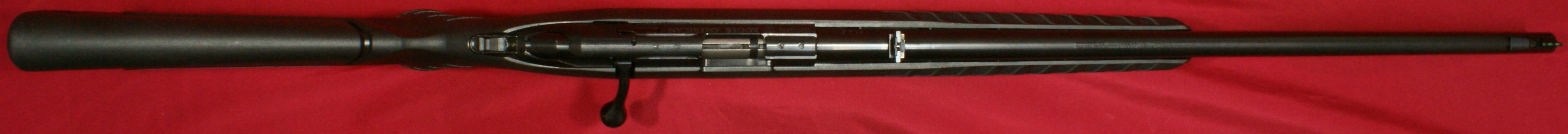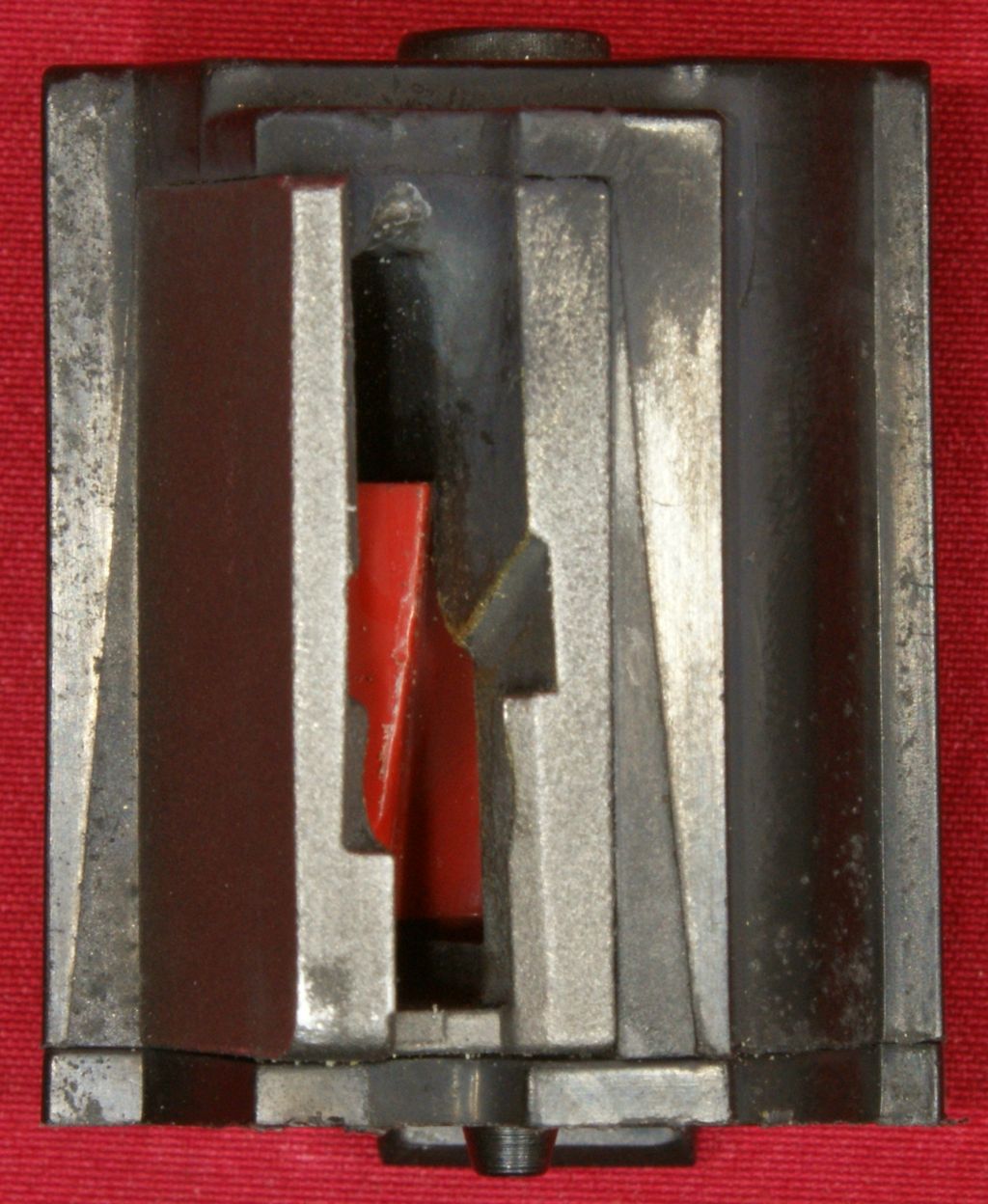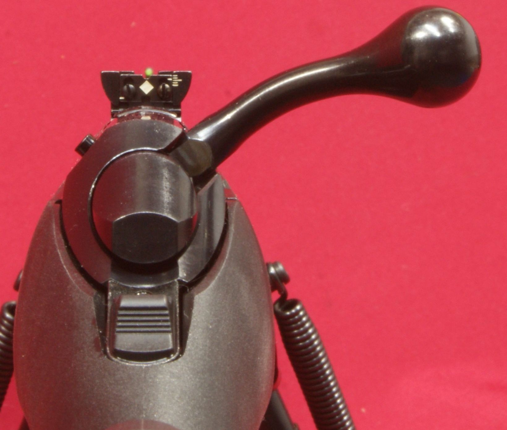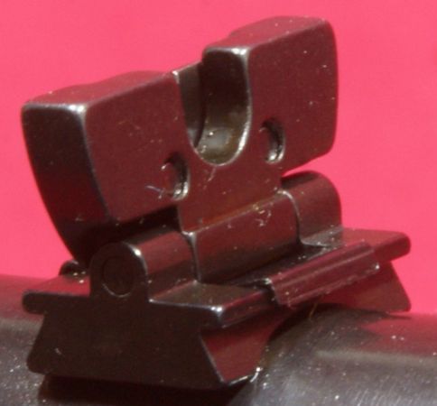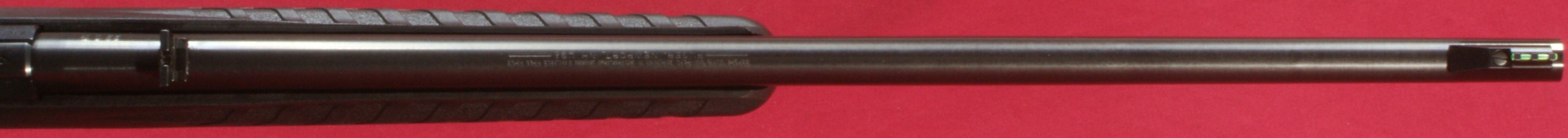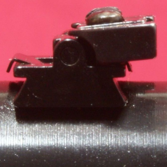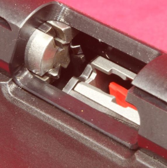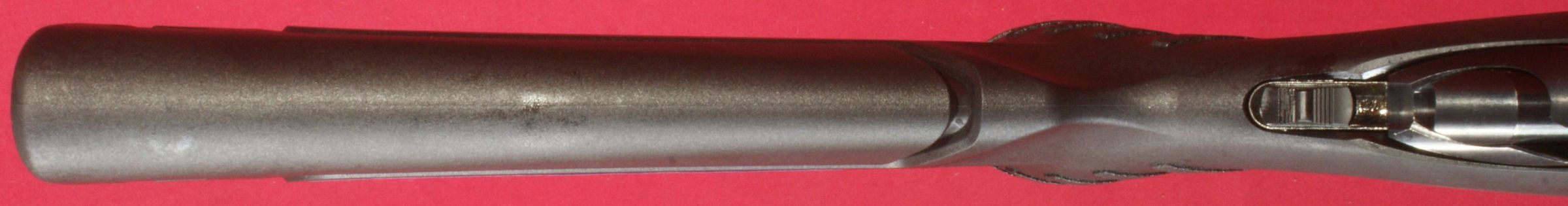 Figure 13 The front sight is held in place with a single screw. I did my normal torque check to make sure it wasn't loose and found it to be tight. The barrel is cold hammer forged from 4140 alloy steel and has a black satin finish. The barrel measured 22.0" in length and has what I think of as a traditional sporter profile. This barrel length should come close to getting the maximum velocity out of high velocity ammunition. The barrel length also provides room for an 18.3" sight radius. At the muzzle, the barrel measures 0.600" in diameter and at the receiver it measures about 0.860" in diameter. The forend includes a ridged area along with texturing to give a somewhat "anti-slip" grip. The reason I say "somewhat" is that because the stock is all polymer, there is still a slight slickness to the touch, even in these textured areas. There is no doubt by looking at the clearance between the front of the forend and barrel that the barrel is fully free floated. The forend also includes a sling swivel point that is screwed into the polymer stock. The barrel has stamped into it Ruger's standard warning statement "BEFORE USING GUN READ WARNINGS IN INSTRUCTION MANUAL AVAILABLE FREE FROM RUGER, NEWPORT, NH USA." At the rear of the barrel is stamped the caliber "22 L R". Ruger decided to use their folding leaf rear sight assembly from their Ruger 10/22 Carbine for this new rifle. This sight is adjusted for elevation by loosening the two screws and moving the sight blade in the direction you want the bullet impact to move. Each graduation on the scale represents about 1" at 25 yards. The blade of the sight can also be reversed to give a square notch rear sight picture. Windage adjustments must be made by drifting the sight in the direction that you want the point of impact to move. The receiver and bolt assembly have the same general looks as that of the American Rifle, but they have both been redesigned to be optimized in size for the rimfire calibers. The receiver is made from 4140 alloy steel and comes drilled and tapped to accept Weaver #12 bases. I was a little surprised to see that this rifle didn't come with the #12 bases like the American®, but since Ruger machined 3/8" dovetails integral into the receiver for standard tip-off mounts, the lack of #12 bases does make a little more sense. If you are planning to use the 3/8" dovetail mount, then be warned that all 3/8" dovetails or mounts are not the same. It seems there are low radius 3/8" dovetails and high radius 3/8" dovetails, in addition, there are also slight differences in width between these two style mounts. The combination of these differences made it hard to locally find 3/8" tip-off mounts that properly fit the American Rimfire™. After trying four different sets of rings, I finally found a set made by Millett which were part of their Angle-Loc series that seemed to work great on the Ruger high radius 3/8" dovetails. I show these rings in detail in Part 6 of this review. Ruger has plans to setup a web page to identify which rings work on this rifle so that you don't have to go through multiple rings before you find the right ones. I hope they also update their instruction manual with this same information. The single greatest feature carried over from the Ruger 10/22 platform is the use of their standard 10-shot rotary magazine. I still use my first 10-shot rotary magazine from a rifle I received as a graduation gift over 25 years ago. Using the 10/22 magazine not only gives the Ruger American Rimfire Rifle a 10+1 capacity, it also gives this rifle the ability to use Ruger's 25-shot BX-25® magazines or any other aftermarket 10/22 magazine available. Ruger also incorporated their 10/22 extended magazine release to allow quick magazine changes. The area around the magazine has some molded recesses that I feel are more cosmetic in nature, but they do give it a nice look. Engraved on the left side of the receiver are the serial number, Ruger logo and "RUGER AMERICAN". The bolt stop lever is also located on this side. Also notice that on the left side is a vent hole to allow the release of hot gasses in the event a case ruptures. These next two photos are intended to show the bolt in the closed and open positions. Total bolt travel measured 1.54". In the left photo below, you can see the bolt face, firing pin, extractor and positioner spring. The right photo shows a magazine installed and the entrance into the chamber. One deviation from the American Rifle is the ejector mechanism. On the American Rifle, the bolt used an ejector plunger to flip the case out of the chamber as soon as the end of the case passed the rear of the chamber. On the American Rimfire, the case or cartridge is held firm against the bolt face by the positioner spring as the bolt is moved to the rear. You see this in the two photos below. One shows a live round being removed and the other shows an empty case being removed. As you continue to pull the bolt rearward from these positions, you pull the rear of the case into a fixed ejector which flips the case out the ejection port. The Ruger American Rimfire™ appears to have a relatively short bolt throw and based on my measurements it appears that the bolt has a 60 degree throw as advertised. The bolt handle also has a smooth rounded end that sticks well away from the stock to help with quick cycling of the bolt when shouldered. The Ruger American Rimfire™ comes with a tang safety which is easily accessible with your thumb and accommodates both a right and left hand shooter. The photo on the left below shows the safety "on" (in "safe" position). The photo on the right below shows the safety "off" (in "fire" position). Once fired, the bolt must be cycled to cock the firing pin before you can move the safety back to the "on" or "safe" position. The bolt can be cycled with the safety in either position after the bolt is initially cocked. The Ruger American Rimfire™ comes with the Ruger Marksman Adjustable™ T