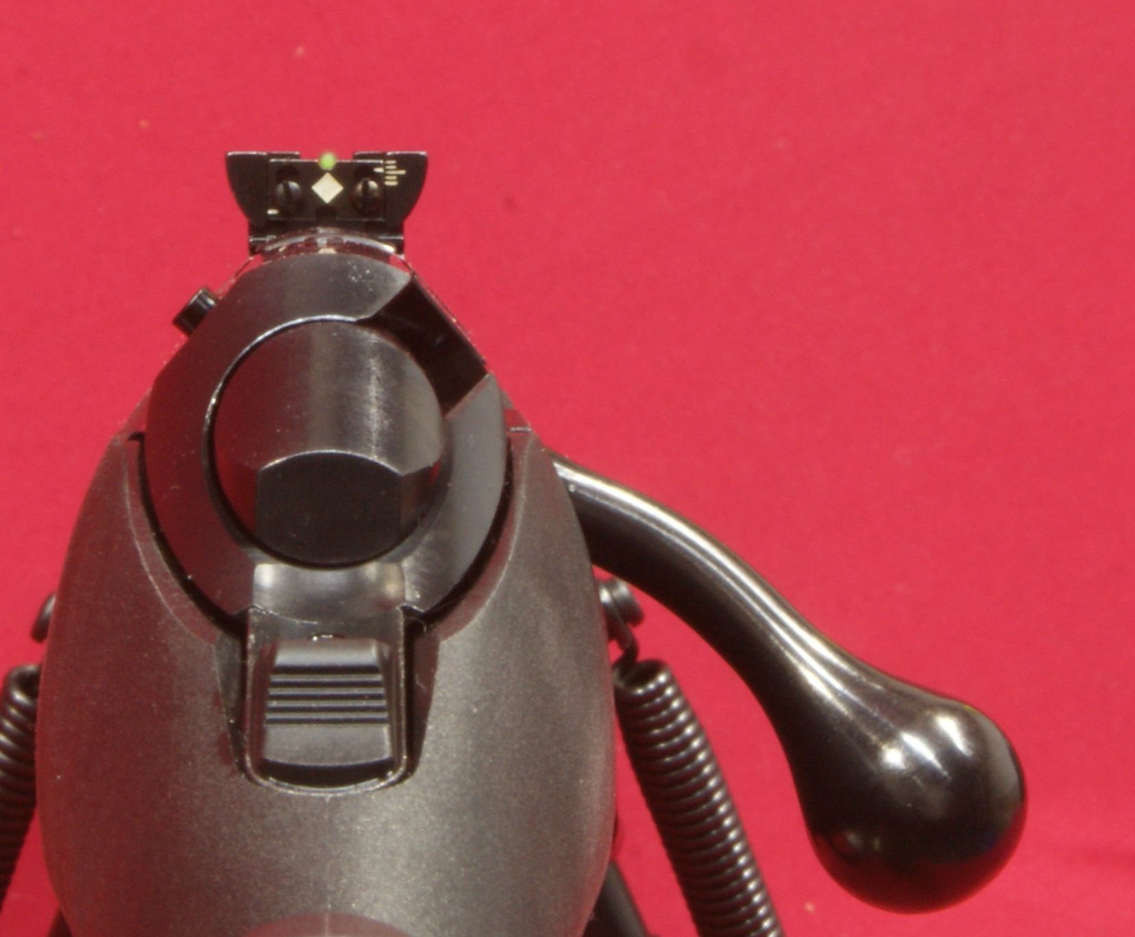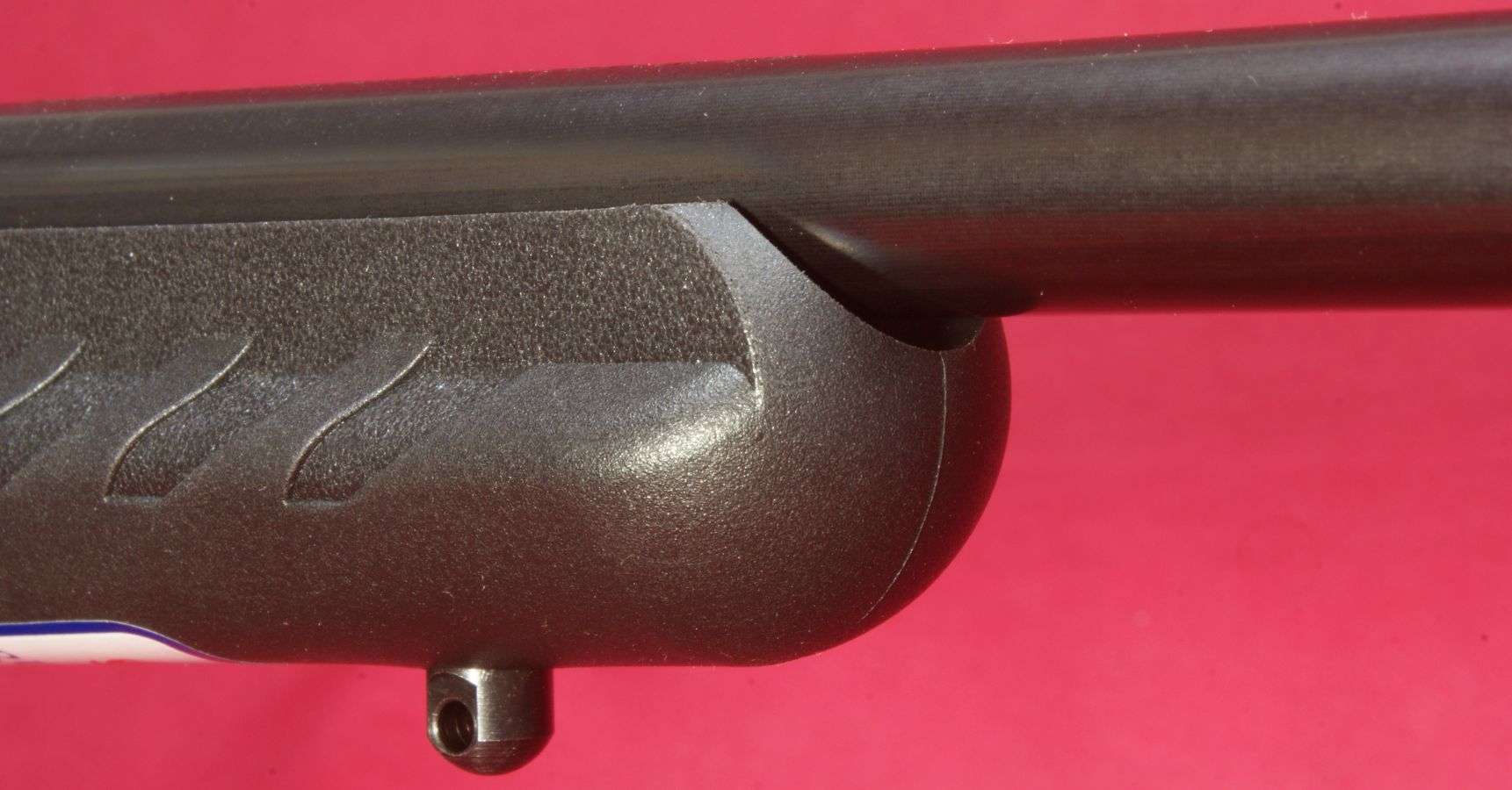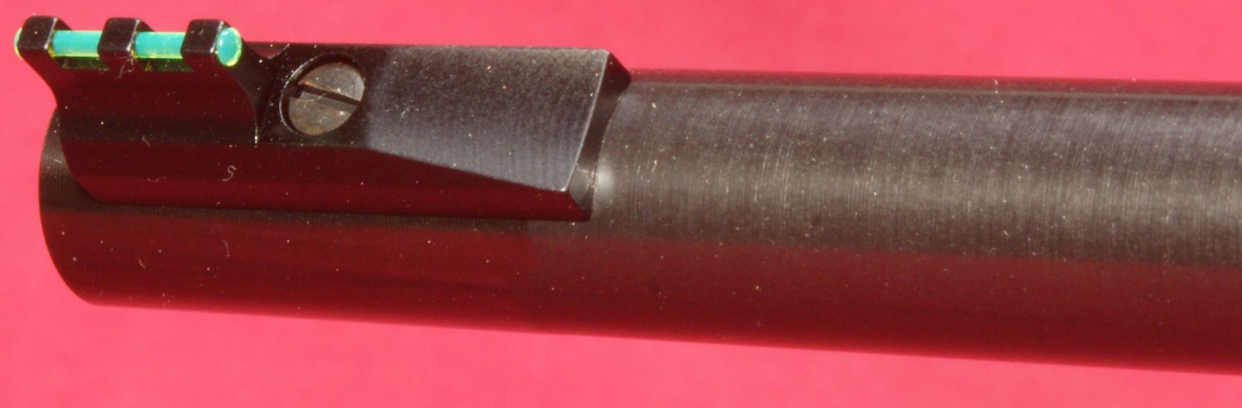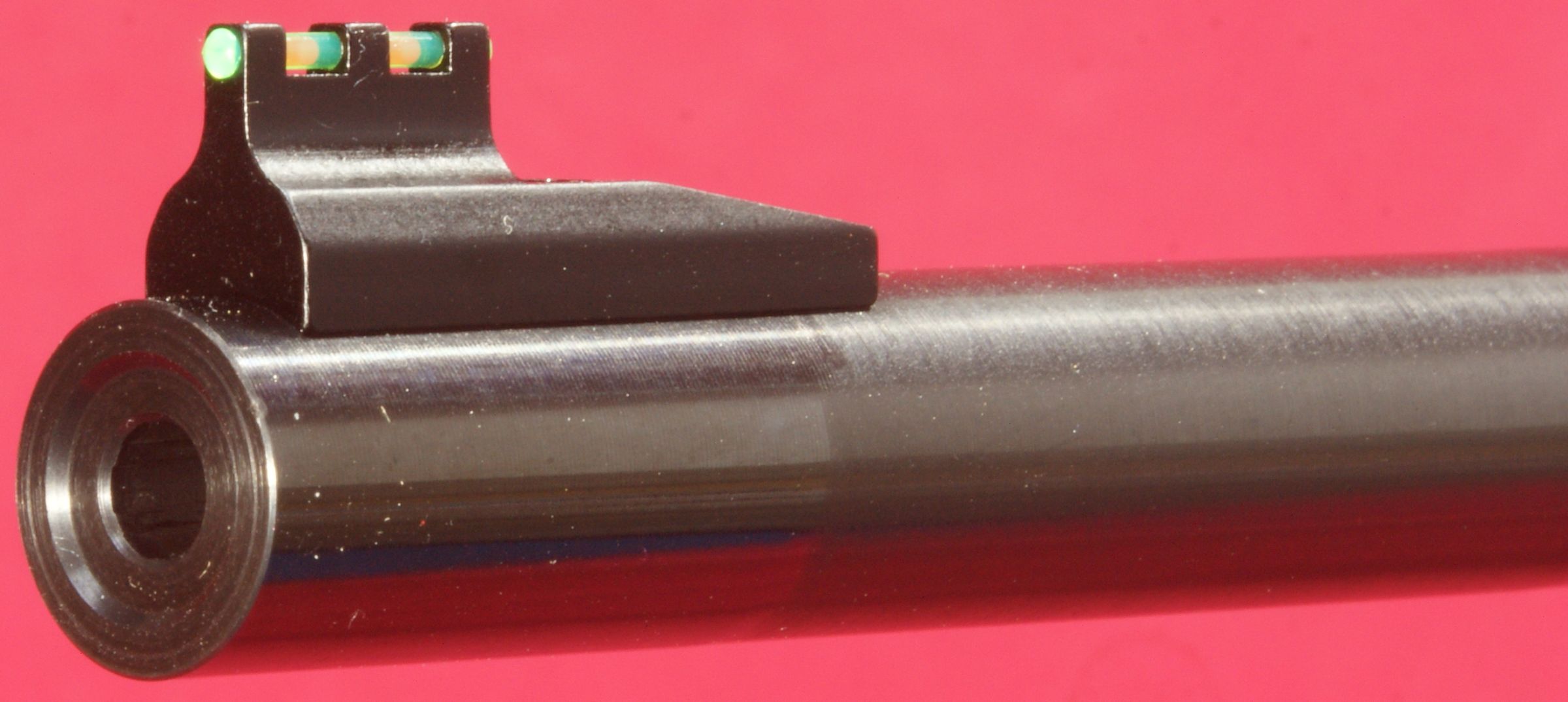 At first glance, the Ruger American Rimfire rifle looks like a standard sporting/hunting rifle with its 22" barrel, sights, composite stock and trigger. It is not until you look a little closer that you see this rifle is a rimfire platform. The full size configuration along with satin finish on the alloy steel parts and the black polymer stock gives this rifle a sleek look that seems to convey sporting accuracy. As mentioned in Part 1 of this review, Ruger has blended some of the best features from the American Rifle and 10/22 Rifle platforms into this new bolt action rimfire platform that I expect to be extremely popular in the future. Ruger has also taken the polymer stock from their standard American Rifle to a new level by keeping the original slim lightweight form and adding the ability to change both length of pull and comb height with replaceable recoil pads (more on this feature later in the review). The rifle measured 41.0" in length and has a 22.0" sporter barrel. Excluding the bolt, the maximum width across the stock was about 1.78". With the bolt closed, the bolt handle sticks out about 1.28". The empty rifle weighed in at 5.89 pounds. The high comb recoil pad is about 0.14 pounds greater which would give the rifle a weight of 6.03 pounds. The end of the barrel comes with a recessed crown to protect the rifling to maintain maximum integrity. The front sight is actually the same as that on Ruger's Single-Ten® Revolver. In the photo below, you can see the slight change in barrel finish that I mentioned in Part 2. The lighting I used to take this photo makes this difference more pronounced than is seen under normal lighting conditions. This sight is a high visibility Williams™ fiber optic sight and really does a great job of standing out when using the iron sights. Sad to say, but with my bi-focal eyes, the focus in the photo below is fairly realistic for my eyesight.