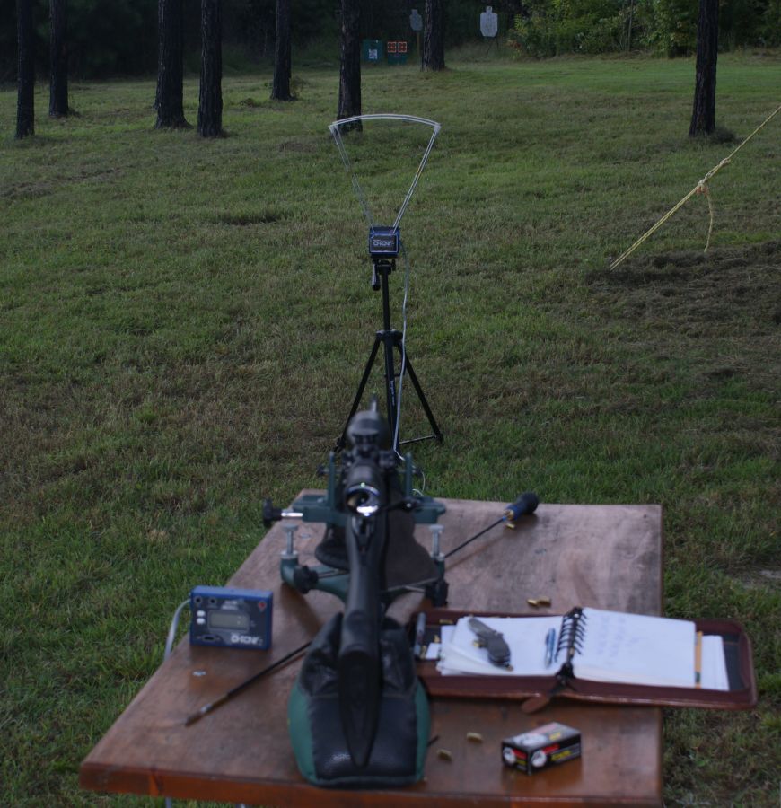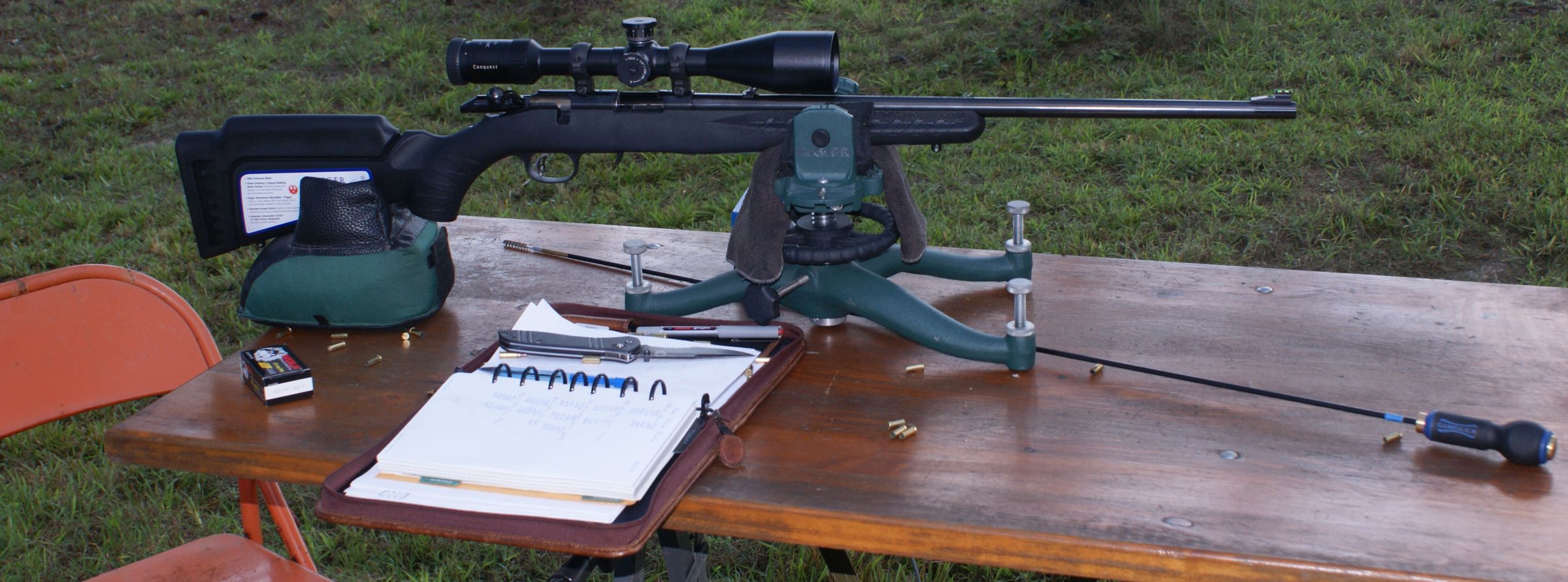 As I mentioned in Part 3, I had to do some searching to find a set of rings that worked on the high radius 3/8" dovetail mount on this rifle. I was finally able to locate these Millett rings shown below. These rings are Millett's Angle-Loc™ 30mm Medium Height Tip Off Matte rings (model TP00708). I used these rings to mount my Zeiss Conquest 4.5-14x50mm Scope. I have found this scope to be a solid performer and thought it would be a good one to use during my range testing. You can see that the large 50mm objective diameter barely cleared the flip down sight while using the medium height rings. I would have preferred to slide the scope back about another 1/2" for a better head position based on the scopes eye relief, but I didn't want to remove the rear sight. One thing that was odd with this setup is that I was only able to find 30mm rings at my local stores and the scope tube is 1". Luckily I had a set of adapter bushings which allow you to use a 1" tube with 30mm rings. Once I decide on my final scope, I will order the proper size Millett rings for my scope. Also note that the rings are a matte finish. If you get these Millett rings, I think the "smooth" finish from Millett would do a better job at matching the finish on the rifle. With the American Rimfire™ bolt-action rifle setup as shown below, I performed an initial zero in my basement using my 13 yard range and then was off to do some real shooting. For accuracy testing, I tried to select some ammunition in a range of velocities and different common bullet weights. I shot eight 5-shot groups and took the best four out of five shots in each group for my group size measurements. The temperature was 93 degrees, humidity felt about 80% and there was a variable breeze up to about 3 miles per hour coming from the 4 to 5 o'clock directions. Needless to say, sweat was pouring off me and the breeze was welcomed, but I felt I had to handicap my groups (best 4 out of 5) based on the shooting conditions, and it seemed that I got a regular flyer which I'm sure was due to me and not the rifle. The photo below shows my bench setup. I shot all groups from 50 yards and measured velocity with a chronograph setup about 10 feet from the muzzle. The table below summarizes my range test results. Clearly the American Rimfire™ seemed to perform better with subsonic ammunition, but the CCI high velocity was not too shabby be any means. I was not impressed with how the Remington 22 Viper ammunition performed, and I don't plan to use it in this rifle in the future.