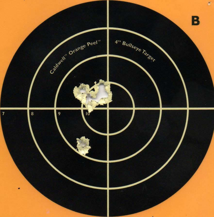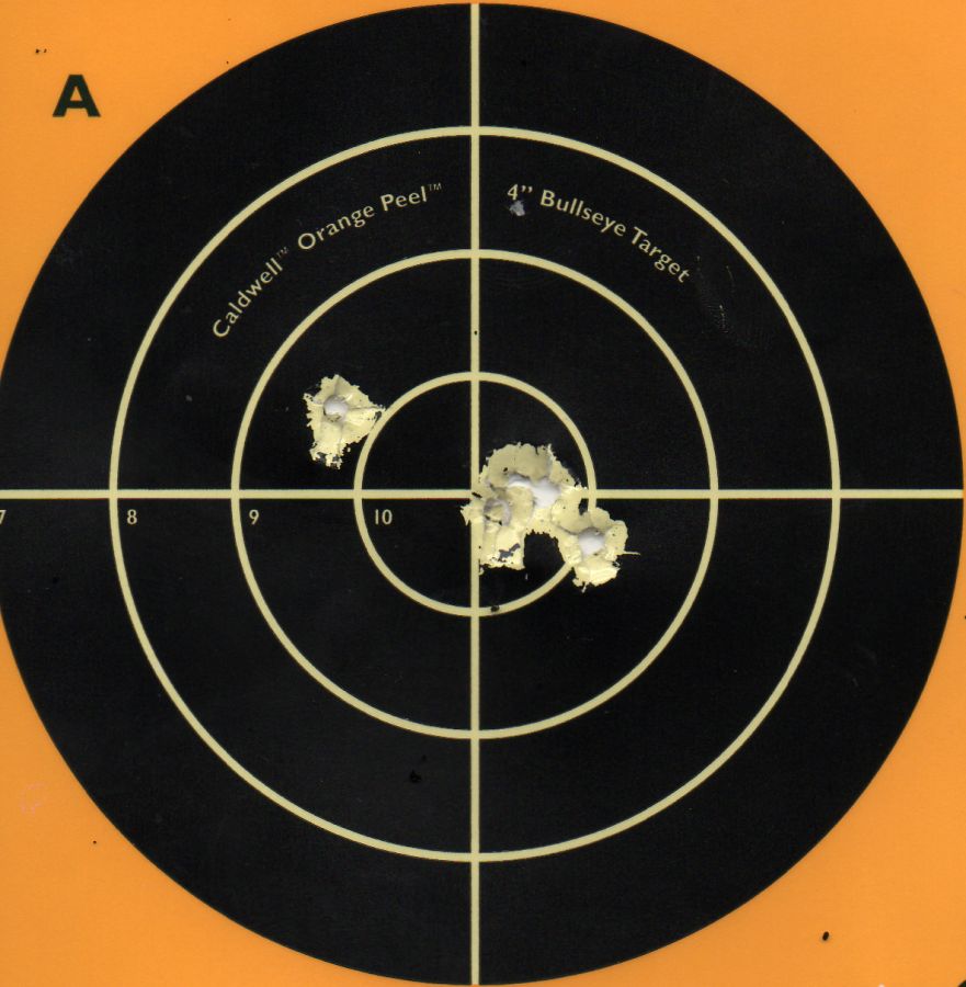 These next two targets give you examples of my best groups using the subsonic ammunition and a good idea on why I felt I should use a 4-shot group instead of all five shots. Clearly, there was a definable group by the four shots, and I felt the outlying shot was due to the shooter and not rifle or ammunition. Figure 8 - Wolf Match Target