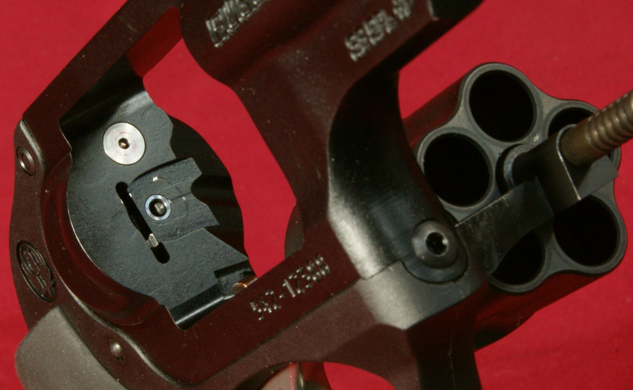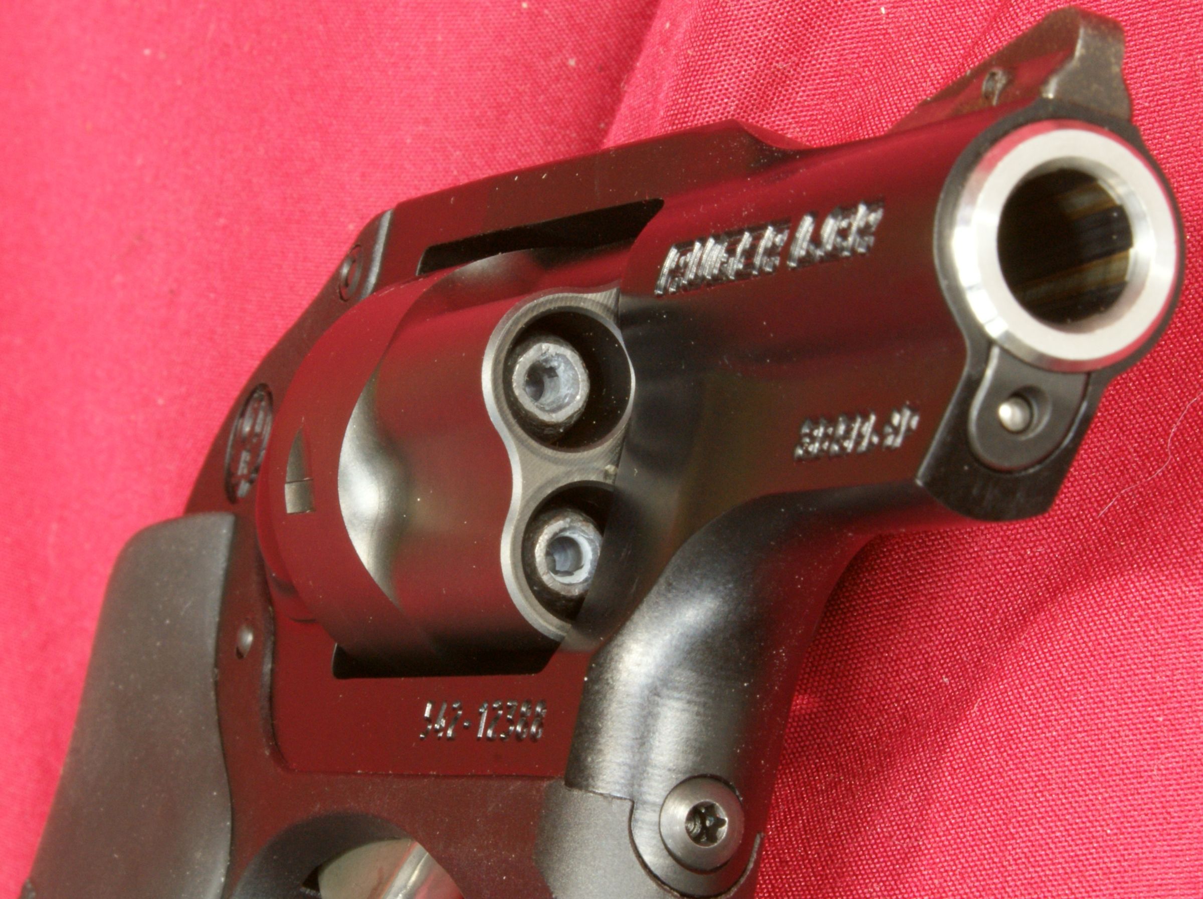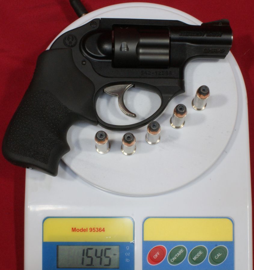 Essentially, you seem to be getting something similar to a hard coat anodizing combined with a durable satin (Teflon-ish) finish. The Ionbond Diamondblack™ finish (basically a PVD coating) on the cylinder improves wear resistance due to the high hardness, low coefficient of friction and high structural integrity. This coating, with thicknesses of only a few microns (µ) and with hardness up to 4000hv (Vickers), can result in a significant increase in firearm life and functionality. The LCR measured 1.28" at it's widest point which is across the cylinder. The LCR measured 4.54" in height and 6.67" in length, which were slight but not significant deviations from the specification values of 4.50" and 6.50". This revolver comes with a Hogue® Tamer™ grip that allows you to get two fingers firmly on the grip while your little finger rests on the butt of the grip. For my hand size (medium palm with long fingers), the grip felt good and has a large feel for such a small revolver. The monolithic frame is made from a 7000 series aluminum according to Ruger and the aluminum is most likely 7075-T6 which seems to be the standard high strength aluminum used in firearms. The photo below looking down the barrel makes it pretty clear that the LCR is a 5 shot revolver. Because of the transfer bar safety, you can take advantage of a fully loaded cylinder when carrying this revolver. The LCR also does not have a side plate like most revolvers. The internal parts are installed through the top of the fire control housing or through the bottom in the back of the frame. The LCR weighed in at 13.35 ounces empty and 15.45 ounces with 5 rounds of Remington 38 Special +P 110gr Semi-Jacketed Hollow Points. The Ruger LCR uses a stainless steel barrel sleeve inside the monolithic aluminum frame. The barrel measured exactly 1.875" in length as stated in the specifications and the barrel has a six groove 1:16" right hand twist. The LCR comes with a replaceable steel pinned front sight. For some reason, the lighting used in these photos seems to have accented the finish on the sight to show a "speckled" black matte finish. Under normal lighting, it is hard to notice the lighter colored specks. These lighter specks are not rust, but instead look like some type of pretreatment prior to the final black finish. Also notice in the photo that Ruger chose to use a block style lettering for the model name. The rear sight is a U-notch that is integrally formed into the top of the frame and also in the top of the polymer fire control housing. This next photo gives you a look down the sights showing the sight picture. When at arms length, the gaps on each side of the front sight to the sides of the U-notch are only slightly less than that shown in the photo. The right side of the frame is marked with "RUGER LCR", "38 SPL +P" and the serial number. The fire control housing has the Ruger logo molded into the side of the housing. The left side of the frame is marked with the statement "READ INSTRUCTION MANUAL", company name "STURM, RUGER & CO, INC" and "NEWPORT, NH U.S.A." The left side of the fire control housing also has the Ruger logo molded into the side of the housing. The fire control housing includes an integrally molded trigger guard. The trigger is stainless steel and appears to be either a cast or molded part. The trigger has a polished smooth front and is about 0.31" in width. The trigger pull starts out with the initial take-up of about 0.03", the cylinder is fully rotated at about 0.40" and the hammer drops at about 0.53". The double action trigger pull measured 9.7 pounds based on 10 pulls using a Lyman Digital Trigger Pull Gauge. I was actually surprised to see it come in above 9 pounds because the smoothness of the pull makes the pull weight seem less. Ruger states the "Patented Friction Reducing Cam is a next generation design in fire control systems with an optimized cam that results in a smooth, non-stacking trigger pull." I agree that the trigger is smooth and non-stacking, yet I found that staging the trigger was still possible and gives you the feel of shooting single action for increased accuracy if needed. Staging is not practical in a defense situation, but doing so might give you slightly better results at the range. I suggest practicing to shoot the LCR both ways. Another way Ruger may be able to achieve the smooth trigger pull is with the coatings applied to the internal parts. The LCR has special electroless nickel/PTFE (Teflon®) coatings on the trigger, hammer and other internal components. A last point worth noting on the trigger is that the trigger must be released completely when firing this double-action revolver. This is typical for all modern double-action revolvers. The cylinder can be opened by pressing in on the rear of the crane latch button where the ridges are located. With the cylinder open, you cannot pull the trigger and release the hammer. When the cylinder is open, you can also see the stainless steel ejector. With the cylinder open, cartridges easily drop in all chambers of the cylinder without having to rotate the cylinder. The left side of the Hogue grip appears to be molded to allow a little more clearance for the cartridges when loading or unloading. The crane and cylinder are held closed by the center lock pin at the rear and the front latch pin shown below. Pressing on the crane release button pushes the center lock pin out of the breech face and also pushes the front latch pin out of the ejector extension. For some reason I'm still amazed at how deeply the cylinder is fluted for this revolver to be rated to handle 38 Special +P ammunition. I'm sure the cylinder being made of high strength stainless steel is the key factor allowing the deep fluting. The cylinder also has a nice black finish due to the Ionbond DiamondBlack™ coating. This next photo gives you a good look at the breech face where you can see the stainless steel firing pin bushing, tip of the firing pin and end