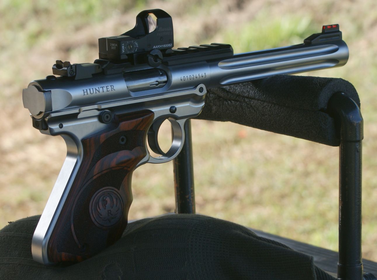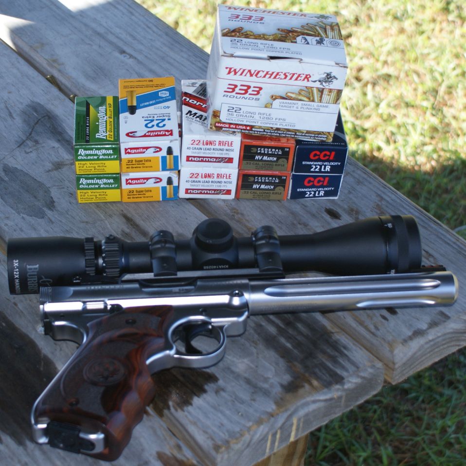 Ruger Mark IV Hunter Pistol Review For range testing the new Ruger Mark IV Hunter Pistol, my goals were to sight in the iron sights, then install some type of magnified optic to capture basic accuracy data and finally install a red dot sight and put a significant number of rounds down range to get a feel for reliability. I initially setup a target at 13 yards (my home indoor range distance) and used the CCI Standard Velocity ammunition. I was able to quickly zero the iron sights and put about 100 rounds through the pistol without any issue. As I have already mentioned in other parts of the review, I'm not a big fan of the V-notch sights, because I feel I can be more precise with U-notch sights. Although Ruger markets this pistol as the Hunter model, I feel they would have been better off to stick with a standard U-notch rear sight. Overall though, the sights on this pistol are not bad and if your true role were hunting then they should suit that purpose.