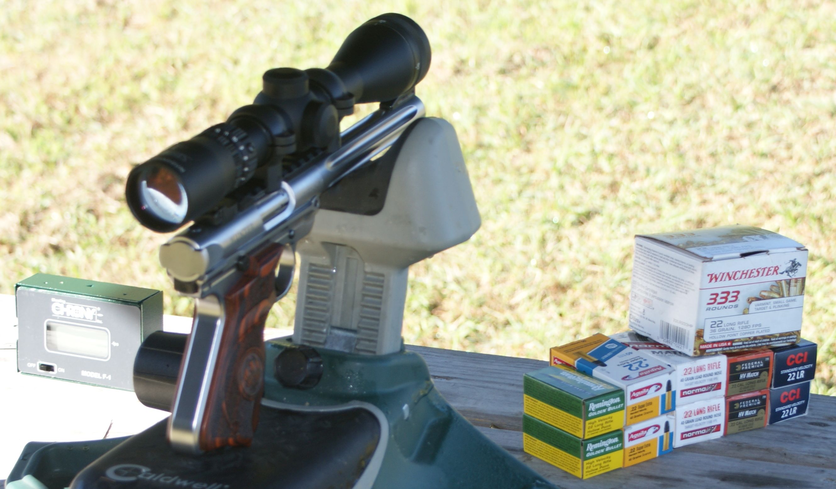 For the accuracy portion of the range test, I installed my Burris 3-12x32 Handgun Scope. The scope mounted perfectly with a pair of the Burris Signature Zee Medium Height Rings. I also selected a variety of ammunition that varied in price, bullet weight and velocity and also represents ammunition that is fairly available at your local stores or online. I decided to give my Caldwell Matrix shooting rest a try for this portion of the test. You can see the setup below. I quickly switched back to my standard homemade rest and sock with bird seed because I felt it was more stable (see Figure 6), but I didn't get a photo of this setup with the scope installed on the pistol. During the accuracy portion of the test, I setup my target at 25 yards and the chronograph at about 10 feet from the muzzle. The following table summarized the accuracy portion of my range tests and also shows the chronograph data. From this data, you can see that the pistol favors standard velocity ammunition and specifically the CCI and Norma ammunition were great performers. During the range tests I did have some cycling issues with the Aguila and one failure to feed issue with the CCI. The Aguila had the lowest measured average velocity and the highest extreme spread and standard deviation. I feel the Aguila lower velocity rounds were not giving enough energy to fully cycle the bolt. Again this happened once with the CCI, but other than that one time, the CCI proved to be reliable. Perhaps the recoil spring will break-in over time and help with the lower energy rounds in the future. All the high velocity rounds cycled without issue and I was pleased with the accuracy I was getting out of the Winchester and Remington.