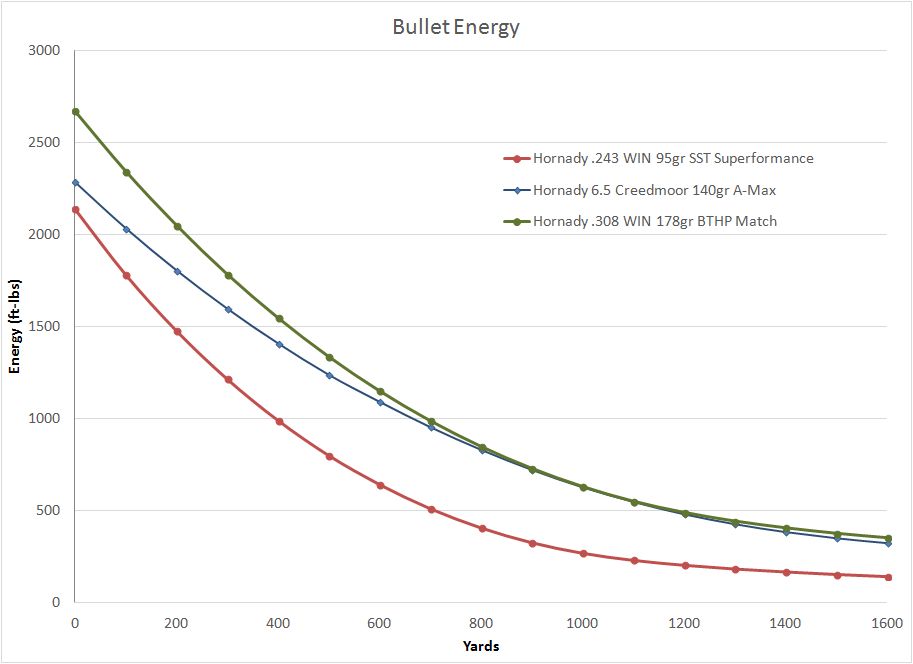 In my case, I selected the 6.5 Creedmoor because I feel it gives the maximum range prior to entering the transonic region and it can do this without having to shoot an extremely hot load to boost velocity. It also has the greatest ballistic coefficient which also minimized wind induced effects. Even if I had selected to compare this 6.5 Creedmoor against Hornady's .308 Win 178gr BTHP Match Superformance ammunition (not shown on this chart), I still would have gotten more range out of the 6.5 Creedmoor. Bullet energy was not a criteria for me, but if so, after about 800 yards the 6.5 Creedmoor or .308 Win are so similar that the energy differences are not worth noting. The .243 is flatter shooting out to about 900 yards where it crosses the line for the 6.5 Creedmoor. Since in most cases I will have a good idea on the distance to the target, the flatness of the .243 wasn't critical in my case. If I were considering shooting small targets less than 600 yards where I might not always know the exact distance to the target, I might have reconsidered my selection. Depending on your shooting situations, what type of rifles you already own and ammunition availability in your area, you can make a case for any of these caliber offerings. At the time of this review, it seems finding a rifle chambered in 6.5 Creedmoor is hard to do which might give you an idea on the popularity of other shooters making the choice for the 6.5 Creedmoor. During my reviews I like to compare my results