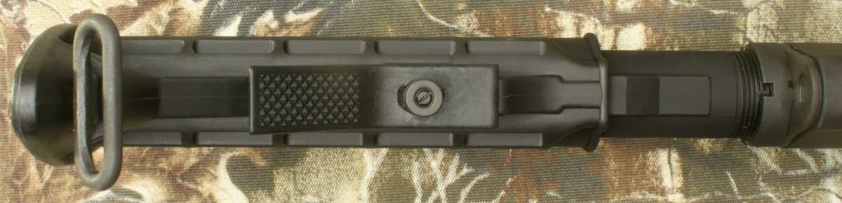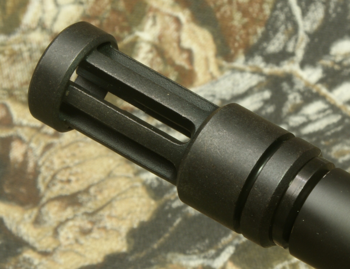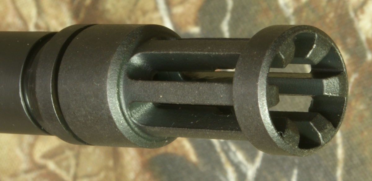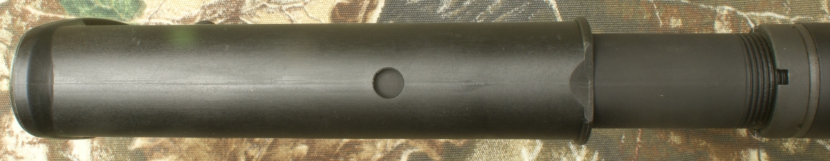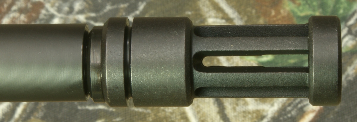 Ruger SR-22 Rifle Review: Part 3 - External Features This part of the review covers all of the externally visible features of the Ruger SR-22 rifle. You can see other parts of the review by going to the Review Summary page. The photo below shows the Ruger SR-22 rifle. I have installed a Shooters Ridge bipod to assist with supporting the rifle during photos. The Ruger SR-22 does not come with a bipod. Also, throughout this review, you can click on any photo to bring up a higher resolution photo. The flash suppressor on the Ruger SR-22 rifle is the same one that Ruger uses on their SR-556 and Mini- 14 rifles. The suppressor is attached to the barrel using a 1/2" - 28 sized thread. The flash suppressor is manufactured from a chrome-molly alloy steel using an investment casting method at Pine Tree Castings, a division of Ruger. The 16.12" barrel is an alloy steel, precision rifled, cold-hammer forged barrel that is made in-house at Ruger. In the photo below, you can see that there is a barrel support block between the barrel and hand guard tube. This block can be removed if you choose to replace your barrel with an aftermarket barrel. Another item to note about the barrel is that it is not in the center of the hand guard tube. The center of the barrel is about .10" higher than the center of the tube where the barrel exits the tube.