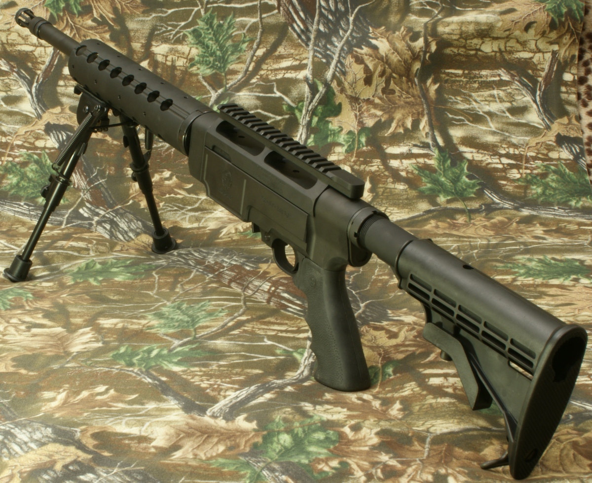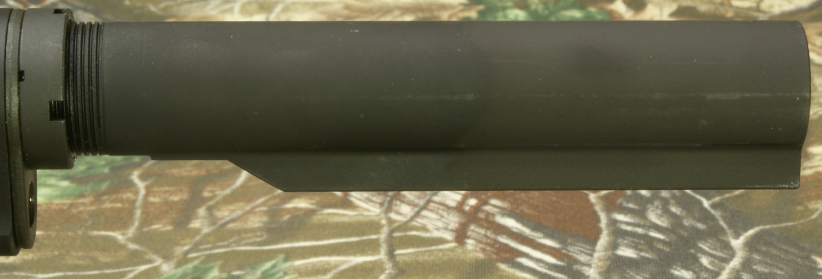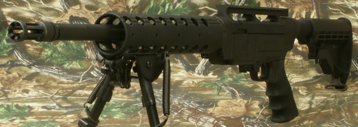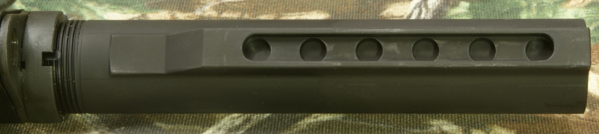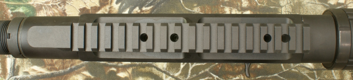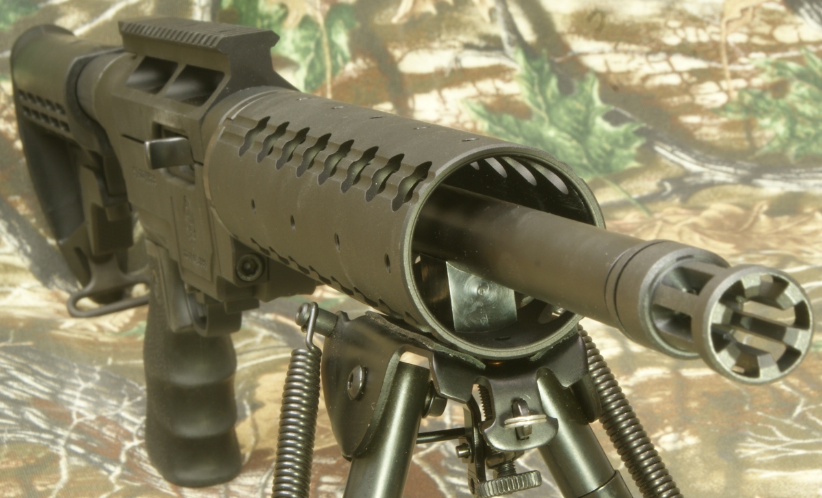 Ruger SR-22 Rifle Review: Part 3 - External Features This part of the review covers all of the externally visible features of the Ruger SR-22 rifle. You can see other parts of the review by going to the Review Summary page. The photo below shows the Ruger SR-22 rifle. I have installed a Shooters Ridge bipod to assist with supporting the rifle during photos. The Ruger SR-22 does not come with a bipod. Also, throughout this review, you can click on any photo to bring up a higher resolution photo. The flash suppressor on the Ruger SR-22 rifle is the same one that Ruger uses on their SR-556 and Mini- 14 rifles. The suppressor is attached to the barrel using a 1/2" - 28 sized thread. The flash suppressor is manufactured from a chrome-molly alloy steel using an investment casting method at Pine Tree Castings, a division of Ruger. The 16.12" barrel is an alloy steel, precision rifled, cold-hammer forged barrel that is made in-house at Ruger. In the photo below, you can see that there is a barrel support block between the barrel and hand guard tube. This block can be removed if you choose to replace your barrel with an aftermarket barrel. Another item to note about the barrel is that it is not in the center of the hand guard tube. The center of the barrel is about .10" higher than the center of the tube where the barrel exits the tube.