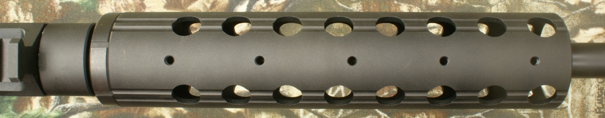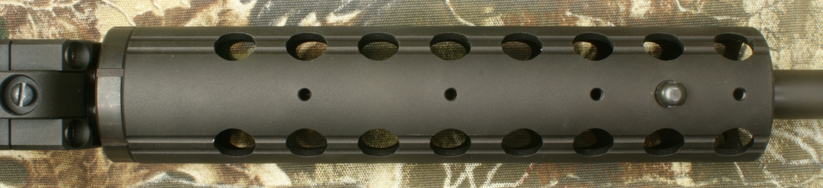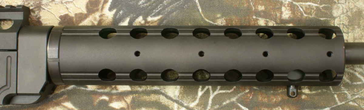 The hand guard is an aluminum alloy tube with the tube portion measuring 9.00" (mid length). The hand guard is mounted on a standard-thread AR-style barrel nut. The outside diameter of the tube measures 2.00" and has a 0.125" wall thickness. The tube is drilled and tapped at 17 locations (5 on the top and 4 on each other side) with a 10-32 thread for mounting accessory rails. The top of the hand guard has 5 holes located 1.75" apart (center to center hole spacing). This hole pattern starts 0.75" from the front of the hand guard tube. Both the left and right side of the hand guard are the same with 4 holes located 2.00" apart (center to center hole spacing). The bottom of the hand guard has 4 holes located 2.00" apart (center to center hole spacing) and also has the hole for the swivel stud. Also notice that the hole pattern for the sides and bottom begin at the same distance back on the hand guard tube (0.50").