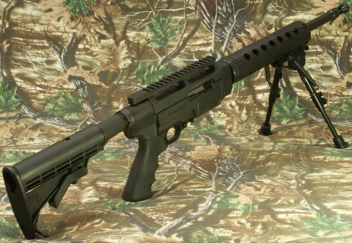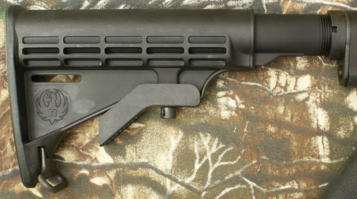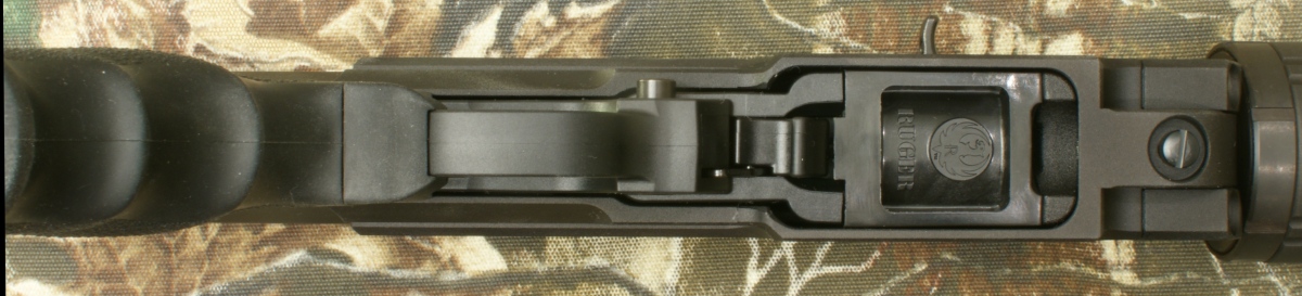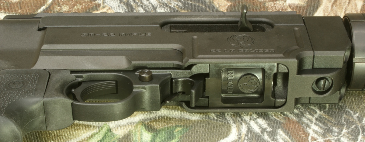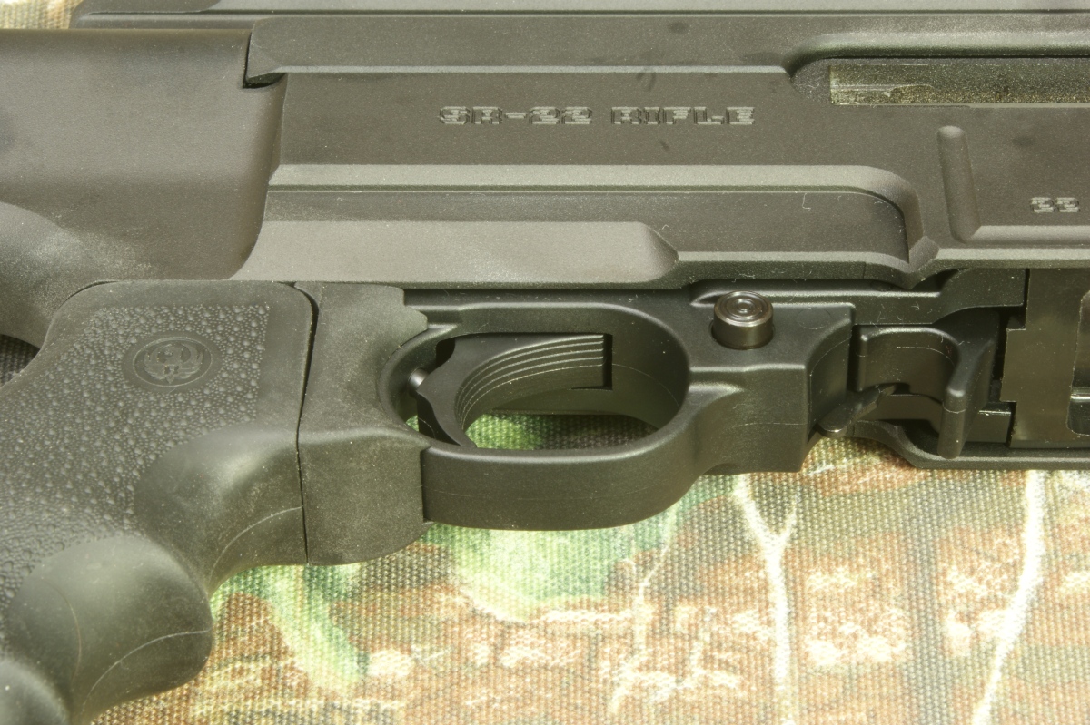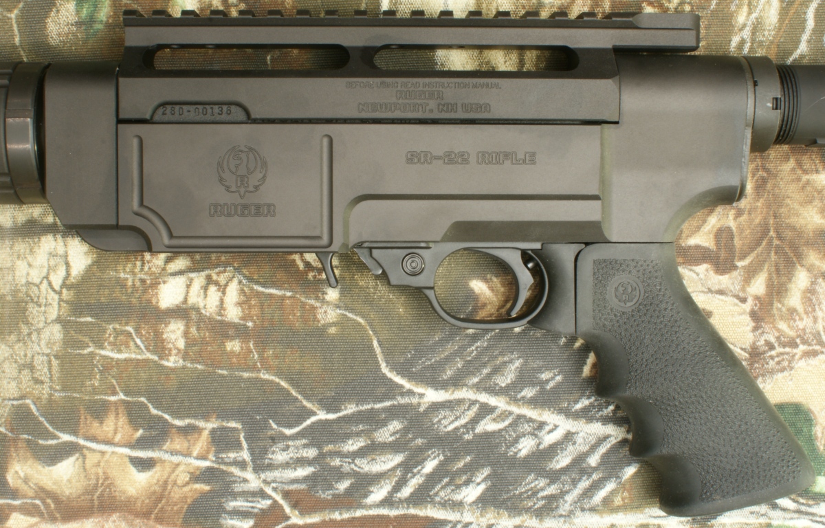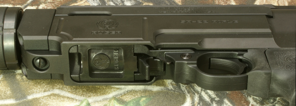 The receiver of this rifle has a unique look. It is a combination of AR-styling along with a compact rugged look that gives an impression of compact durability. Basically, Ruger took a 10/22 receiver and put it inside an all aluminum chassis that is manufactured by Nordic Components, Inc.™. The chassis is made up of three primary pieces; main body (kind of like the lower receiver), scope mount base, and forearm adapter. If you go to the Nordic website, you can see that it is possible to turn any Ruger 10/22 into a tactical version like the SR-22 by purchasing the conversion parts from Nordic. In the photo above and the one below, you can see portions of the actual 10/22 receiver inside the aluminum chassis. You can also see that it is the Ruger receiver that carries the serial number of the rifle. The scope mount base is elevated to give you the same ergonomics as that of the Ruger SR-556 and other AR-style rifles on the market. The scope mount base is a 17 slot Picatinny rail measuring 8.00". From the bottom of the receiver, you can see the standard Ruger 10/22 trigger group with cross-button safety, bolt lock, extended magazine release and the Ruger 10-shot rotary magazine. The pistol grip Ruger selected is the Hogue® Monogrip® which has a very nice feel and texture. These grips are made special for Ruger and include the Ruger symbol on both sides. To maintain the look and feel of an AR-style rifle, a rubber trigger guard filler is added between the pistol grip and trigger guard.