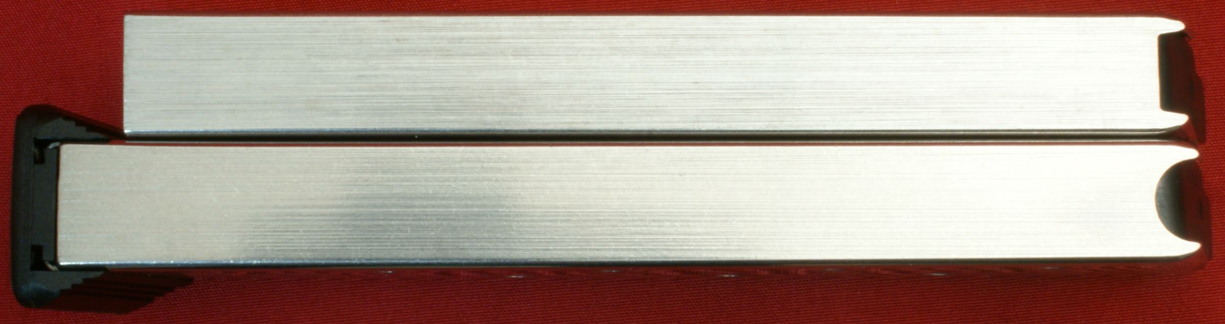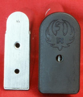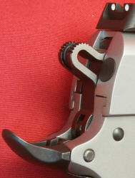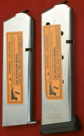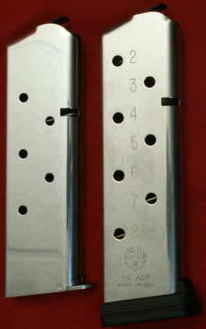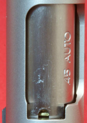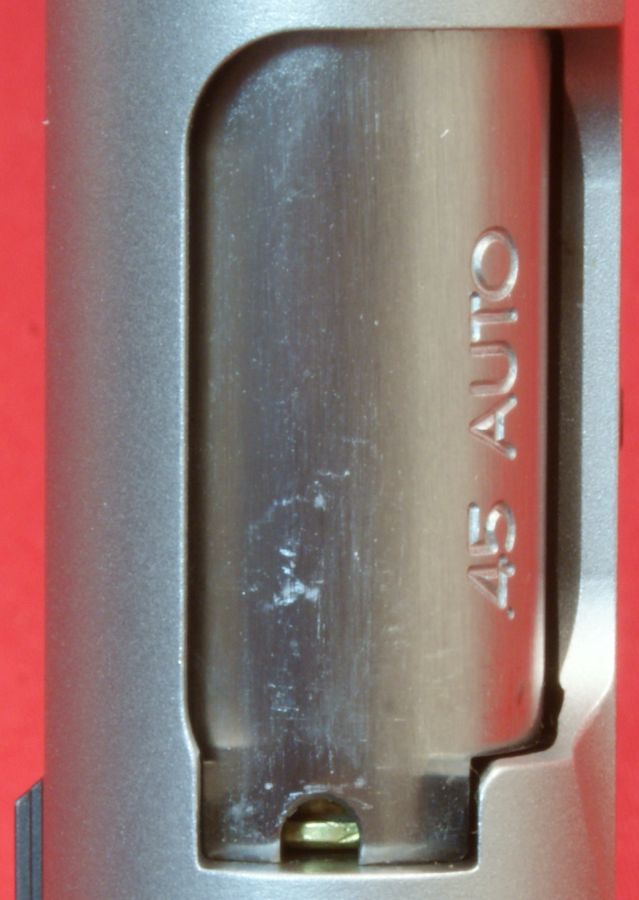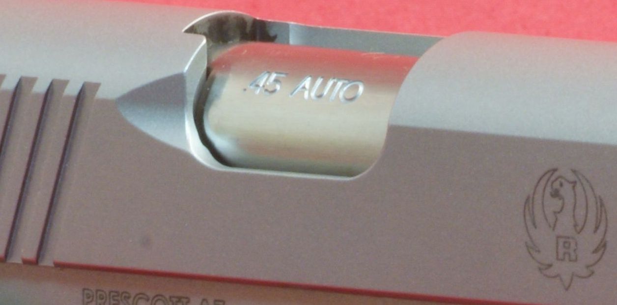 For those concerned about the lack of a firing pin safety, Ruger included a titanium firing pin and heavy firing pin spring. This design is such that the reduced mass of the firing pin and the increased spring weight prevents the firing pin from making contact with a cartridge if the pistol were dropped on it's muzzle. These next four photos show some isometric type views of the Ruger SR1911 Pistol. The combination of the low glare stainless steel finish, the black accents on the sights, beaver tail, thumb safety, slide stop & magazine catch, and the wood grips makes for an attractive pistol (my opinion). The Ruger SR1911 measured about 1.35" in width across the widest point which is from the right side grip to the left side thumb safety. The SR1911 measured 5.45" in height with no magazine installed and 8.65" in length. The right side includes the Ruger eagle logo, "PRESCOTT AZ", the "RUGER" name, model number "SR1911" and serial number. The barrel length measured about 5.05". The bottom of the frame has the warning "READ INSTRUCTION MANUAL BEFORE USING FIREARM". It was kind of Ruger to put this warning in a very non obvious location. The left side of the slide is marked with "RUGER" and "MADE IN USA". This particular pistol also had a white inspection dot which I removed for the remaining photos. The Ruger SR1911 Pistol with magazine weighed in at 39.25 ounces. Starting with the front of the pistol, the SR1911 had a good barrel "bushing to slide" and "barrel bushing to barrel" fit. There was enough looseness to allow the pistol to function properly, yet when the barrel was locked up, I couldn't detect any movement of the barrel with respect to the slide on bushing end. I also checked this with the recoil spring removed and could only detect a hint of movement. With the recoil spring removed, I was able to detect some vertical looseness at the rear of the barrel (chamber end) which I believe is a result of the looseness in the barrel link. This rear looseness may not be an issue as long as it locks up in the same place every time. Next I reinstalled the recoil spring and did a press test on the rear of the barrel to check for movement. I was able to measure about 0.001" of downward movement when pressing. Ultimately, range testing will give us a good idea on the significance of any looseness in this pistol. My thoughts where that this would not be an issue and range tests proved me right. The Ruger SR1911 comes with a standard white dot front sight as shown below. In this photo, also notice the stainless matte finish that covers both the slide and frame. The 5" stainless steel barrel includes a visual inspection port at the rear to see if a round is chambered. The barrel also has the caliber ".45 AUTO" prominently engraved and comes with a 6 groove 1:16" right hand twist. The SR1911 ejection port is similar to many 1911 pistols on the market today with it having a "lowered and flared" port which should assist with the ejection of the spent case from the pistol. These next two photos show the visual inspection port with and without a cartridge in the chamber. Although I like the raised bar showing that a round is chambered on some of the other Ruger SR pistols, I'm glad to see Ruger didn't go that route on their SR1911. The SR1911 comes with a Novak LoMount Carry rear sight which is adjustable in windage only. To adjust this sight, loosen the setscrew in the rear sight and adjust the sight in the direction you want your group to move on the target. These next two photos give you a good idea on the sight picture of this three dot sight system. The photo on the right shows about how much gap you have on each side of the front sight when extended at arms length. Personally, I'm a fan of the Novak sights and this is my preferred sight configuration. Also notice the fit of the slide to frame. There was a slight amount of overhang (~.013") and looseness of the slide, but overall I would say it seemed like a decent fit with the gaps between the slide and frame being uniform. These next three photos show the rounded skeletonized hammer in it's three positions which are decocked, half cocked and cocked. The skeletonized feature makes the hammer light weight and provides faster cycling (according to Ruger). From an engineering perspective, I agree it would be faster cycling, but from a practical perspective, I wonder how much. The half cocked position provides a safety in the event your thumb slips when cocking the hammer. If your thumb slipped, the hammer would only fall to the half cocked position. These next three photos should give you a good look a the back of the pistol. The black accents on the rear sight, firing pin stop, ejector, extractor, hammer, thumb safety, grip safety and mainspring housing are a nice touch. You can see that the thumb safety is right hand only. The grip safety has a ridged speed bump and the mainspring housing has a textured checkered pattern on the backstrap surface. During my examinations of the SR1911 pistol, the only manufacturing issue I found was that the recessed area for the Ruger logo in the wood grips on the right side was recessed more that it should have been. In the right photo below you can see how the logo is tilted in the wood grip compared to that on the left side. The SR1911 comes with a set of checkered Rosewood grip panels with the Ruger logo inlayed into the center of the grip. As mentioned already, the pistol includes a steel extended beavertail grip safety with a ridged speed bump. I view a speed bump safety as a good feature because I tend to have a high grip hold and the bump helps to ensures I disengage the safety. The trigger on the Ruger SR1911 is a light weight aluminum skeletonized trigger with an adjustable over-travel stop. The trigger pull on this pistol measured an average of 5.25 pounds based on ten pulls from a Lyman digital trigger pull scale. The SR1911 has an extended manual thumb safety. These next two photos show the safety i