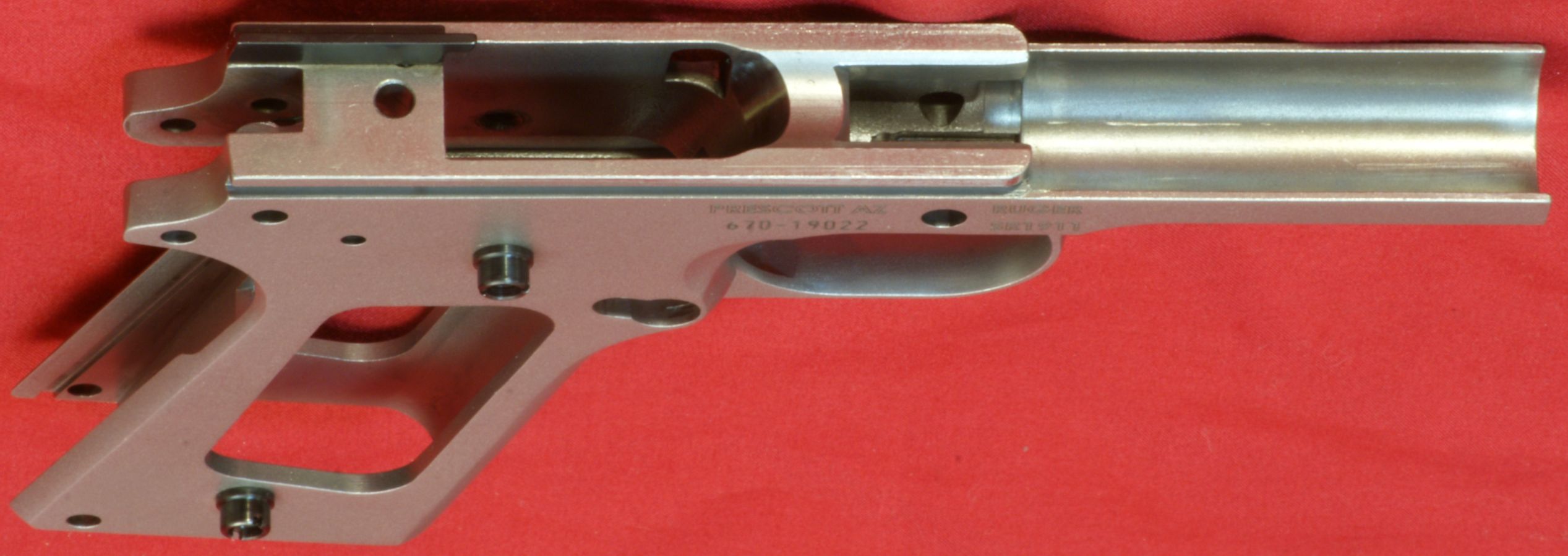 Frame The frame is a stainless steel investment casting that is made from Ruger's proprietary blend of metal that is somewhere between 410 and 420 stainless steel and the frame is then machined to it's final dimensions. Ruger rounded all sharp edges and did a good job with the evenness of the stainless matte bead blast finish. The plunger tube is integrally molded into the frame. The Vertical Impact Surface (VIS) has a bowtie cut and it appears, by looking at the barrel lugs, that the barrel lugs are striking the surface properly. Trigger Assembly The trigger assembly is actually made up of three parts; the aluminum skeletonized trigger, steel trigger bow and over travel stop set screw. The over travel stop set screw appears to have some type of red thread locking compound to prevent the screw from working loose.