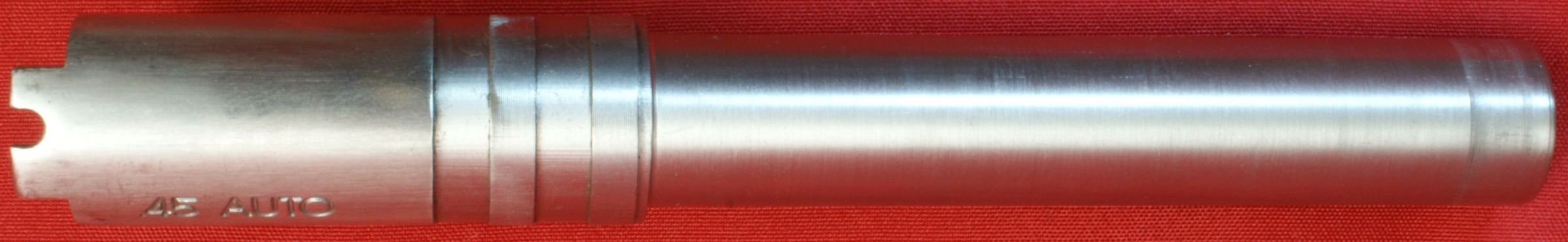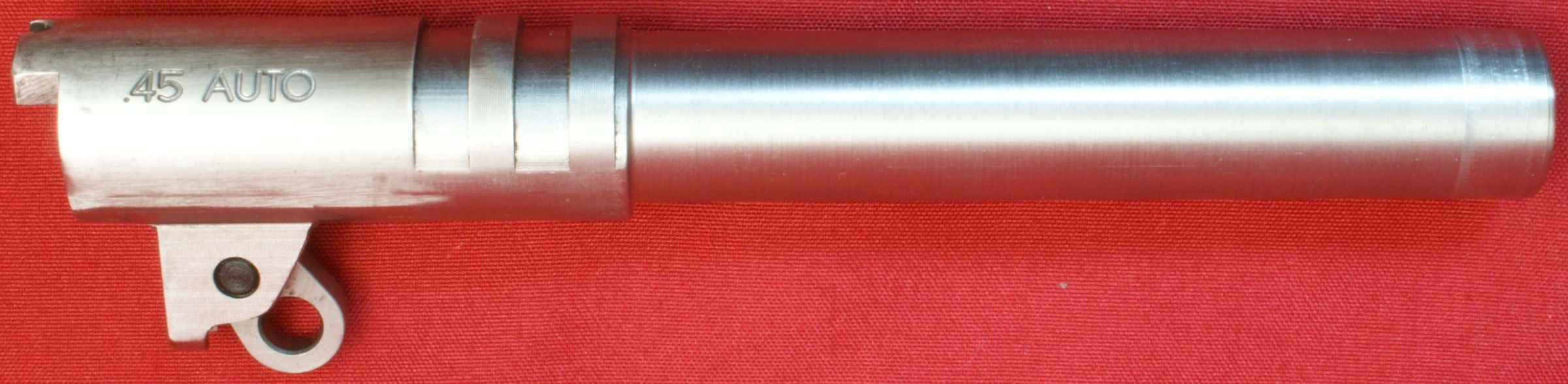 Figure 44 Grip Safety Manufactured using the MIM process. Safety Lock Manufactured using the MIM process. Grips The grips on the SR191 are Rosewood panels with a plastic Ruger logo inlay that is held in place with a short stud that is expanded on the opposite side of the wooden grips. Slide & Sights The slide is machined from 416 stainless steel bar stock and the sights are MIM parts. Although the sights are made by Novak, I believe they are made to Ruger's specifications. Firing Pin Spring Ruger states the firing pin spring to be a "heavy spring" to assist with passing a drop test. Firing Pin The titanium firing pin has an undercut area on the rear end to assist with the weight reduction of the pin which is a key requirement to pass a drop test. Extractor Firing Pin Stop Barrel & Link The broached barrel is made from 410 stainless steel. The photo below shows the proof mark on the left side of the barrel lug. Using the pictures above and below, notice that the barrel appears to be properly throated with a mirror like finish. Also in the photo below on the left, you can see where the barrel lugs are making contact with the vertical impact surface (VIS) by the bowtie marks appearing on the top of the lugs. Recoil Spring Guide The recoil spring guide rod is a one-piece short solid rod made from stainless steel. Recoil Spring The recoil spring is a 18.5 pound spring weight. Recoil Spring Plug Barrel Bushing One thing that is unique about the barrel bushing is that it is machined at the same time out of the same bar stock as the barrel which is 410 stainless steel . I can see there may be an advantage to this method. While the stock material is mounted in the machine for the turning operations, they are able to turn the bushing surfaces (both inside and outside diameters) to be concentric with the outside of the barrel which in turn may allow them to hold overall tighter tolerances on the fit of these parts. Ruger then keeps the barrel and bushing together as a matched pair throughout the remainder of the pistol build. The clearance between the barrel bushing and slide measured 0.0055" and between the bushing and barrel measured 0.0035". Slide Stop Manufactured using the MIM process. The pin diameter measured 0.1965" which appears to be less than the standard 0.1985" to 2.0005". Another feature I found interesting was the flat portion on the bottom of the pin. Maybe I don't know enough about 1911's, but I don't believe it was intended by John Browning based on his drawings. Since a similar flat existed on the safety lock pin, the flats must be related to the MIM process or Ruger has something else in mind. Also notice the wear in the left photo in the area of the barrel link. The barrel link is riding the slide stop pin during lockup. I confirmed this by installing the pin hanging down and then testing the amount of force to rotate the pin when in lockup. The pin was not loose.