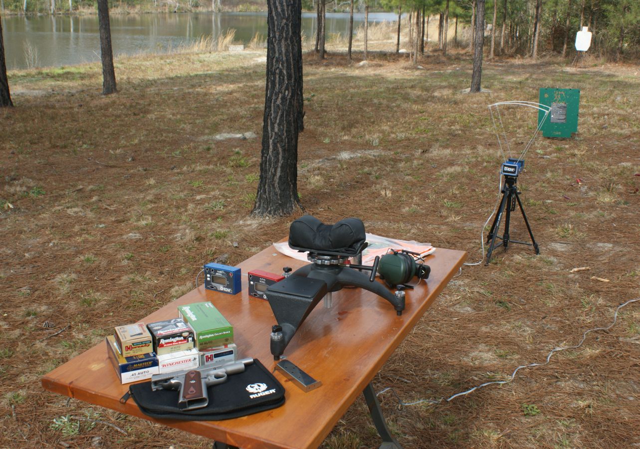 Ruger SR1911CMD Review For range testing the Ruger SR1911CMD Pistol, I wanted to evaluate basic bench accuracy, get a little chronograph data and have some fun shooting steel targets. When I started my range tests I had high hopes for this pistol because I was extremely pleased with the range results from the SR1911 Pistol. Fortunately this commander version lived up to the reputation of it's big brother. The photo below shows my setup for checking bench accuracy and getting some chronograph data.