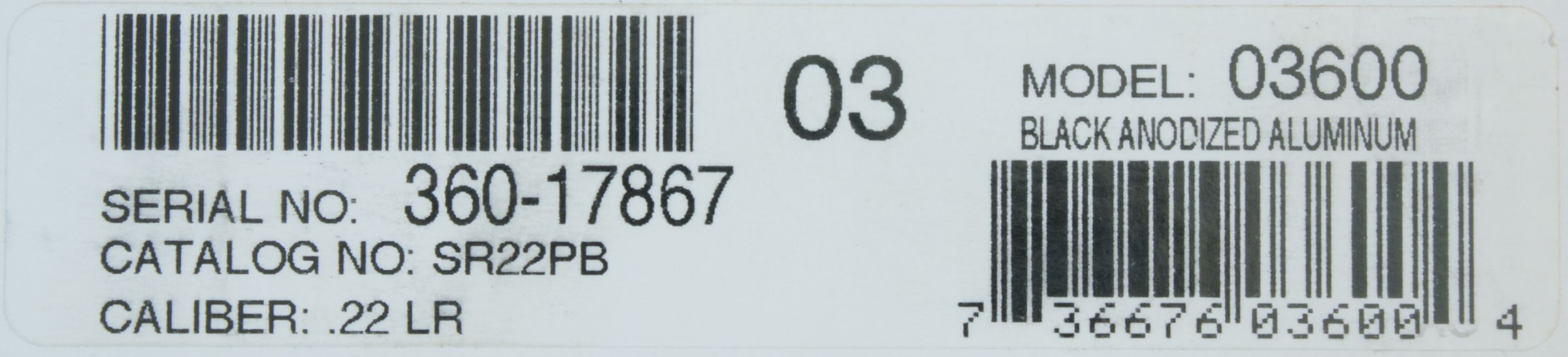 The end of the box had a sticker with all the pertinent information like Serial Number, Catalog No: SR22PB, Caliber: .22 LR, Model: 03600 and finish Black Anodized Aluminum along with other various bar codes. When you open the box, you immediately see that the pistol comes with several accessories and a soft case. The list and photo below identifies everything that was inside the box.