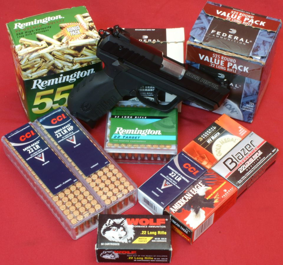 Ruger SR22 Pistol Review In my range tests of the Ruger SR22 Pistol I wanted to shoot a variety of ammunition to get a general idea on the accuracy and reliability of this pistol. The photo below gives you a glimpse of most of the different types of ammunition used in this review. The ammunition ranged in price from inexpensive bulk to more costly target ammunition. The ammunition ranged in bullet weight from 36 grain to 40 grain and bullet type from round nose to hollow point. Last, it ranged in velocity from subsonic to standard to high velocity ammunition.