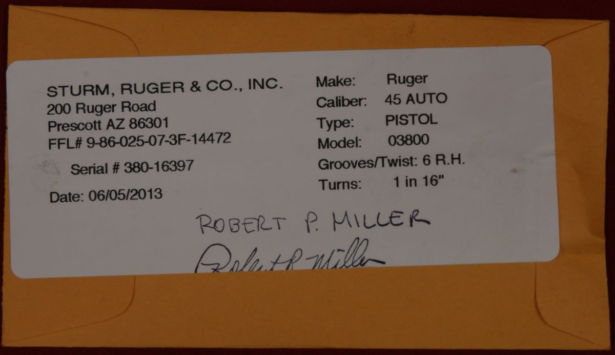 I always like to show the date on the fired case envelope and for this pistol the date is 6/5/13. This gives me an indication on when this pistol may have come off the assembly line. Based on this date, this particular SR45 should be representative of what is currently being produced by Ruger. These next photos document my "as received" condition of the SR45 pistol. Since this is a new firearm, it came in great condition like you would expect.