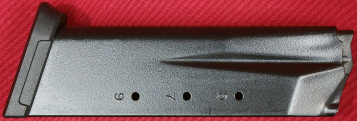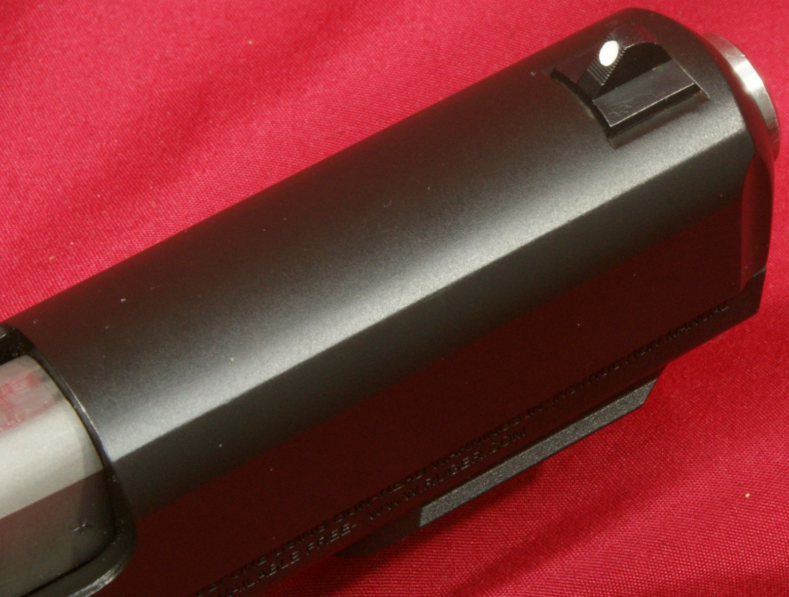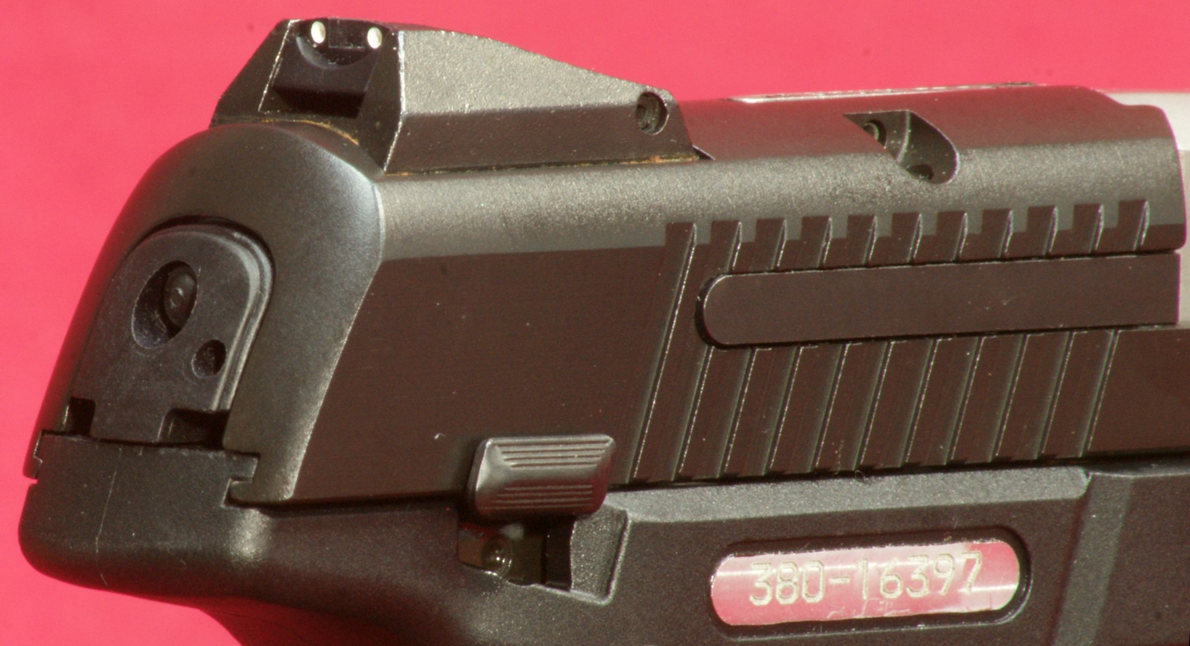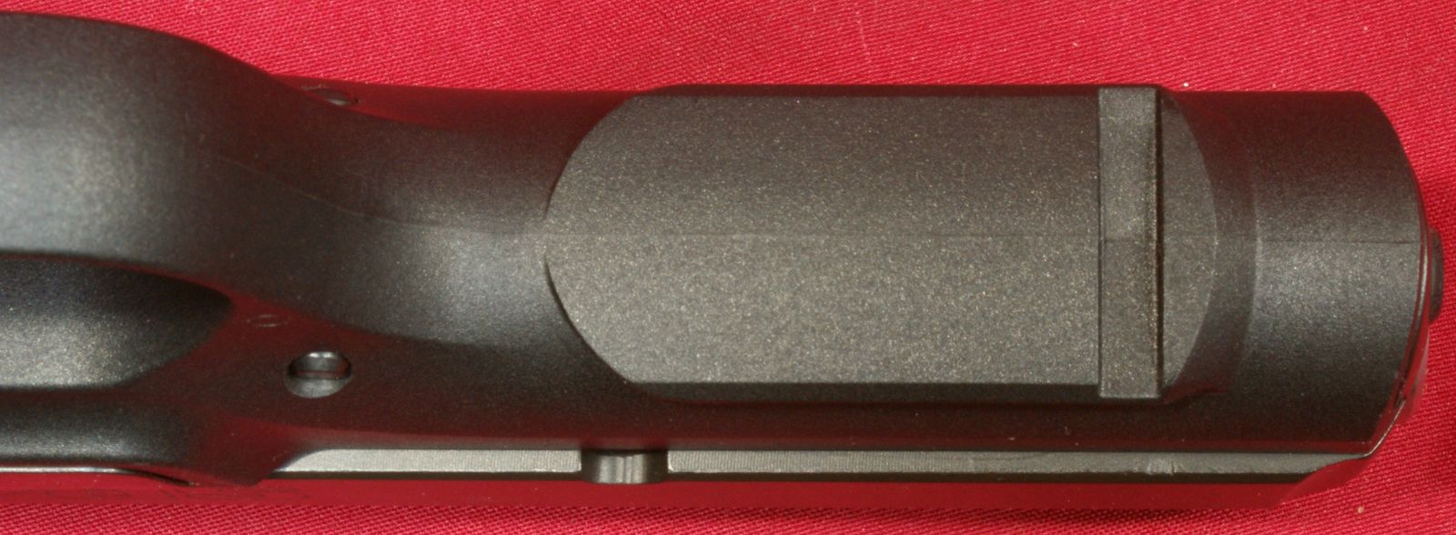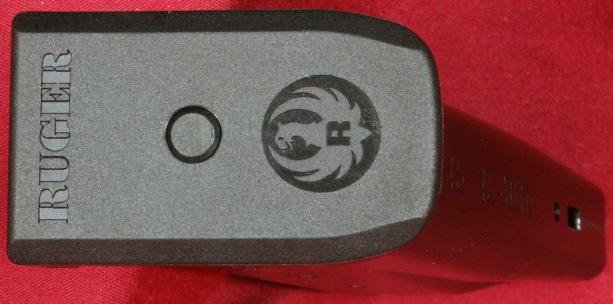 Figure 4 The width of the SR45 measured 1.26" which is basically the same as the SR9 and SR40. This is a little deceiving because this measurement is across the manual safety which represents the widest point. I feel the more important dimension is the width across the slide because this width has an impact on which holsters will fit the SR45. The width across the slide measured 1.07" on my SR45 and 0.99" on my SR9. This difference in width was enough to prevent the SR45 from fitting in my Blackhawk Serpa holster. This may or may not be an issue, but it is something you should understand if you already own a SR pistol and you were thinking about using the same holster. Since the Blackhawk holster is a rigid polymer holster, this style holster is not forgiving of larger width and other types of SR9/SR40 holsters may work for the SR45. This pistol measured 5.74" in height, has an overall length of 8.0" and a barrel length of 4.50". At the front of the slide, you can see scalloped areas on each side where the slide transitions to the thicker dimension to accommodate the .45 Auto barrel. One of the features I like about the SR series centerfire pistols is the grip's deep recess for the web of your hand which gives a beaver tail-ish feel when gripping the pistol. This allows you to keep a high grip without the fear of getting slide rash. The high grip helps to give you a low bore axis which reduces muzzle flip. Ruger uses colored dots to indicate some type of inspection step. This pistol came with a red dot which I removed after taking these photos. The SR45 weighed it at 30.7 ounces empty and 37.80 ounces with 11 rounds of Hornady Critical Defense 185 grain FTX ammunition. Just like Ruger's other SR centerfire pistols, the SR45 comes with adjustable white 3-dot sights. The front sight is dovetailed to the slide and the sight has a ramp to reduce the chances of snagging the sight when drawing your pistol. The rear sight is a Novak style sight and is adjustable for both elevation and windage. The large screws in the top center of the rear sight is used to adjust elevation and the Allen head set screws just forward of the large screw can be loosened to allow windage adjustments. At arms length, the sight picture is similar to that shown below with the front post having gaps between it and the sides of the notch in the rear sight. After taking these photos, I noticed the brown looking color at the interface of the rear sight and slide. This material wiped off easily and since Ruger tends to thoroughly lubricate their firearms prior to shipping from the factory, and because the surface did not show any signs of corrosion in these areas, I think it may be some type of anti-seize compound applied during sight installation.
