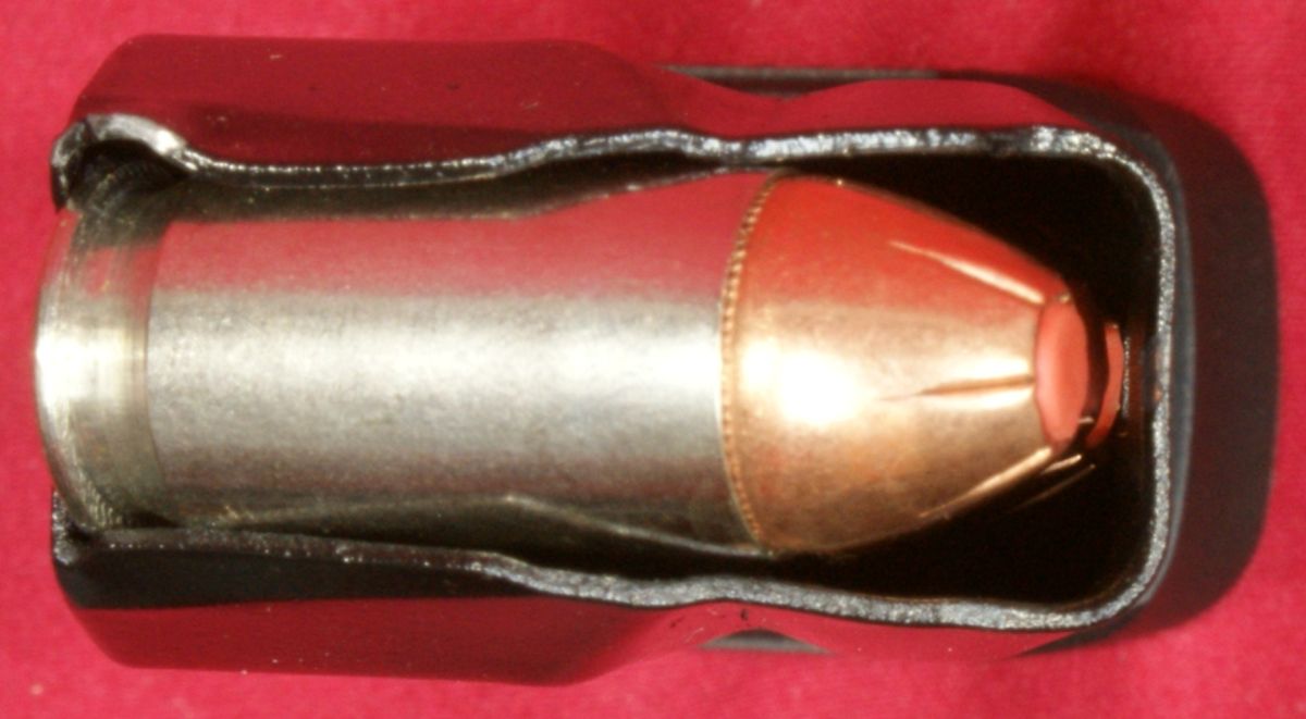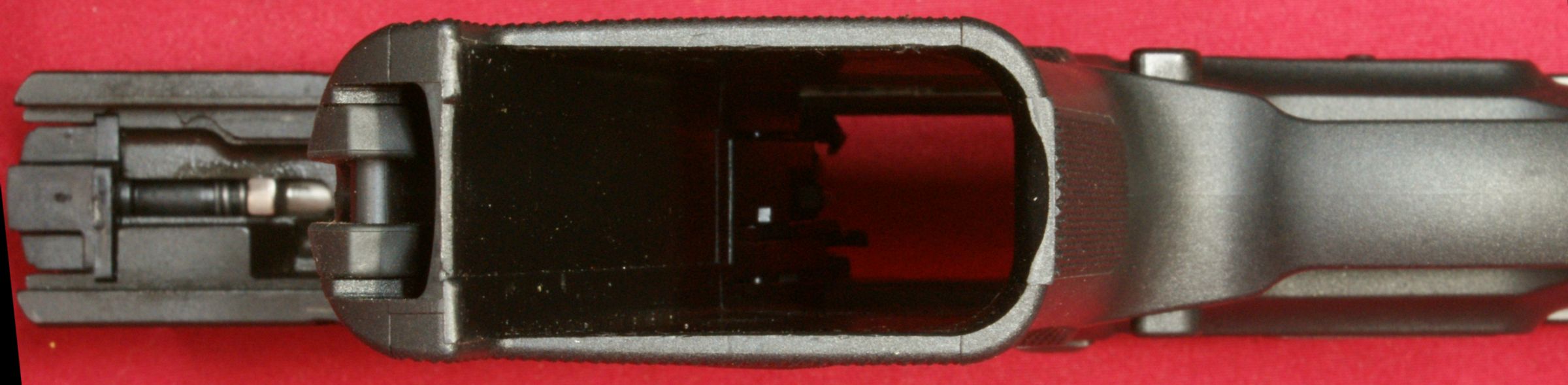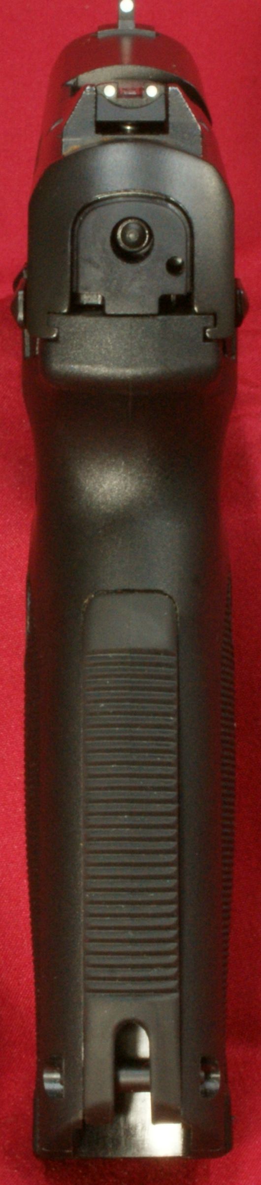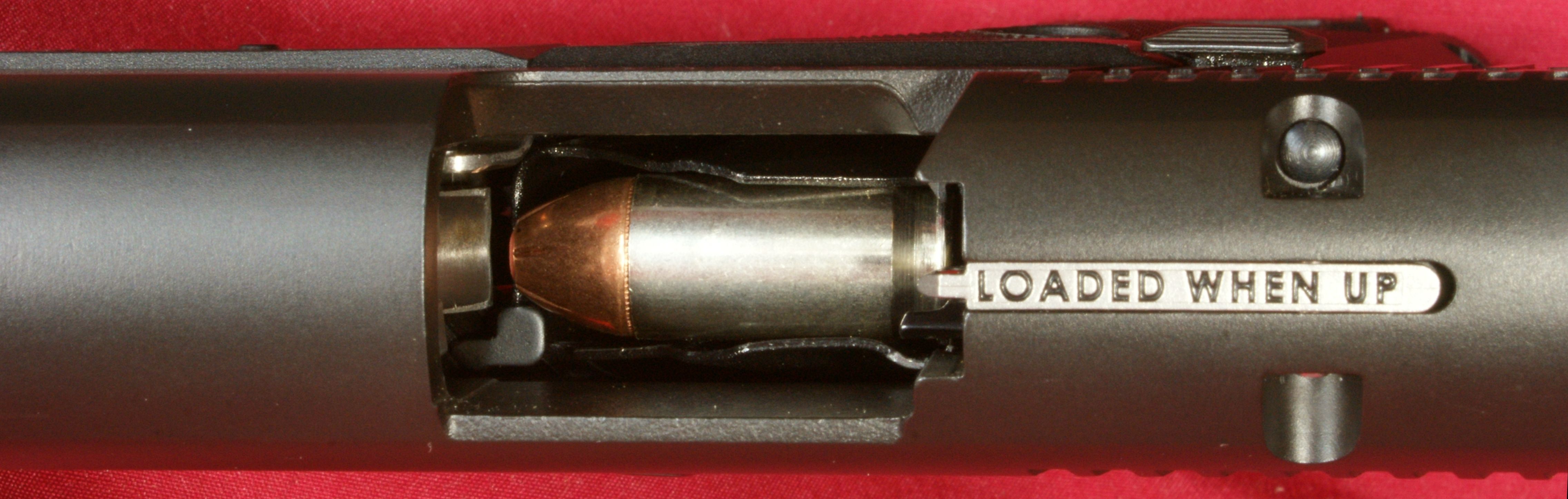 Figure 14 As stated earlier, the SR45 comes with a 4.50" stainless steel barrel. The polymer frame below the barrel has Ruger's typical warning "BEFORE USING GUN - READ WARNINGS IN INSTRUCTION MANUAL - AVAILABLE FREE - WWW.RUGER.COM". The side of the barrel is marked with the caliber "45 AUTO". Ruger states the following about the use of various types of ammunition in their SR pistols: The SR-SERIES pistols are compatible with all factory ammunition of the correct caliber loaded to U.S. Industry Standards, including high-velocity and hollow-point loads, loaded in brass, aluminum, or steel cartridge cases. No 9mm Parabellum, 40 S&W or 45 Auto ammunition manufactured in accordance with NATO, U.S., SAAMI, or CIP standards is known to be beyond the design limits or known not to function in these pistols. Although not specifically stated, I interpret all this to mean that the SR45 is capable of +P ammunition. The polymer frame has a short rail section below the barrel. This rail is approximately 1.4" in length and has a single slot. The right side of the slide is marked with Ruger's logo and "RUGER PRESCOTT, AZ USA". On the right side, you can also see the the SR45 has an ambidextrous manual safety and magazine release button. The trigger pull on this pistol averaged 6.4 pounds based on ten pulls from a Lyman digital trigger pull gage. This compared very closely to the trigger pull on my SR9 which measured 6.3 pounds. The trigger includes a trigger safety (external) that prevents the trigger from being pulled unless your finger is pressing on the front of the trigger and a firing pin block (internal) which blocks the firing pin preventing it from moving forward to contact a primer unless the trigger is pulled. The trigger guard is advertised as an oversized trigger guard. I compared the guard against some of my other pistols and the guard may be slightly longer forward of the trigger than the average pistol, but not by much. These next two photos show the trigger in the fully forward and fully rearward position. This difference measures as about 0.30" of trigger travel at the tip of the trigger. In these next two photos you can see the ambidextrous manual safety in the up "safe" position and in the down "fire" position which is indicated by the red dot on the slide. Although I can easily manipulate the manual safety with the side of my thumb, I would consider the safety to be small in size. Also notice that the first photo below shows the firing pin (striker) cocked and the second photo is with the firing pin released. The SR45 comes with a reversible rubber backstrap. In the photos shown, the backstrap is shown in its bulging configuration. With the backstrap reversed, it has no bulge and only produces a flat rubber textured ribbed area. The backstrap can be removed by pressing out the pin with a paper clip or small punch. The backstrap is removed by pushing it towards the bottom of the grip. The backstrap is all rubber and has s steel bushing (not visible) in the lower slotted area. If you have smaller hands, I would expect the low profile configuration to be the one for you. The grip on the SR45 has checkering on both sides and the front of the polymer frame. Just below the trigger guard, the girth of the grip measured 5 1/2". This is about 1/8" larger than that of my SR9. It seems that the grip length (front to back) is slightly longer on the SR45. The controls located on the left side of the pistol are the manual safety, slide stop, magazine latch and the takedown pin. The left side of the slide is boldly etched with the model name "SR45". The left side of the frame has the RUGER name and logo molded into the grip. The left side of the pistol has colored markings that help indicate the state of the manual safety with the white being visible indicating "Safe" and red visible indicating "Fire". When the slide stop is engaged with the slide open, you cannot easily press down on the slide stop to release the slide. The thought is that you take your other hand and pull the slide back to release the slide during a magazine swap. Over time, this will most likely break in just like it has done on my other SR pistols. Yet, you should still train yourself to release the slide with the opposite hand because under stress your fine motor skills will reduce the ability to drop the slide with your shooting hand. This next photo shows a round in the magazine ready to be loaded into the chamber. This photo gives you a good idea on how the loaded chamber indicator "LOADED WHEN UP" will be pushed up by the rear of the cartridge case. When the chamber is not loaded, the upper surface of the indicator is flush with the upper surface of the slide. When a round is in the chamber, the front of the indicator pivots up as shown below. This provides both a visual and tactile indication that the chamber is loaded. Each person has their preferences on loaded chamber indicators and I am in favor of this style on the Ruger SR pistols. I take new shooters to the range on a regular basis and this clear method of indicating a loaded chamber is good for them and great for me while I'm trying to keep an eye on them. Even though there is no barrel bushing like you would have on a 1911 style pistol, there was still no freeplay between the barrel and slide while the slide was fully forward with the barrel against the breech face. The only area of looseness I found was between the slide and the frame and you can see this in the photo below at the front of the slide. The recoil spring pushes this looseness up so that the slide sits high in the frame, but if I grab the front of the frame and slide, the two parts can be pushed closer together by about 0.034". When the slide is pulled back, you see the stainless steel barrel cams down at the rear and the front tilts up. This next photo gives you a look at the breech face and you can also see the extractor, ejector and how the loaded chamber indicator which is pushed up when a roun
